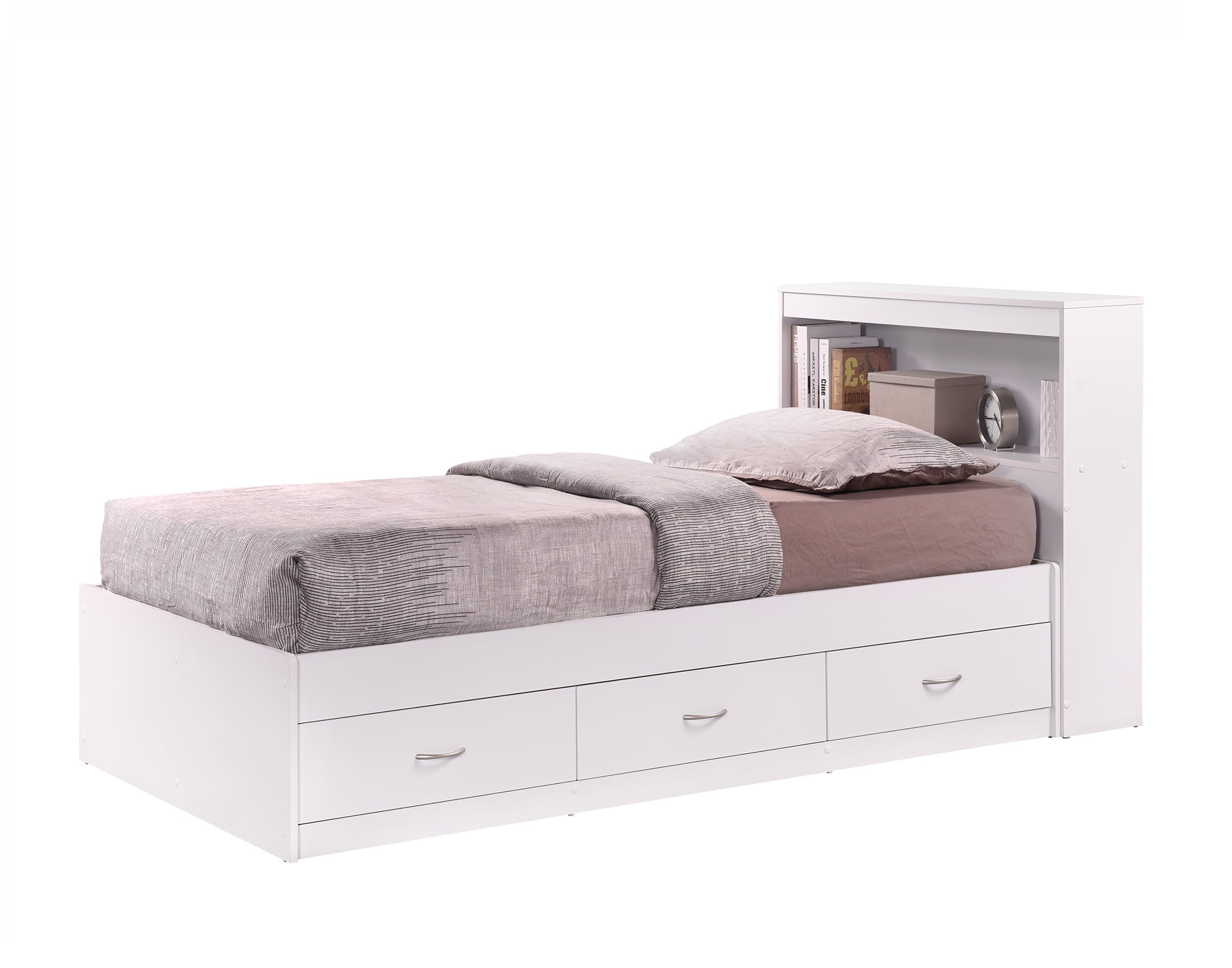 The Hodedah Twin-Size Captain Bed is a space-saving, modernly, fashionable way to outfit your bedroom with ample storage. Featuring three spacious pull-out drawers that offers lots of storage room. The bonus headboard features a shelve for placing books, iPad, phones and all those handy gadgets. Constructed of engineered wood this solid platform bed is sure to last. We have laminated this piece in a variety of finishes, you can be sure to find the perfect color to blend with your room decor.