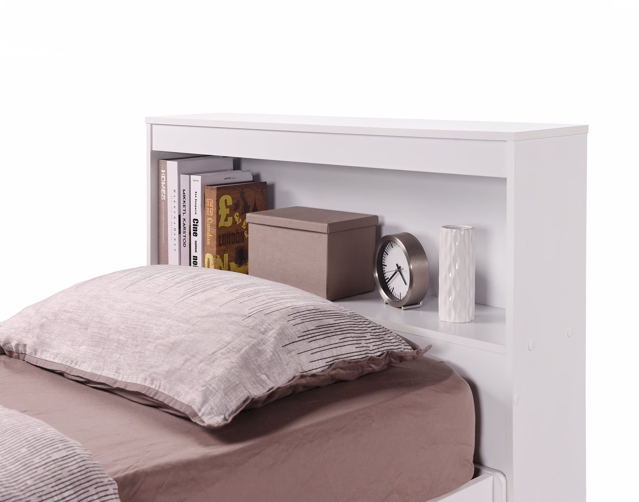 Complete bed plus bookcase headboard to store all those frequently used items No box spring is necessary, just top with a twin-size mattress and you’re ready for bed Constructed of durable wood and engineered wood Metal roller glides and built-in safety stop on drawers The bed can be used with or without the headboard, and drawers can be assembled on either the left or right side Available in a variety of finishes: Beech, Cherry, Mahogany, Black, Pink, and White. Choose the one that matches your room décor