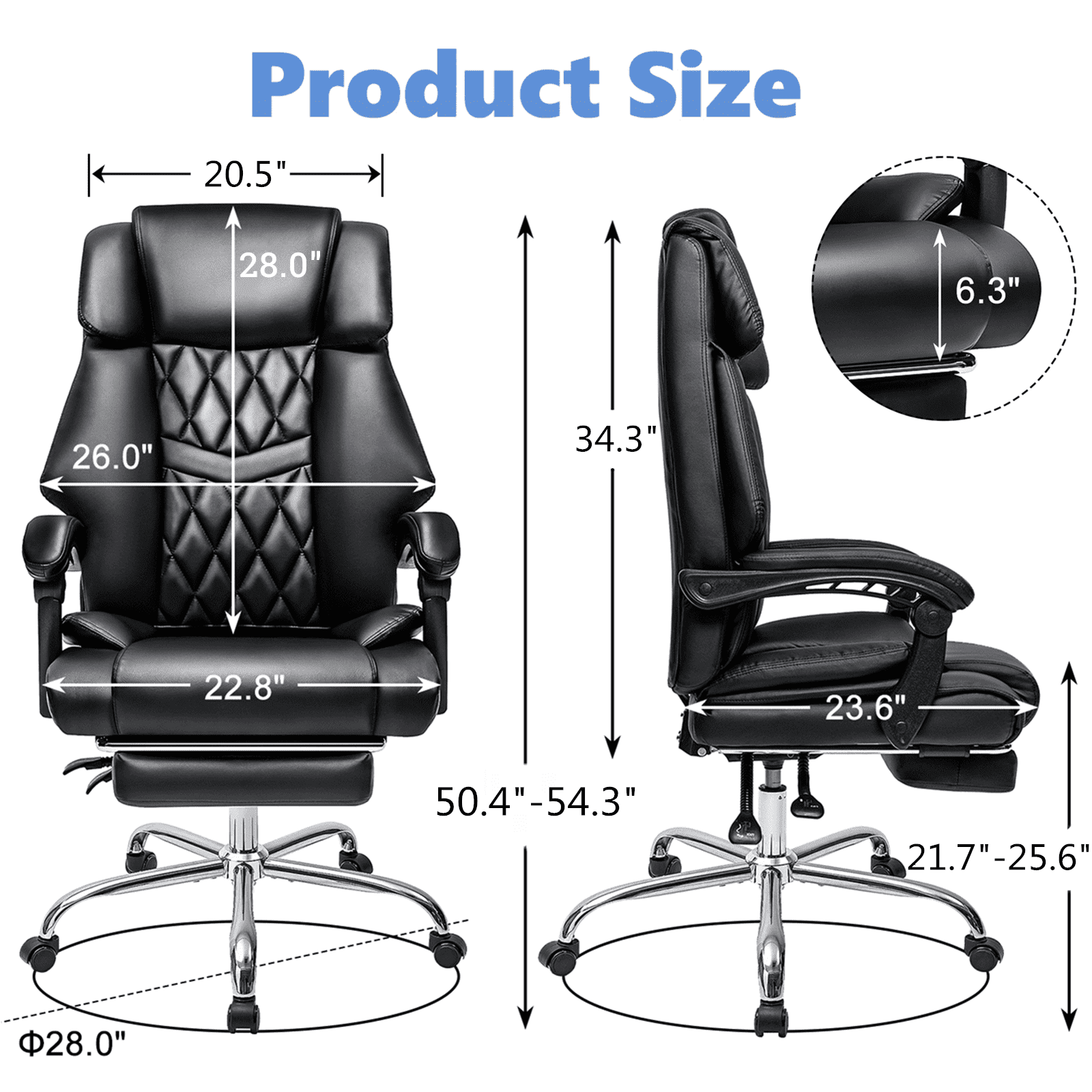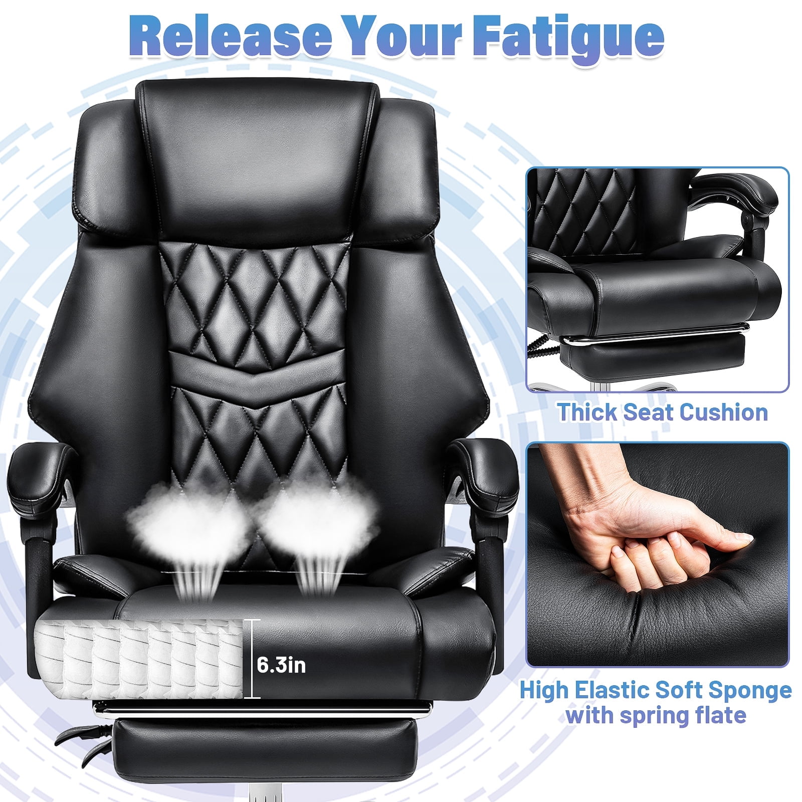 Durable and Comfortable The executive chair is perfect for big and tall body types, with extra wide seat of 24″ Depth and a maximum weight capacity of 550 lbs. With a stable metal base, a heavy duty gas cylinder and 360° smooth-rolling wheels, our work chair is flexible and made to long-lasting. Upgrade Ergonomic Chair For Relieve Fatigue Features ergonomic curved high back, our desk chair will supports your whole body, reduce your back and vertebrae pain during long hours work. With built-in lumbar support, padded linkage armrest and thick cushion seat, our computer chair keeps your spine in a neutral and healthy posture. Adjustable Height With Armrest Our task chair offers various adjustable features to accommodate different body types and preferences. You can easily customize the seat height from 22 inch to 26 inch and tilt the chair between 90 and 155 degree. Also, you can pull out the footrest under the chair as a reclining chair for relax and nap. High Quality and Stylish The black chair is made of soft, breathable PU leather that prevents sweating, ensuring durability and longevity. Its sturdy metal construction can withstand daily use for an extended period. A stylish and modern appearance adds a touch of elegance to home office or workspace, which is a good gift for office workers, friends and game players. High Quality and Stylish The black chair is made of soft, breathable PU leather that prevents sweating, ensuring durability and longevity. Its sturdy metal construction can withstand daily use for an extended period. A stylish and modern appearance adds a touch of elegance to home office or workspace, which is a good gift for office workers, friends and game players. Easy to Assemble All office parts are marked with a letter or number, you can follow instruction steps and easily found out which parts should be used. Some screws are pre-installed in back and seat for faster assembly. Estimated time is about 10-30mins.