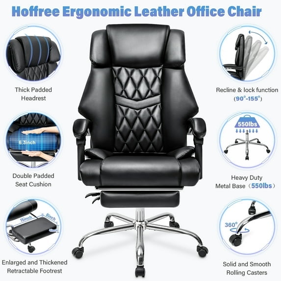 Hoffree 3 PCS Executive Office Chair Big and Tall Office Chair 550lb Wide Seat Ergonomic Computer Desk Chair High Back Leather Chair with Lumbar Back Support for Home Office Black