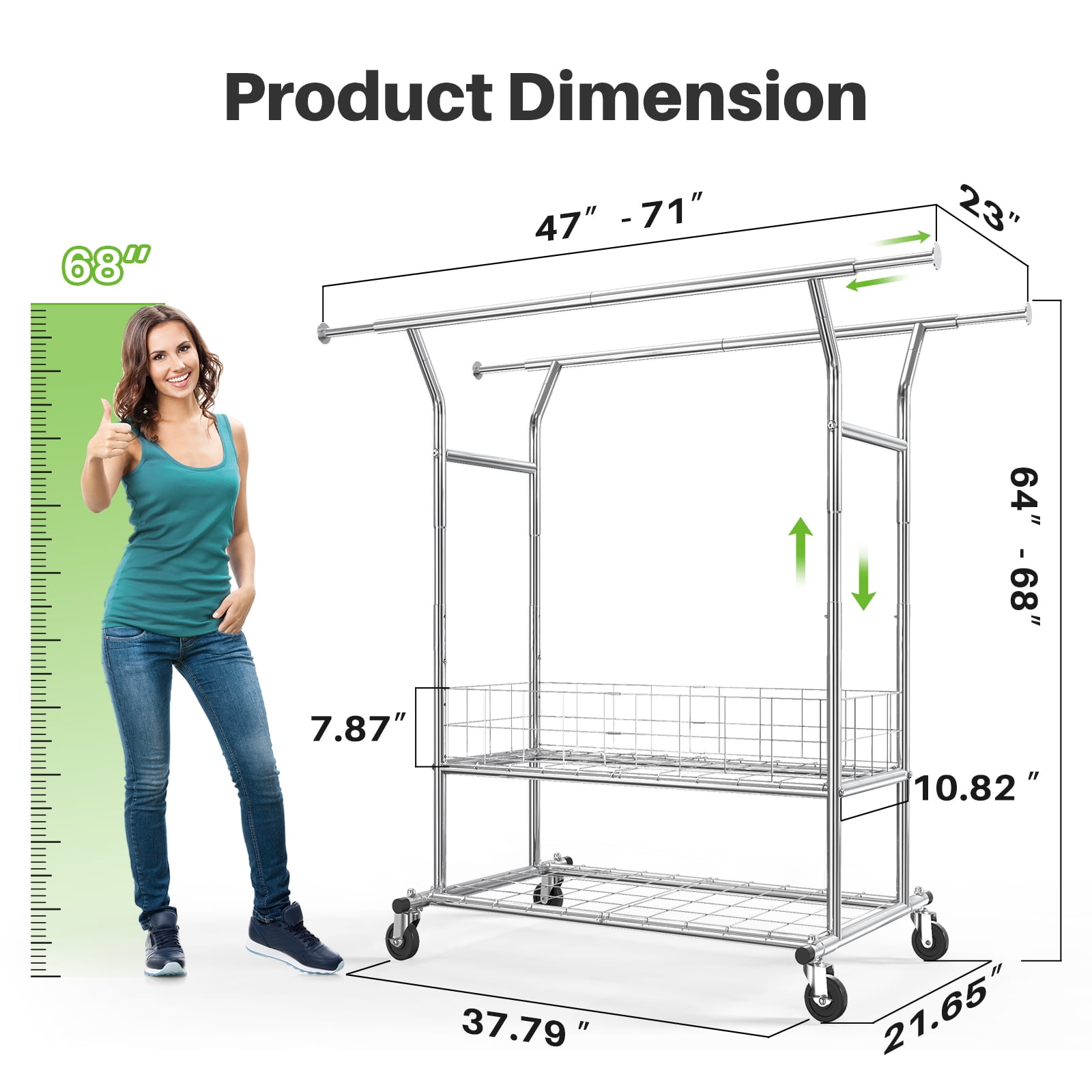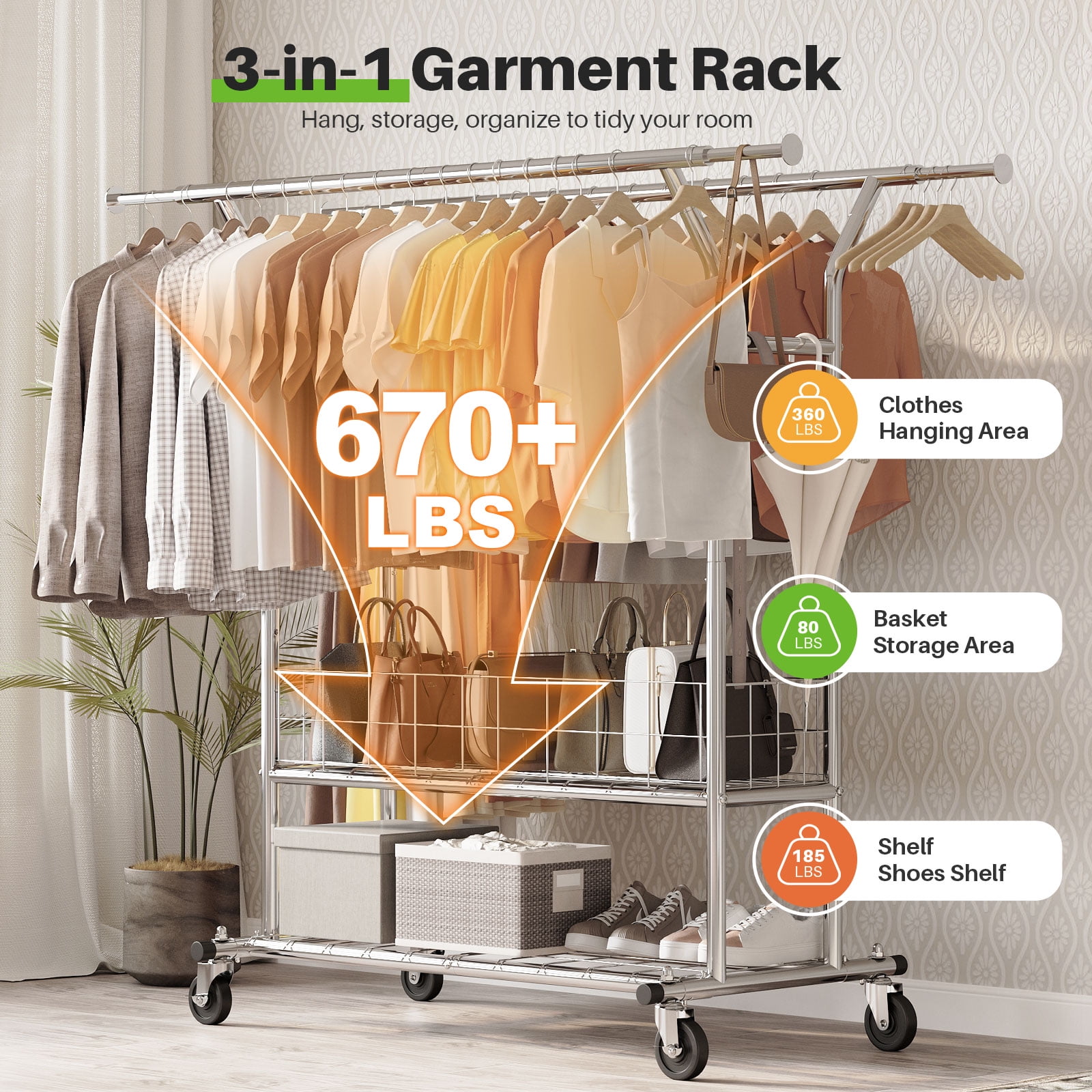 【anti Corrosion & Rust-off】HOKEEPER Freestanding Clothes Rack is Made of a Highly Resistant Metal With Durable Chrome Coating to Enhance Protection Against Water, Rust, Corrosion & Scratch. 【No Corrosion & Rust-off】- Our Freestanding clothes rack is made of high quality metal with durable chrome coating to enhance protection against water, rust, corrosion & scratch. 【Max Load Capacity 670lbs】All-steel heavy duty clothes rack is solid and sturdy to hold up to 670lbs. Hold more than 200 spring/summer clothes with organizer basket and storage shelve. It meets all your extra garment storage needs. 【Say Goodbye to Wobbly & Bending】Our 4th Generation rolling clothes rack uses special-shape (upgrade) structure for stronger support. With HOKEEPER commercial grade garment rack you can say goodbye to wobbly and bending racks. 【Mobile Clothes Rack & Stable Guarantee】4 heavy duty omnidirectional casters for clothing rack with shelves, ensure flexible movement, smoothly across any flooring. 2 lockable casters (foot operated) keep it in place when stability is needed, guarantee the safety of your family. Notice: The clothes rack for hanging clothes also works while removing the casters. 【Fit Your Space & Needs】Dimension: 47-71″ L x 21.65″ W x 64-68″ H. The extensible horizontal rods of double rail garment rack from 47″ to 71″ provides 3 times more space than ordinary single rail garment rack. Height adjustable from 64″ to 68″ accommodates short and long garments. You can adjust the length and height of rods to meet your space needs. 【3-in-1 Commercial Clothing Rack】HOKEEPER clothing racks on wheels is integrated by garment rack, free standing and dirty clothes basket and shoe racks. Great for organizing your clothing in bedroom or student dormitory, or drying clothes in laundry room, also a portable closet shelves in a boutique, showroom, retail store or flea market.