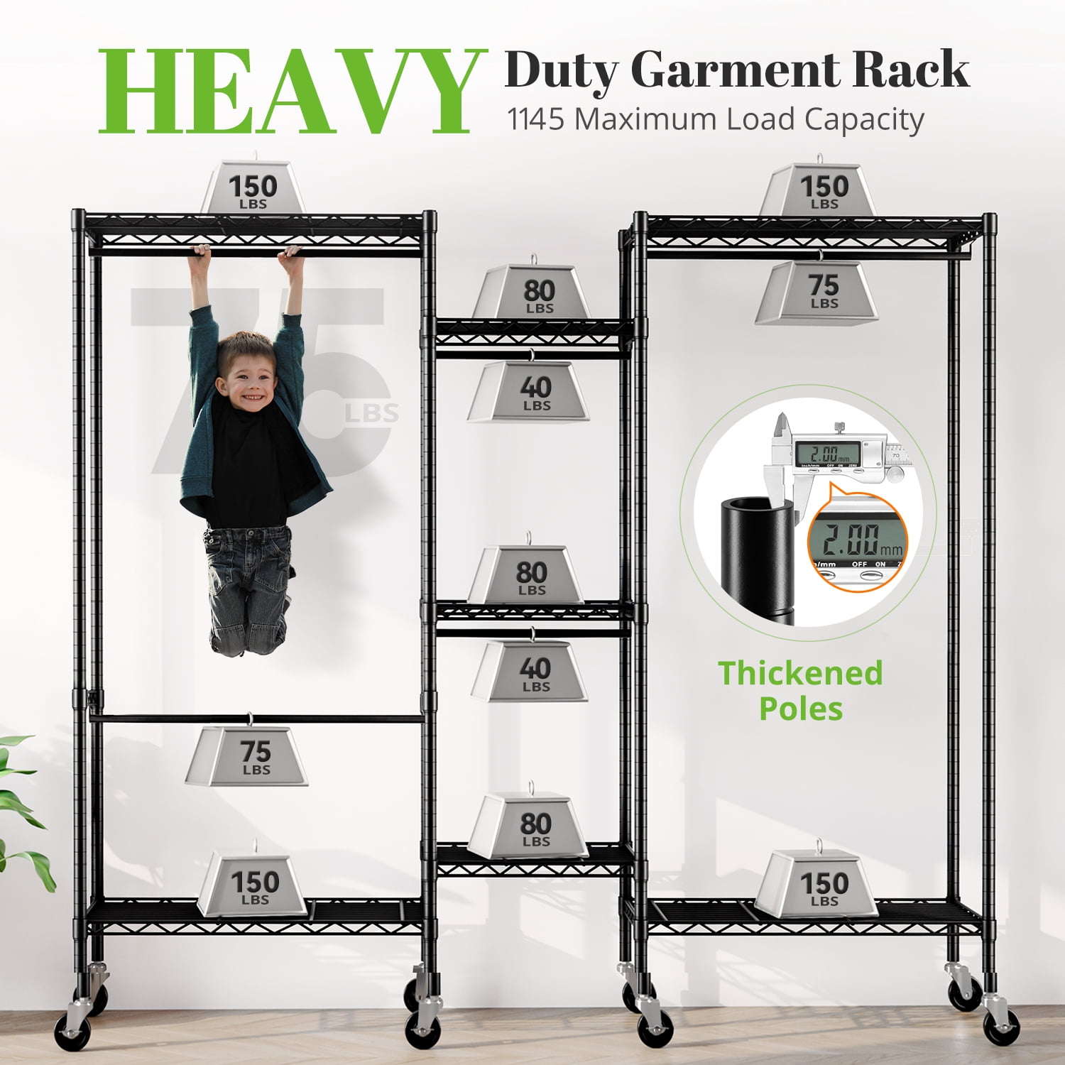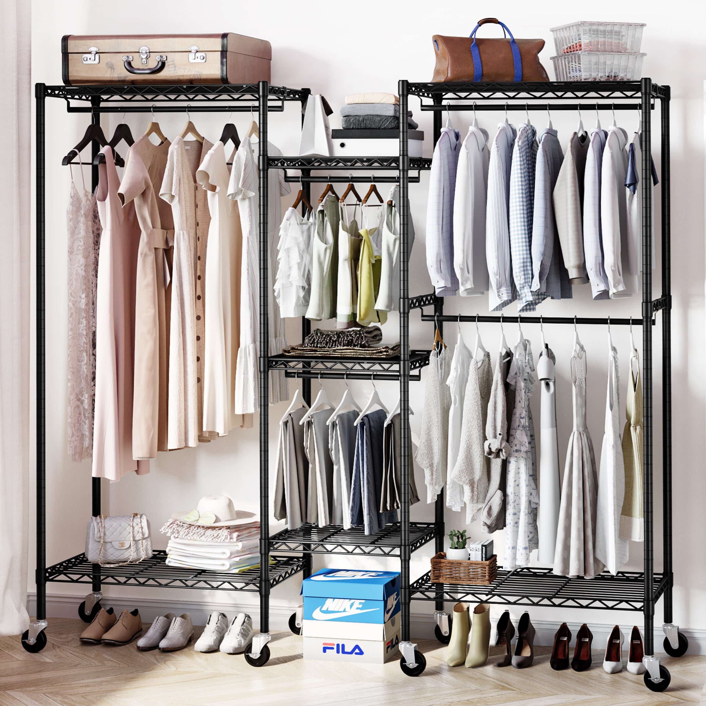 HOKEEPER Heavy Duty Rolling Wire Garment Rack with Rubber Wheels, Metal Clothing Rack for Hanging Clothes Freestanding Closet Organizer Portable Clothes Rack Wardrobe with 7 Shelves & 5 Hanging Rods