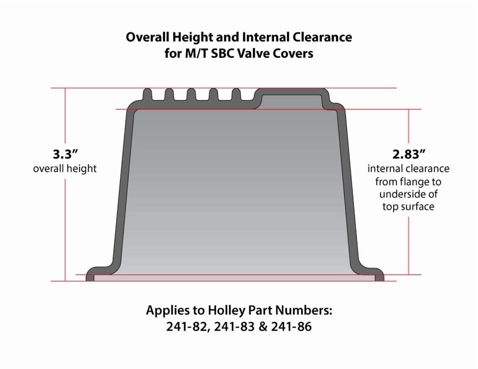 Vintage-style finned, cast aluminum; Flashback – 1972: Nothing was cooler than sporting around town in a hot rod with a Holley Double Pumper® and M/T® finned aluminum valve covers! Show everyone how cool you are and show up sporting those same parts today! ‘For the custom engine, M/T offers a superior valve cover of polished aluminum for added cooling. Each die-cast cover is precision manufactured with knock-out plugs for stock PCV (smog Control) and oil fill installations. The M/T polished top cover surface may be used for engraving your name horizontally, next to the deep heat dissipating fins.’ – Text from 1972 Holley – M/T Performance Parts Catalog. Other historic literature stated that you could expect reduced valve train noise from these cast M/T covers. We’ve also brought them back in the Satin Black finish that Holley & M/T helped make popular! Get a set today and get back your hot rodding groove!;