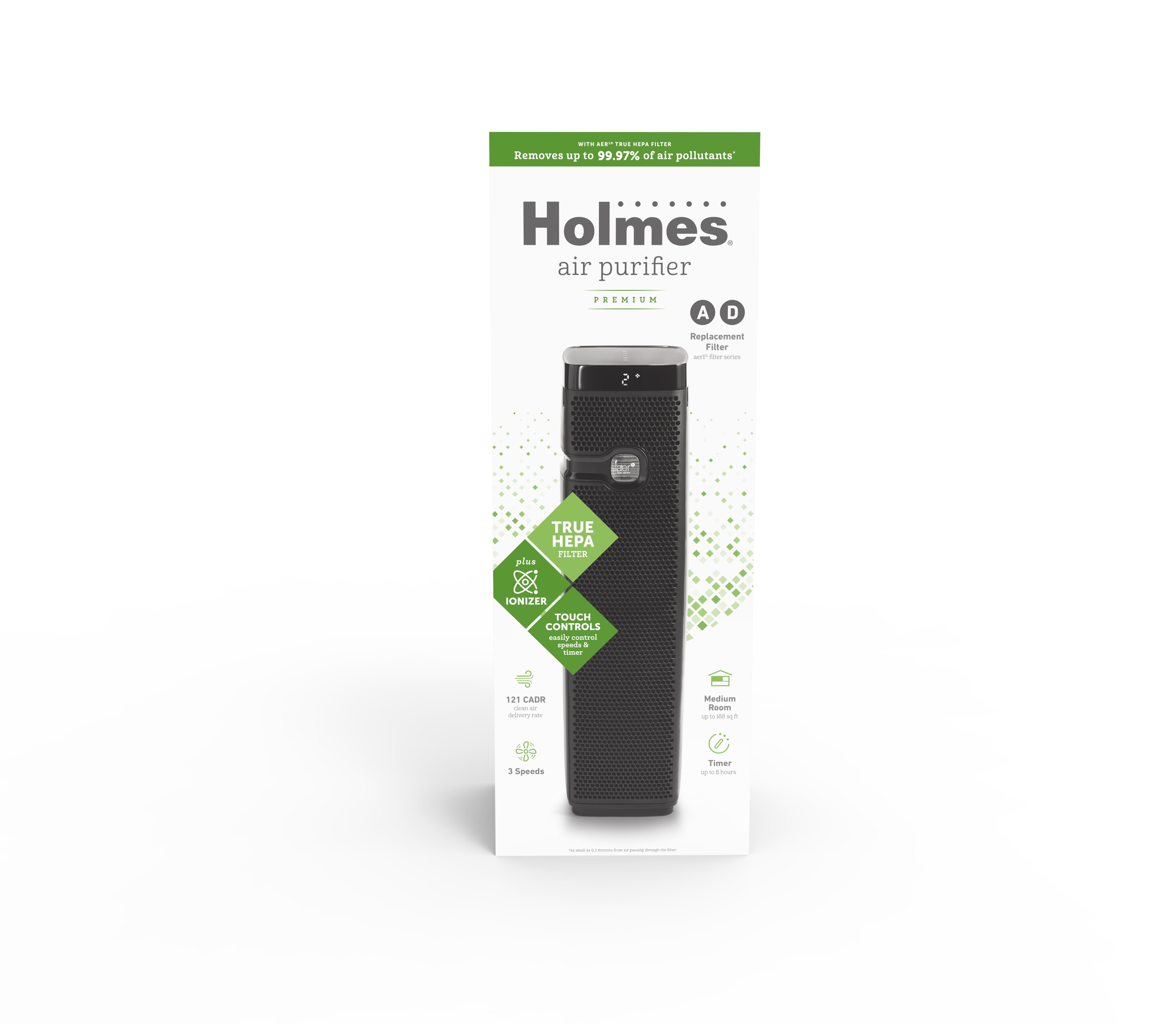 The Holmes Aer1 True HEPA Air Purifier Tower space-saving design easily fits in any corner of the room, leaving clean and crisp air all around your home. The 3-layers of filtration work to remove pollen, dust, mold, pet dander, and smoke from any medium room up to 188 square ft. The filtration begins with with a pre-filter that captures large particles such as pet hair and dust bunnies. The air then passes through the Aer1 True HEPA filter capturing particles as small as 0.3 microns to remove up to 99.97% of airborne particles. And lastly, the optional ionizer helps to bind smaller particles to form larger particles that are more easily captured. The capacitive touch control panel lets you easily control the air purifier settings – from 3 speeds to 8 hour timer. The Holmes Aer1 True HEPA Air Purifier also features a Filter Reminder Light which combined with the V-Pure Window lets you check the progress of your filter life in real time.