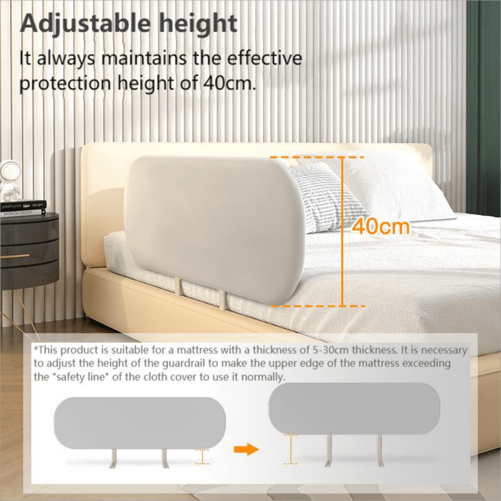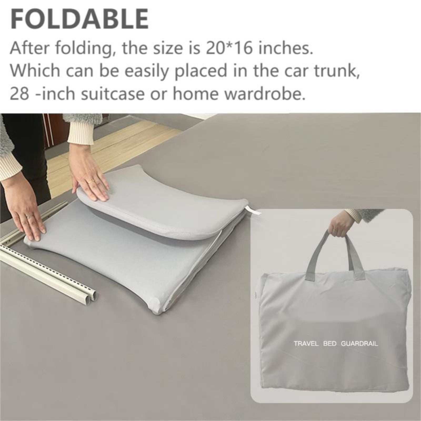 Safe and Convenient: The bed guardrail is covered with durable fabric with high density, wear resistance, comfortable touch, not easy to tear, easy to replace and clean. Foldable Bed Guard Rail: The folded size is only 20*16 inches, which can be easily put down in the trunk of a car, a 28-inch suitcase and a home wardrobe. Fit for Most Bed: It is suitable for most beds and is suitable for mattresses with a thickness of 5-30CM. It is necessary to adjust the height of the guardrail so that the upper edge of the mattress exceeds the “safety line” of the cloth cover before it can be used normally. Easy to Install: no tools needed. Open the bed guardrail – just clip the bottom into the mattress – and clip the other side into guardrail, simple and convenient!