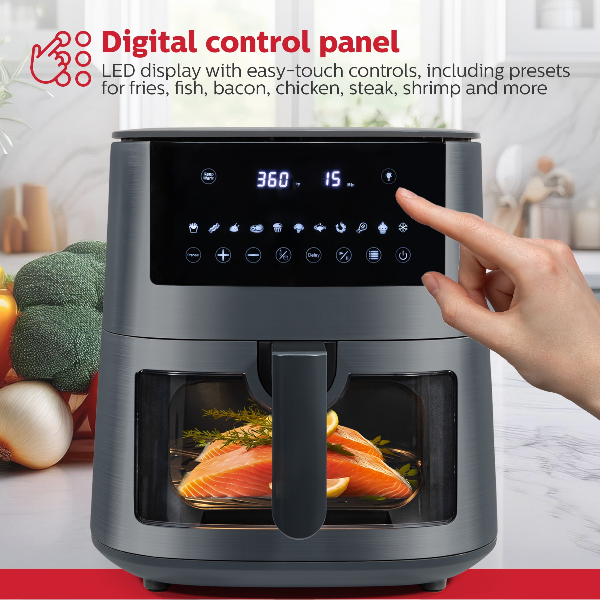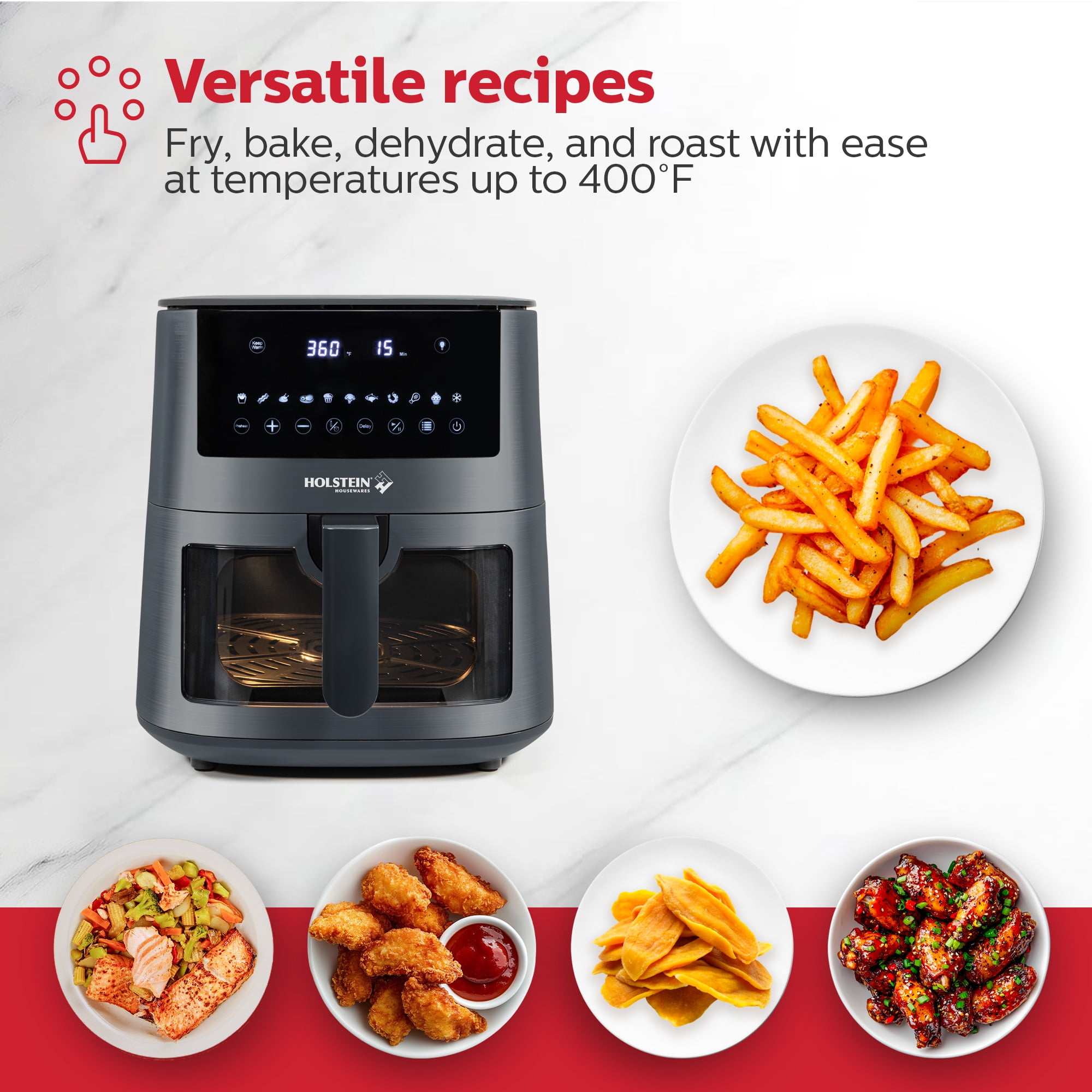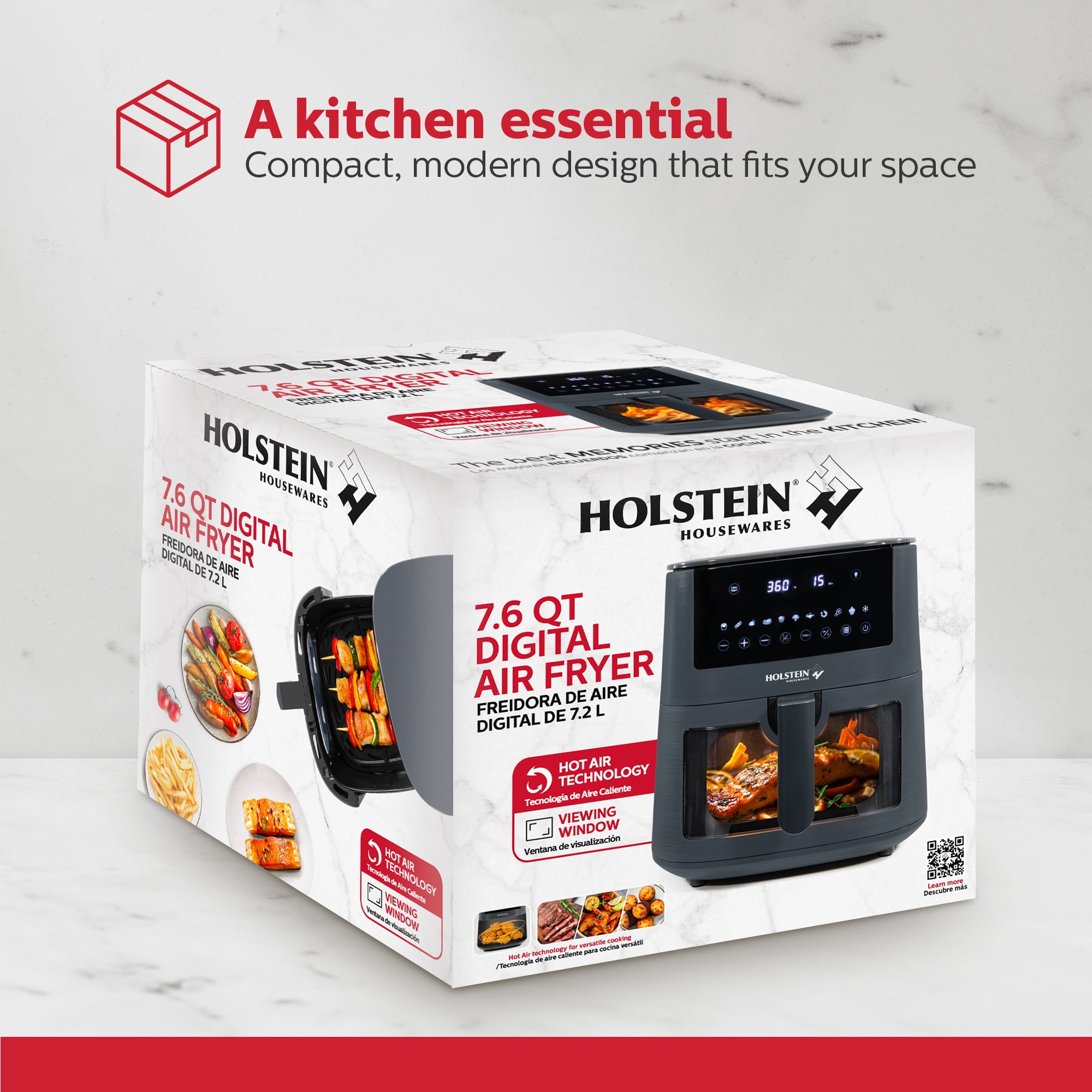 Holstein Housewares 7.6QT Digital Air Fryer with viewing window and led display with 7 preset options. Fry, bake, grill, dehydrate, and roast healthier recipes. Dishwasher Safe