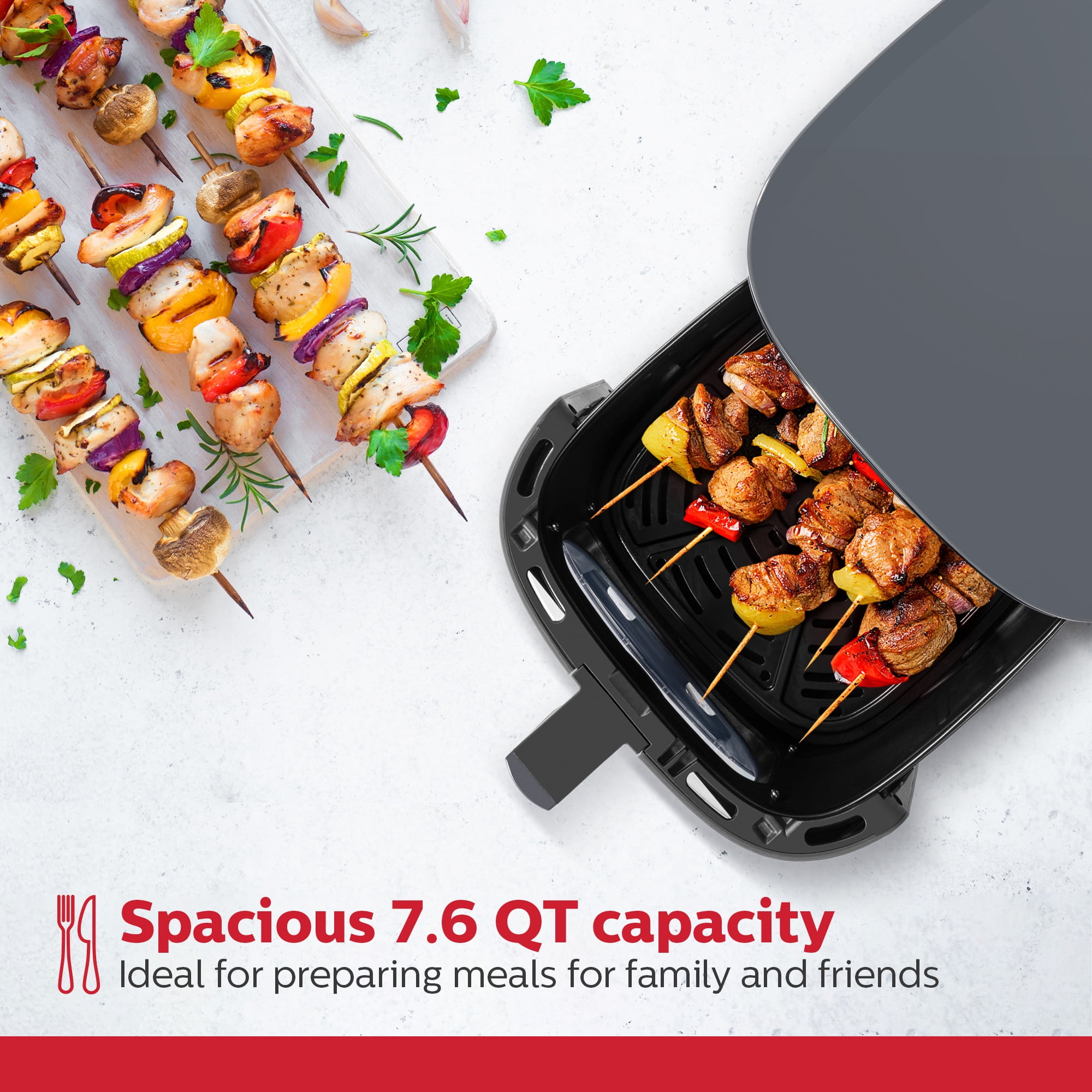 Enjoy easy monitoring of the cooking process with the viewing window Operate the air fryer with user-friendly digital touch controls and LED display Choose from 7 preset cooking options to cater to a variety of your cooking needs Convenient features include preheat, keep warm, shake, and over-heat protection Cook food quickly and with little to no oil using the air technology Removable 7.6 QT dishwasher-safe frying basket with PFOA-free non-stick coating for easy cleaning Sleek black design to complement your kitchen decor Powerful 1500 W motor for efficient and fast cooking Backed by a 180-day limited warranty from Holstein Housewares