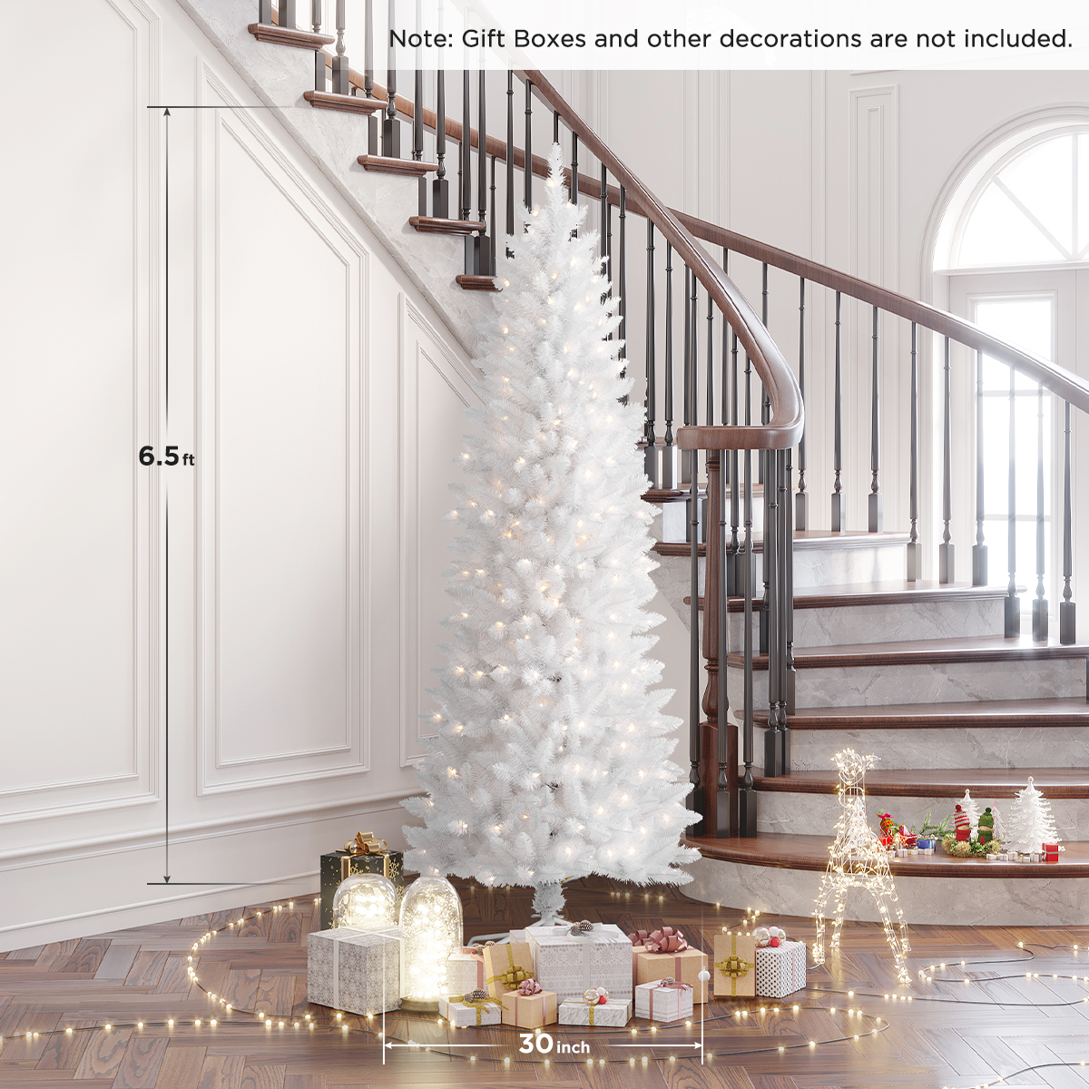 ????HOMAKER Pre Strung 280 Lights???? – With UL certified, Homaker professionally hand-strung lights are evenly spaced providing an optimal warm glow. Inspire holiday cheer in your home, office, holiday party, and more with this pencil Christmas tree. ????Realistic-Quality Foliage????- Our White foliage is modelled after real tree branches that are made up of at least 62. 5% true needle foliage for outstanding realism. So, our cost-effective traditional Christmas trees are more realistic in the artificial Christmas tree’s market. ????Pre-Decorated Design???? – Made with high-quality material, the prelit slim Christmas tree inspired by nature has thick dense foliage that happily curve upwards. Pine needle foliage with classic needle for fullness, over partially flocked 752 tips for 6. 5-foot tree. ????Distinct Unique Appearance????- Light up the tree’s partially flocked branches are featuring this charming shape pine tree, beautiful and unique, gives you the classic, natural look and hold any all of your favourite ornaments, creating an elegant silhouette. ????Easy Assembly, Easy Self-Shaping???? – Hinged branches in 3 sections for easy setup . .