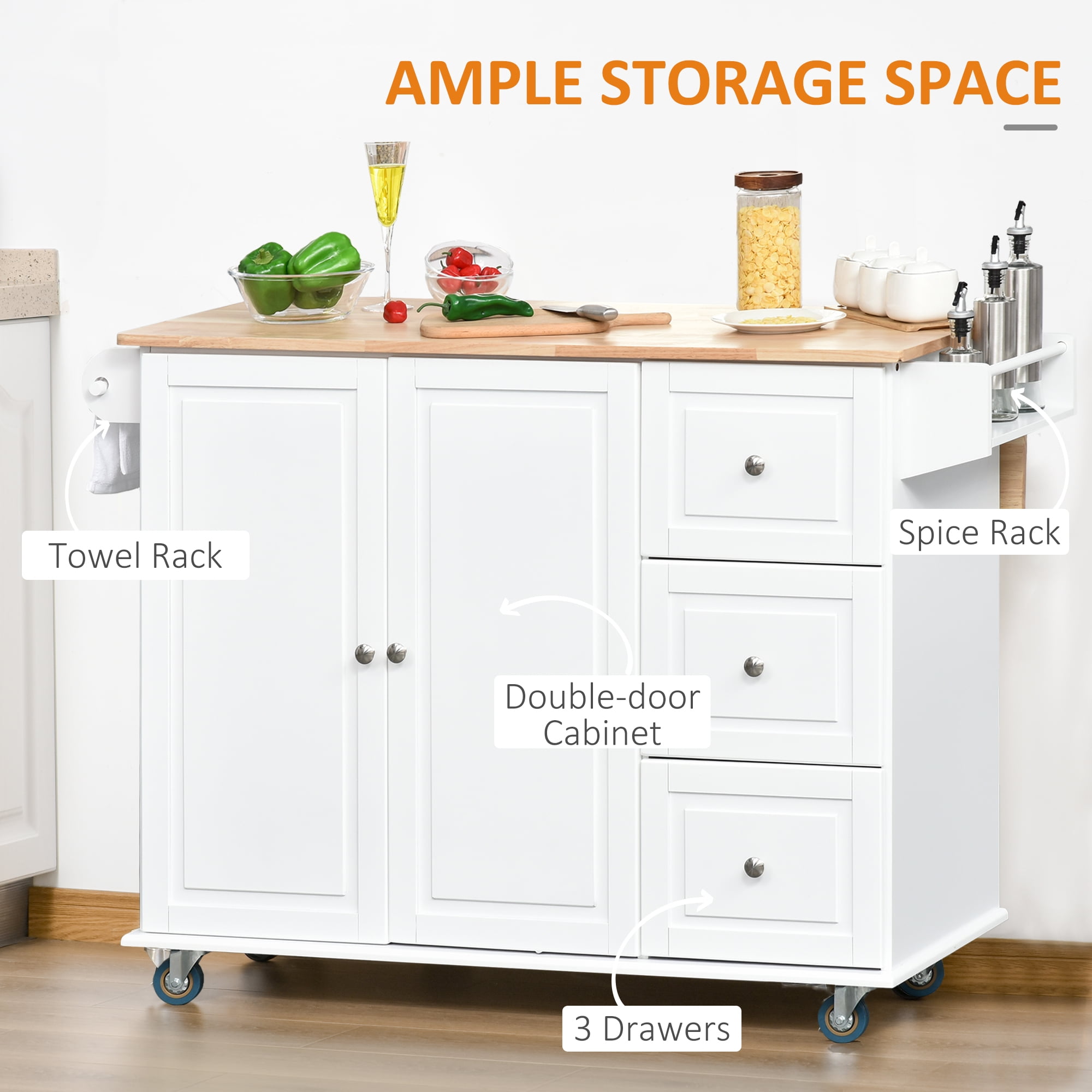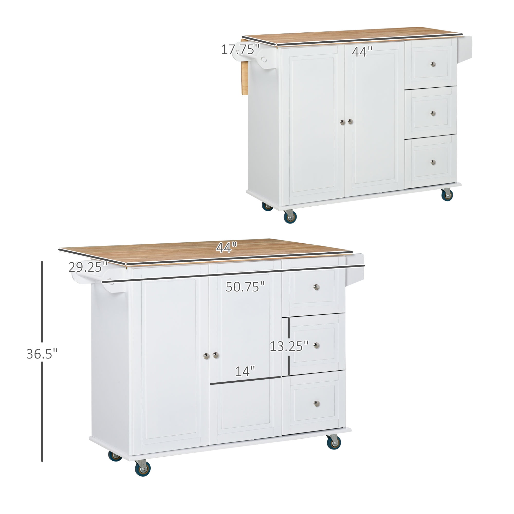 HOMCOM Mobile Kitchen Island Storage Trolley Cart with Dropleaf Top, Towel/Spice Rack, 3 Drawers, 2-Door Cabinet and Lockable Wheels, White Movable and Drop-leaf Top: Equipped with four wheels among which two can be locked, this rolling kitchen island can slide from your kitchen to your living room or dining room easily, and the drop-leaf table-top offers you extra space, so it can be used as a coffee bar cabinet. Space Saving Storage: Do you have too many utensils and too much silverware to fit in your drawers? With drawers and a 2 door cabinets, this kitchen cart is great for keeping kitchenware organized. Towel and Spice Rack: This kitchen cart comes with a towel and spice rack on each side of the kitchen island. No need to go back and forth to your cabinets when everything you need is on your new kitchen island. Solid Construction: With a sturdy framework made of high-quality engineered wood and a rubberwood countertop, this kitchen storage island supports up to 145lbs. Three drawers can slide smoothly and the cabinet doors are easy to grab. Kitchen Island Dimensions: Overall: 50.75″ L x 29.75″ W x 36.5″ D; Countertop: 44″ L x 17.75″ W, 44″ L x 29.25″ W (w/ drop leaf); Cabinet Inner Dimension: 15.5″ W x 14.25″ D x 31″ H; Overall Weight Capacity: 145lbs; Countertop Weight Capacity: 65lbs Specifications: Color: White – Material: MDF, Particleboard, Rubber Wood – Overall Dimension: 50.75″ L x 29.75″ W x 36.5″ D – Countertop Dimension: 44″ L x 17.75″ W – Cabinet Inner Dimension: 27.5″ W x 14.25″ D x 31.25″ H – Overall Weight Capacity: 145lbs – Countertop Weight Capacity: 65lbs – Countertop Dimension with Drop Leaf: 44″ L x 29.25″ W – Item Label: 801-164WT