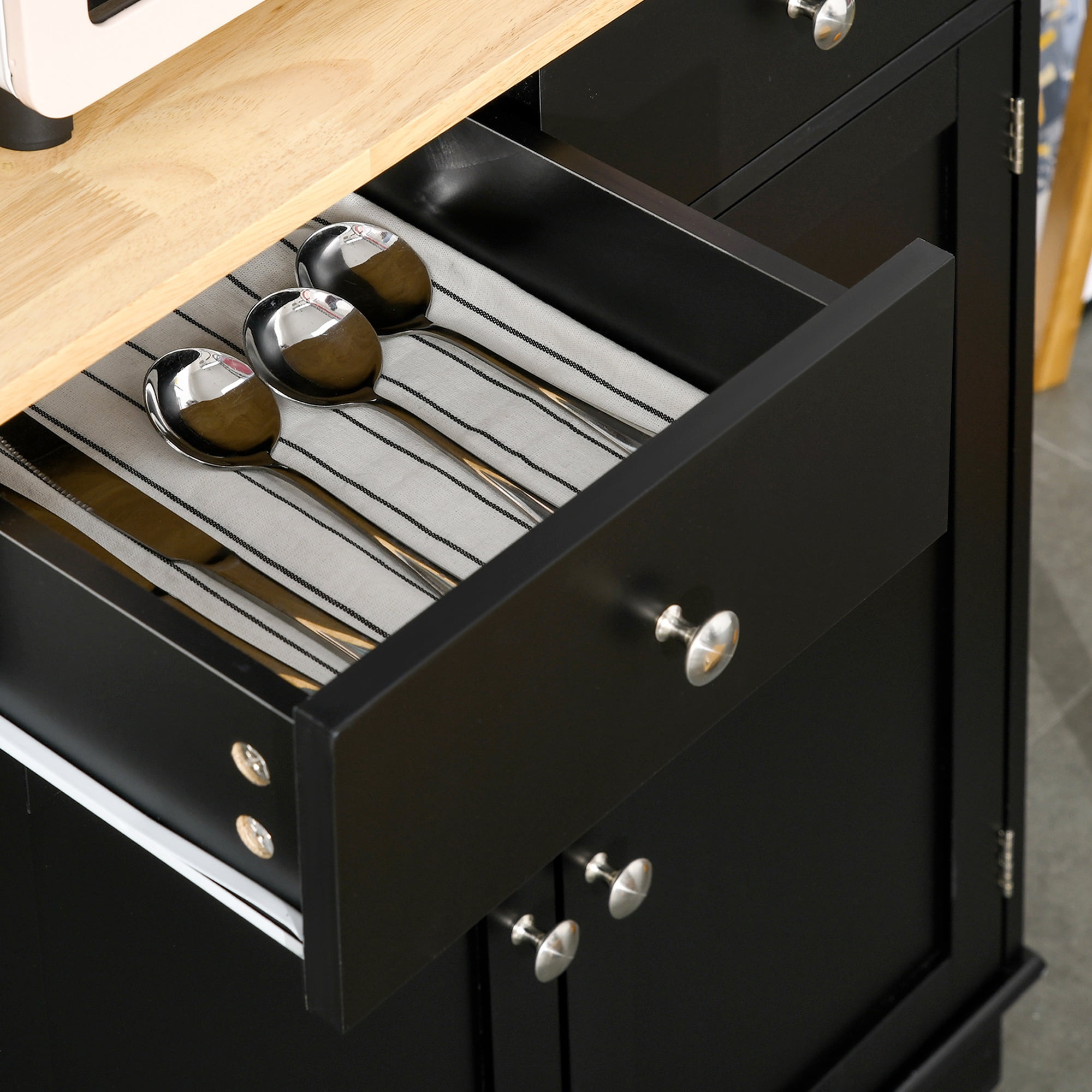 Ample Storage: Featuring an upper acrylic door cabinet, a 2-tier upper open cabinet, a lower door cabinet, 2 drawers, and an open center countertop space for you to take advantage of, this kitchen pantry storage cabinet has plenty of storage for your dishes, towels, utensils, and kitchen appliances. Storage How You Need It: This sideboard cabinet comes with adjustable shelving so you can customize your storage how it suits your items best. Also included is a cable management hole for keeping your cables neat and in 1 space. Solid Wood Counter: Elevate the aesthetic appeal of your cherished kitchen furniture with our meticulously crafted hutch for kitchen storage. Featuring recessed doors, a luxurious rubber wood countertop, and a sleek round metal handle, this food pantry cabinet is designed to impress. Safety Comes First: Constructed from quality P2 grade engineered wood with wall attachments for added stability, this tall storage cabinet is built for daily use. Hutch for Kitchen Information: Overall Dimension: 26.75″ W x 15.5″D x 67″ H; Overall Weight Capacity: 155lbs; Shelf: 22lbs, Desktop: 45lbs. Assembly Required Color: Black Material: MDF, Rubber Wood, Acrylic Door Panel Overall Dimension: 26.75″ L x 15.5″ W x 67″ H; – Upper Door Cabinet Size: 12.25″ W x 9.75″ D x 17.75″ H Upper Shelf Size: 12.25″W x 9.5″D x 8.25″H Lower Cabinet Size: 24.75″ W x 14.25″ D x 23.5″ H Drawer Size:11.25″W x 10.25″ D x 3.25″H Countertop: 26.75″ L x 15.5″ W x 13.25″H Weight Capacity: Overall: 155lbs, Shelf: 22lbs, Desktop: 45lbs Item Label:835-427BK Explore More Our Kitchen Pantry Products, Click and Go! See Our Brand Today’s Products Promotion, Click and Go!