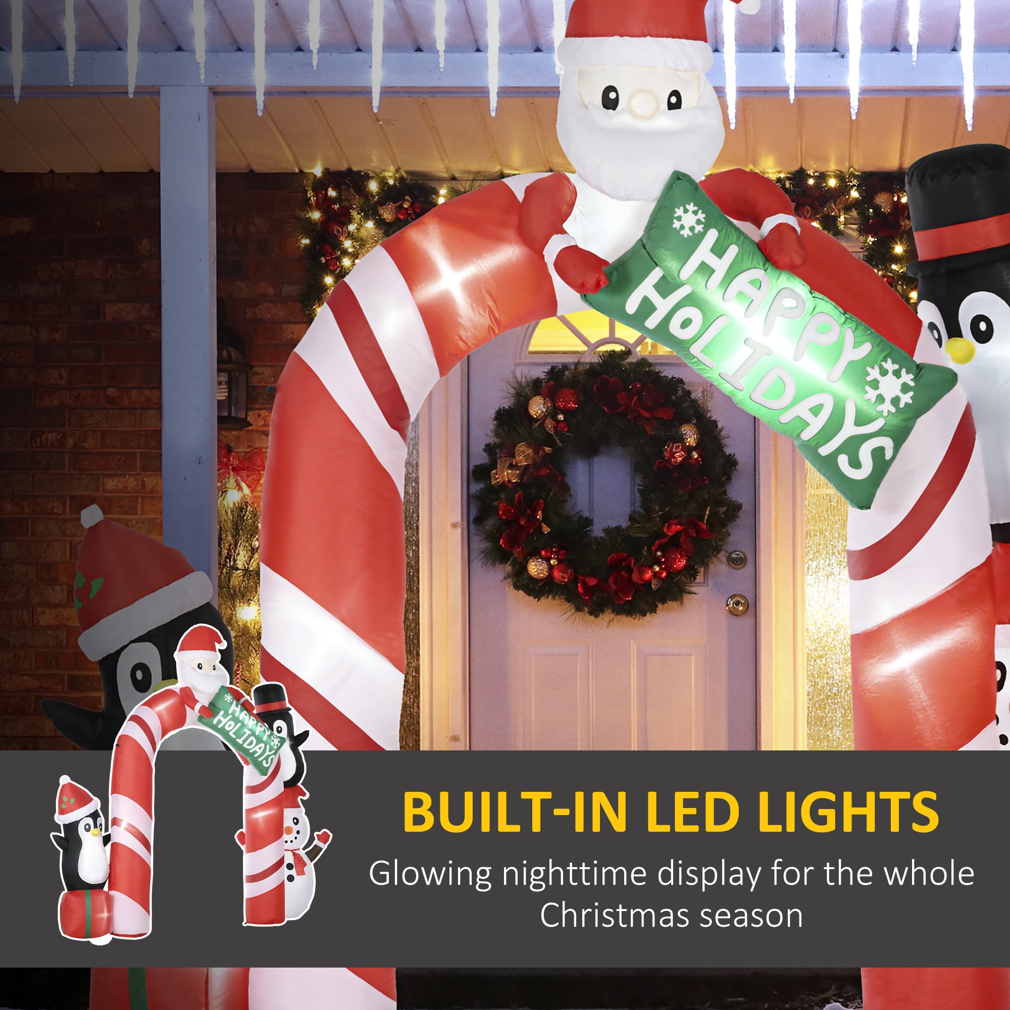 Homcom Lights Up Archway Santa Christmas Yard Inflatables Show Your Festiveness: This archway features Santa Claus, two penguins, and a snowman, bringing outdoor holiday cheer to new heights Add Some (Even More) Light: Built-in white LED lights ensure your decoration is visible and illuminate every detail for a magical display Mild Wind Or Rain? No Problem: Includes seven stakes, three drawstrings, and four sandbags to secure your inflatable against windy conditions No-Hassle Set Up: Simply plug it in and turn on the power to inflate. Unplug to deflate—it’s that easy Archway Christmas Decoration Info: Overall dimensions are 126″ W x 31.5″ D x 120″ H