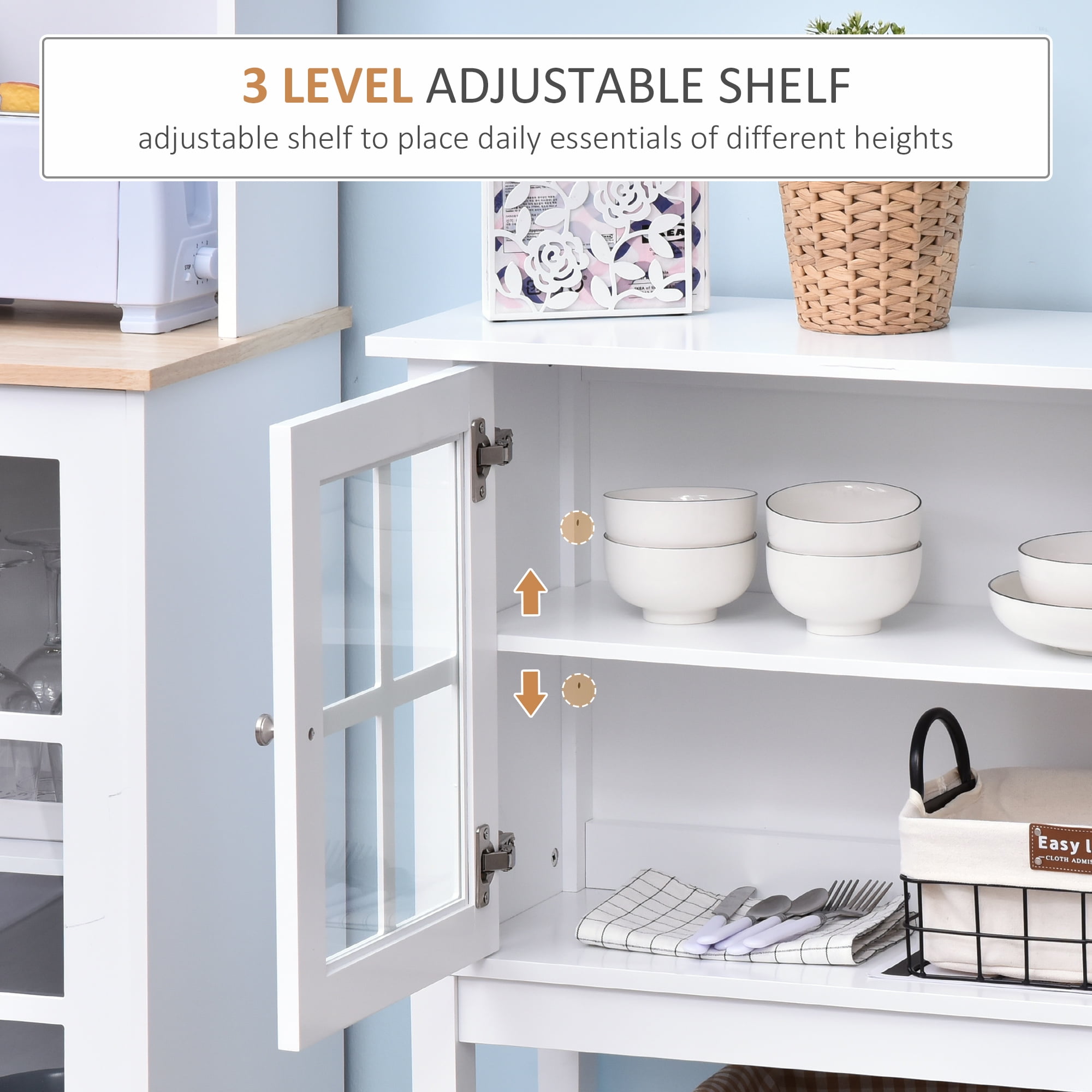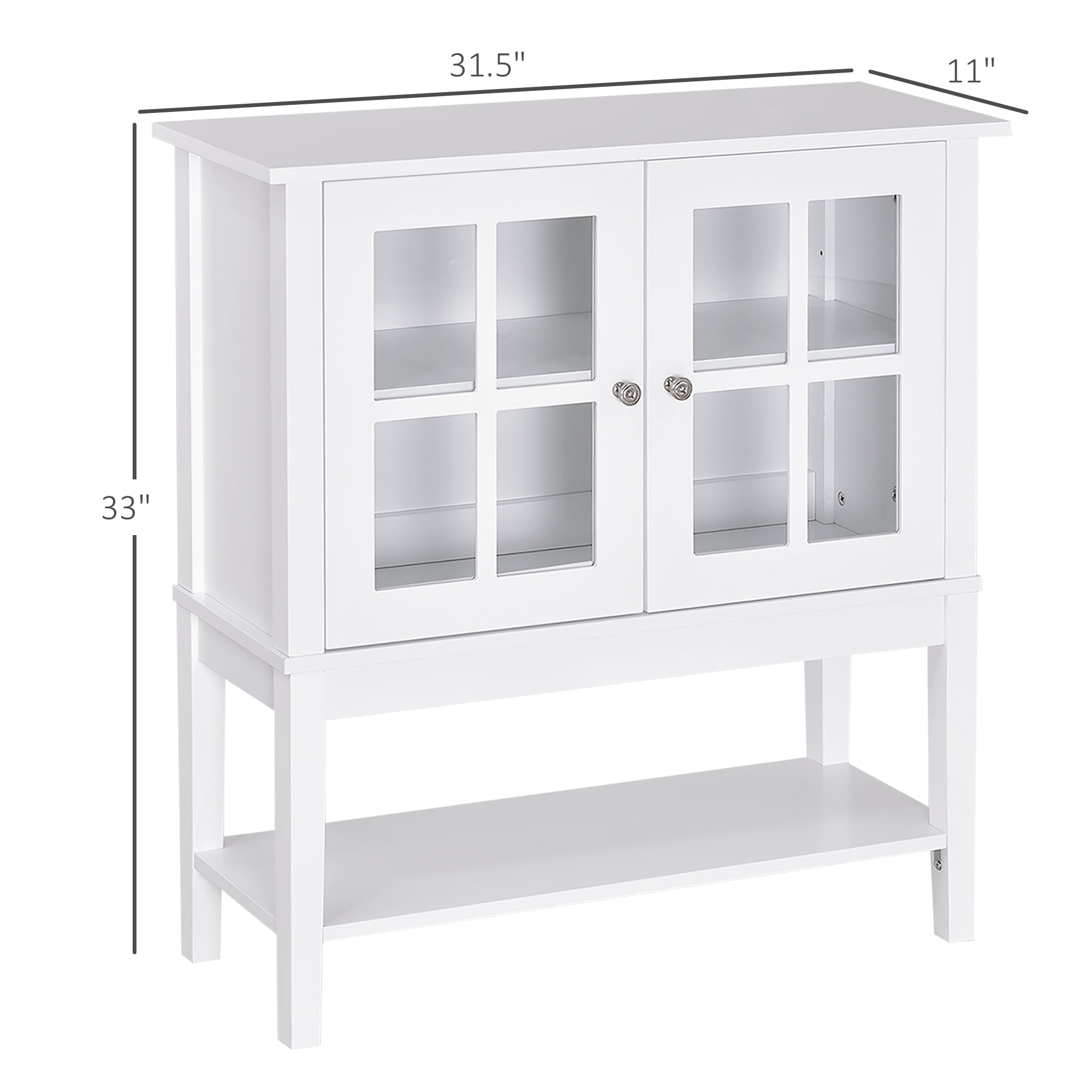Want to add more brilliance to your house as well as keep the stuff organized for space-saving? Our HomCom credenza with windowpane doors can give you a neat space at home. This sideboard buffet is designed in a minimalist style, which looks elegant and can fit in any decoration. This credenza storage cabinet is constructed of selected MDF board and features a middle adjustable shelf & a bottom shelf for versatile storage. 2 tempered glass doors make the sideboard convenient for you to find your items briefly. As a combination of elegance and functionality, the unit is compatible with various decoration styles, and can perfectly fit your living room, kitchen, bathroom, entrances, etc. Just add this sideboard to the corner of the kitchen or living room to enhance style and convenience with elegance.