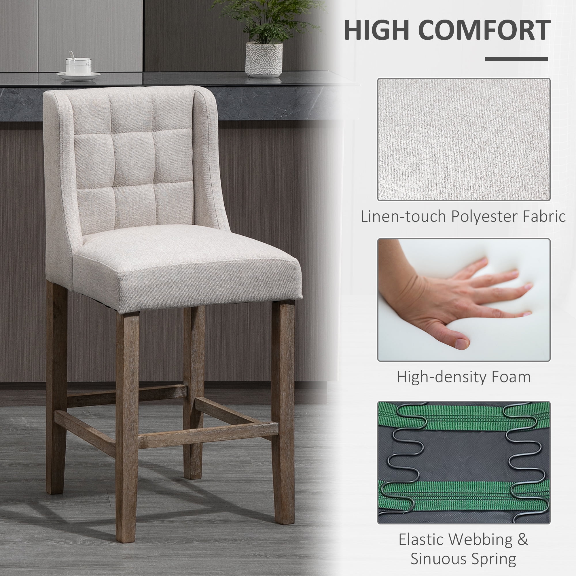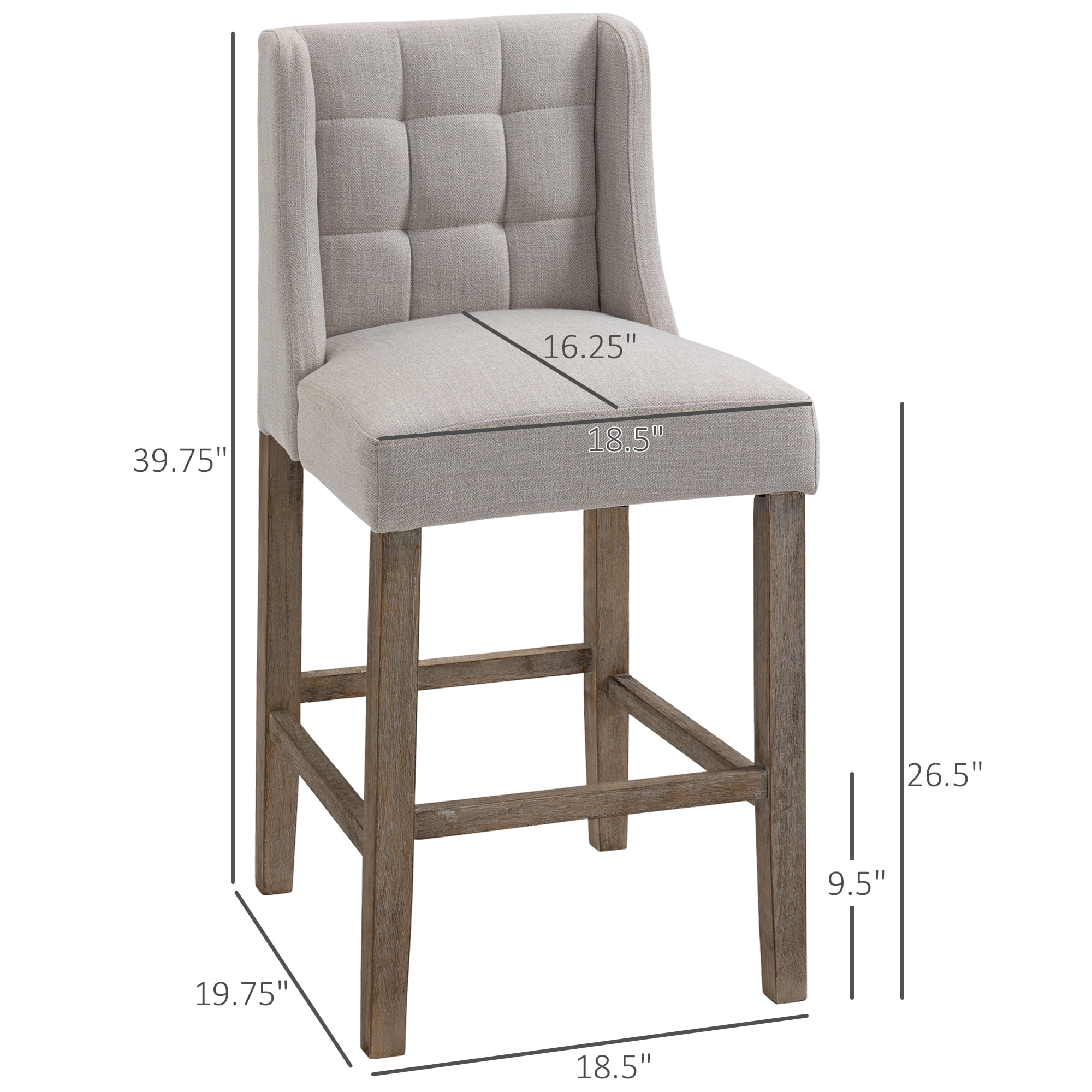 Barstool Set: Drift away from the prepping zone, and create your breakfast bar with this barstool set! Finally, you can have a quiet spot to comfortably socialize, without getting in the way when cooking is in full flow. Stylish Bar Stools: These bar chairs include tufted backrests and rubber wood legs for a modern and contemporary design that complements your home décor. Cushioned Seat: Sit back and sink into these upholstered bar stools with back! Includes a sinuous spring and an elastic webbing system to keep the cushions bouncy and to help prevent sagging. The high-density foam adds comfort while you lounge. Solid Construction: This modern bar stools set includes linen-touch polyester for seats with fabric that breathes and are easy to maintain. The rubber wood legs provide stability, while the footrest helps keep you relaxed and cozy. Bar Stools Dimensions: Overall: 18.5″W x 19.75″D x 39.75″H. Seat Size: 18.5″W x 16.25″D. Seat Height: 30.25″. Weight Capacity: 264 lbs Specifications: Color: Beige Material: Linen-touch Polyester, Rubberwood Overall Dimensions: 18.5″W x 19.75″D x 39.75″H Seat Size: 18.5″W x 16.25″D Seat Height: 26.5″ Back Size: 16.5″W x 18.5″L Weight Capacity: 264 lbs Item Label: 835-485CW