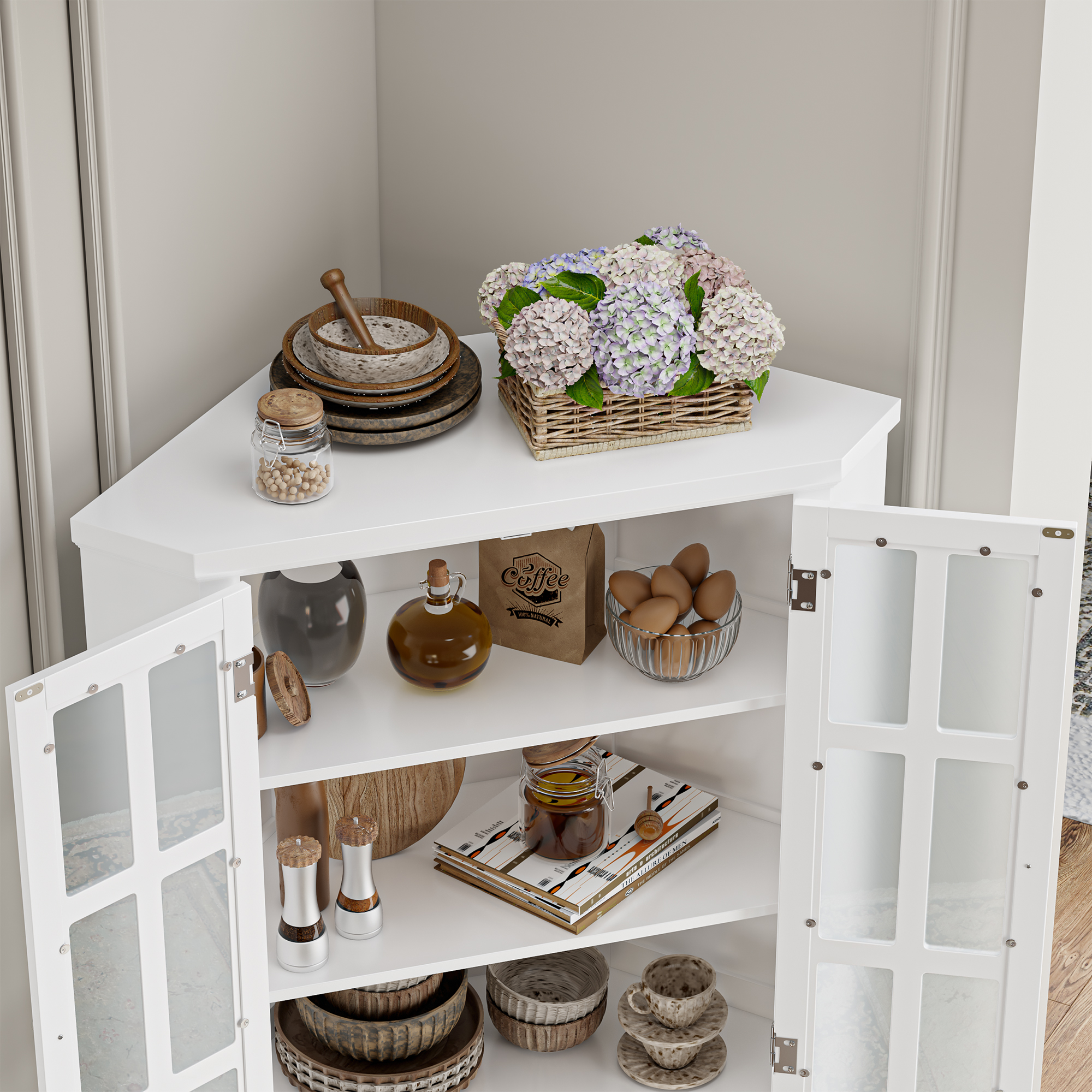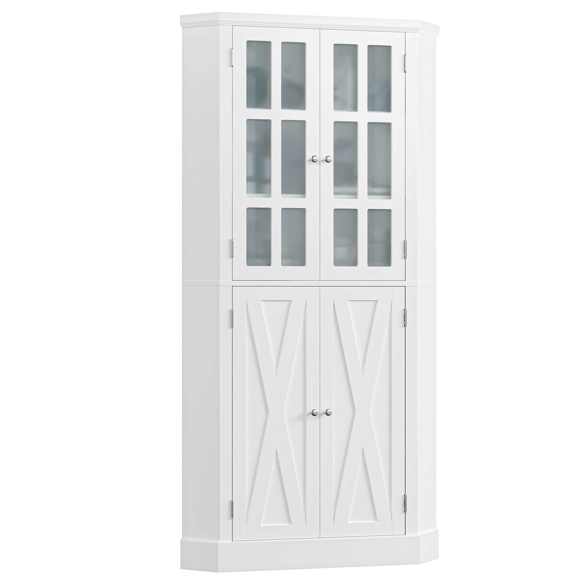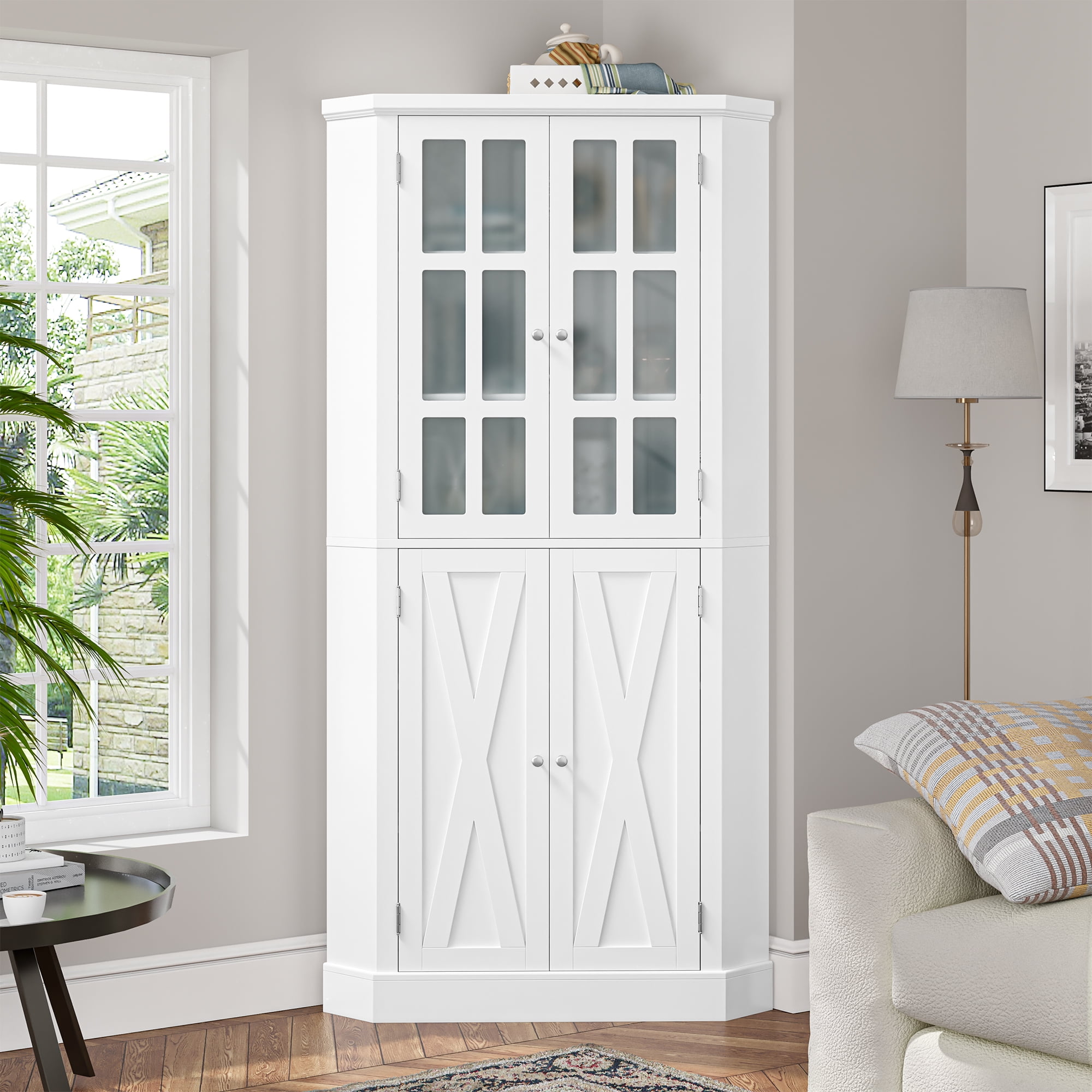 Home 67″ Corner Cabinet with Doors, Wood Corner Hutch with Glass Doors, for Dining Room, Kitchen, Basement, White