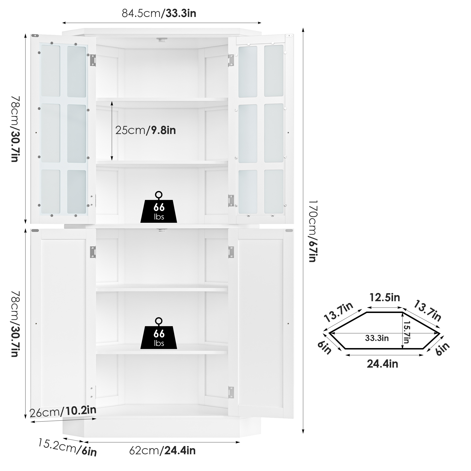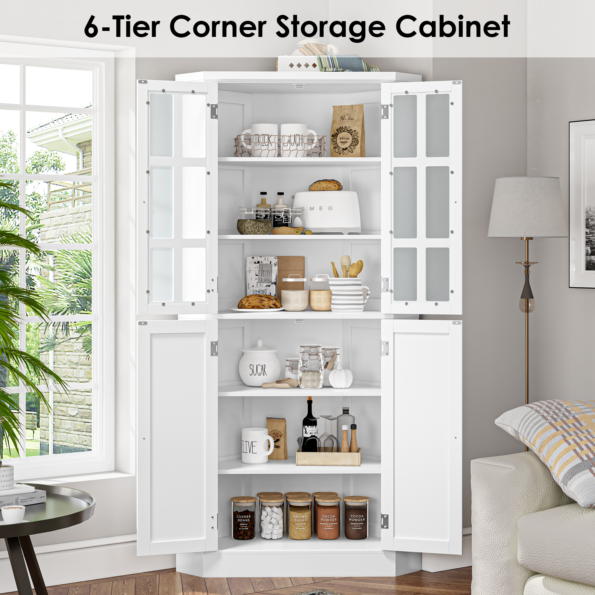 Glass Doors: The corner cabinet with double glass doors, allowing you to display your collection or showcase your favorite decorative items. The transparent glass provides a clear view, allowing you to storage your kitchen supplies while protecting it from dust and damage. Space Utilization: This corner storage cabinet for small spaces is designed to maximize space utilization while adding a touch of elegance to any room. Safe Design: This tall cabinet is also equipped with an anti-tipping device, which improves safety and stability. Easy Assembly: With detailed assembly instructions, setting up this bookshelf is quick and hassle-free. 24/7 Customer Service: Quality support – any questions, email us, and we’ll respond within 24 hours. Specifications: Material: PB Model: BOT-MD-020 Color: White Overall Size: 33.07″W x 14.96″D x 66.93″H Item Weight: 100.22 lbs Number of Shelves: 6 Assembly Required: Yes Product Warranty: 1 Year Package Include: 1 x 6-tier Corner Cabinet 1 x Assembly Kit 1 x Instructions