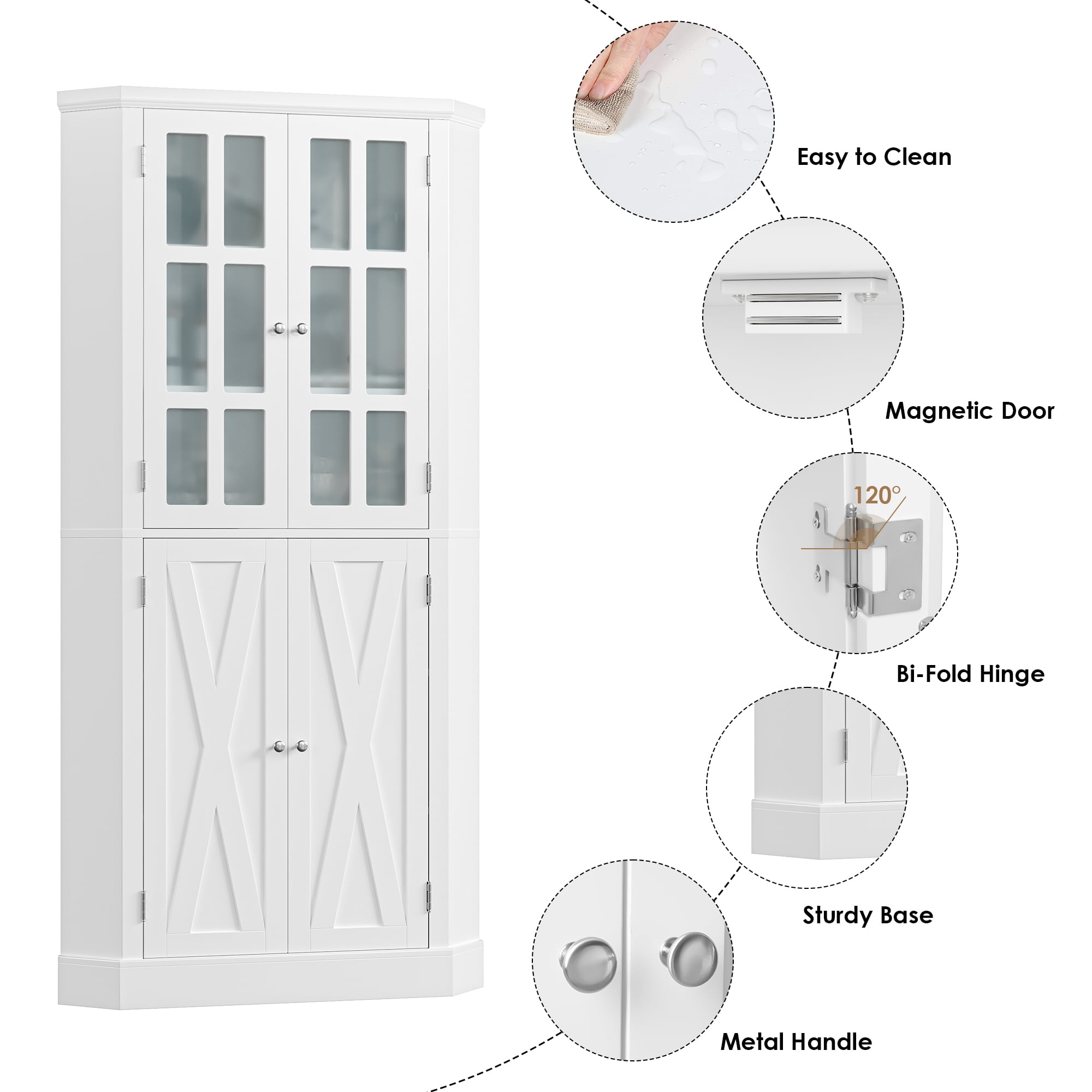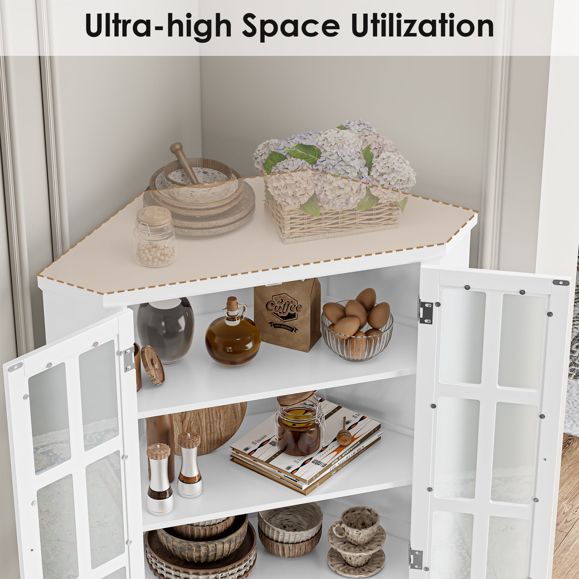 Homfa 67″ corner cabinet with double glass doors lets you display your collections or showcase your favorite decorative items. The clear glass provides a clear view, allowing you to store kitchen items while protecting them from dust and damage. This corner storage cabinet for small spaces is designed to maximize space utilization, and this tall cabinet also features an anti-tip device for increased safety and stability. With detailed assembly instructions, installing this bookcase is quick and easy.
