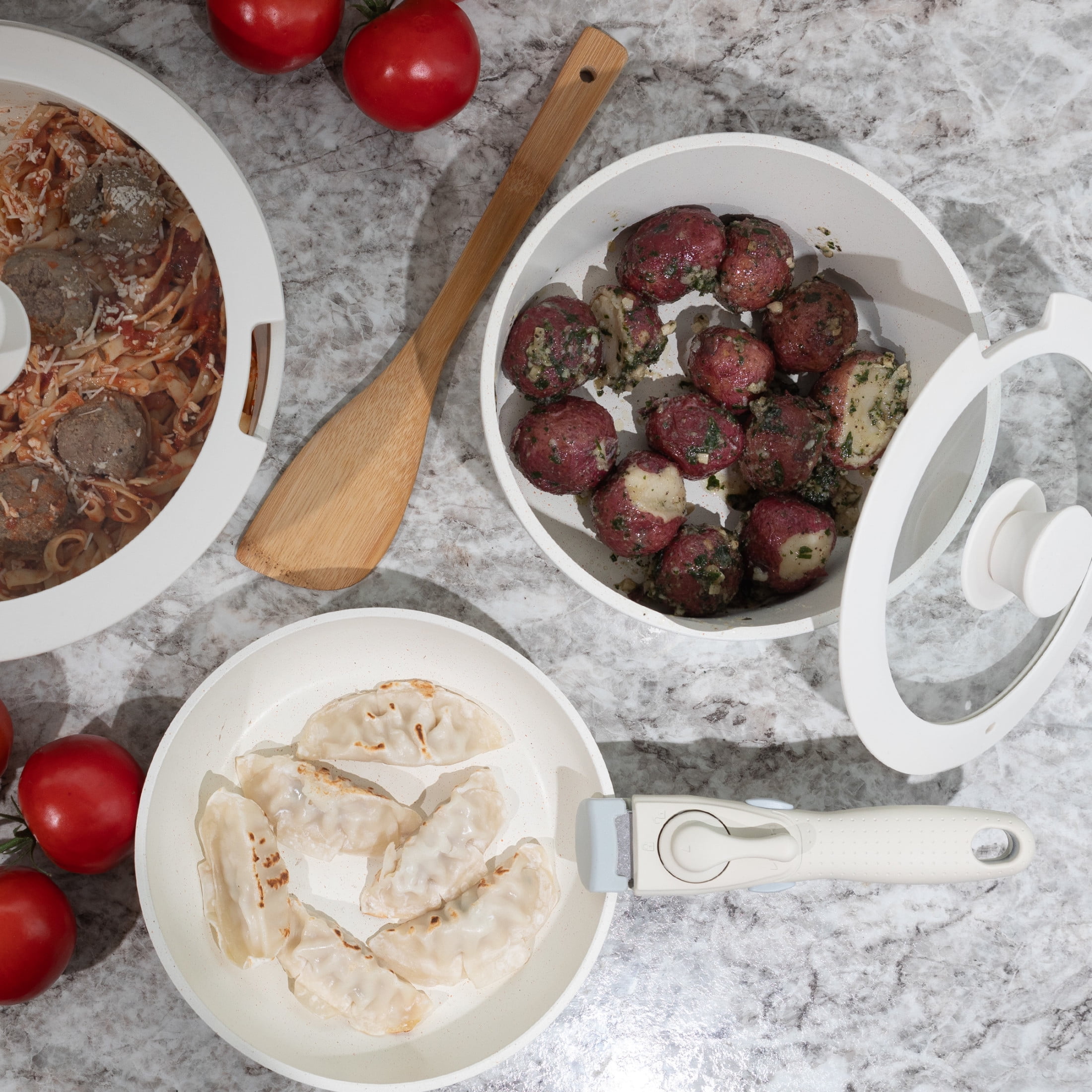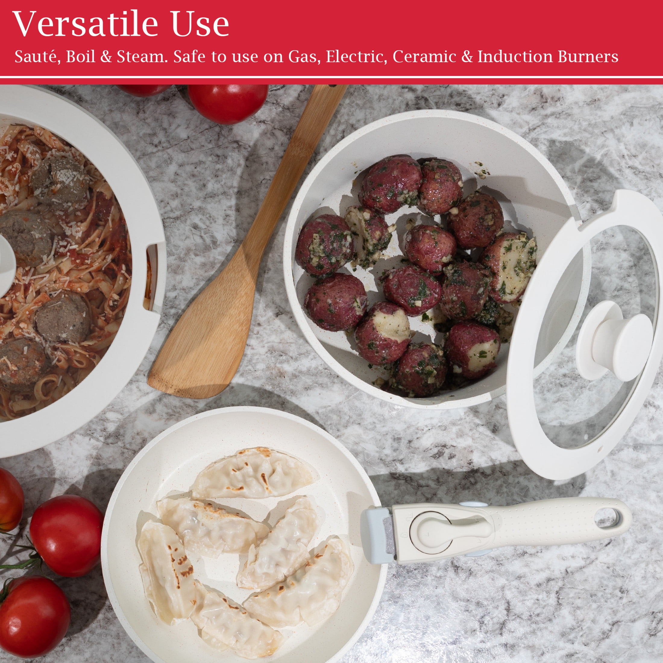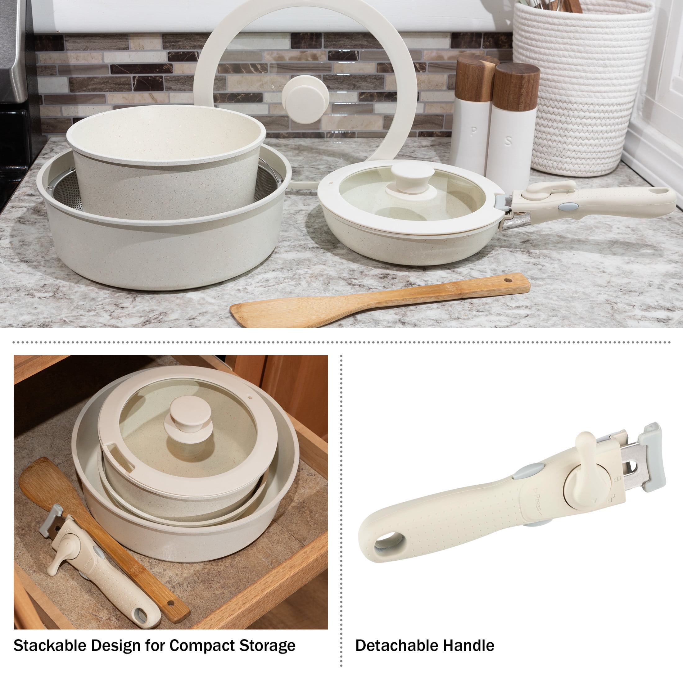 8PC POT AND PAN SET – This 8pc non stick pots and pans set comes with a 1.48qt frying pan, 2.96qt and 4.44qt pots, a detachable handle, 2 lids, a wood spatula, and a metal steamer basket. STACKABLE DESIGN WITH REMOVABLE HANDLE – With a conveniently detachable handle, this pot set is stackable for compact storage, ideal for use in small kitchens, apartments, RVs, or while camping. NONSTICK CERAMIC COATING – The kitchen pots and pans set are made of durable aluminum alloy with a ceramic coating, designed to be nonstick, dishwasher safe, and long-lasting. VERSATILE USE – Use this cooking pan set on gas, electric, ceramic, or induction burners to sauté, boil, and steam up to 250-degrees C or 482-degrees F (not oven safe). MATERIALS – Aluminum Alloy with Ceramic Coating and Phenol-Formaldehyde Resin Handle. DIMENSIONS – Sauté Pan: (L) 8.2” x (H) 2”; Large Saucepan: (L) 10.6” x (H) 3.5”; Small Saucepan: (L) 8.2” x (H) 3.7”; Handle: (L) 7.4” x (H) 1.9”; Lids: 10.6” and 8.9”. COLOR – Cream.