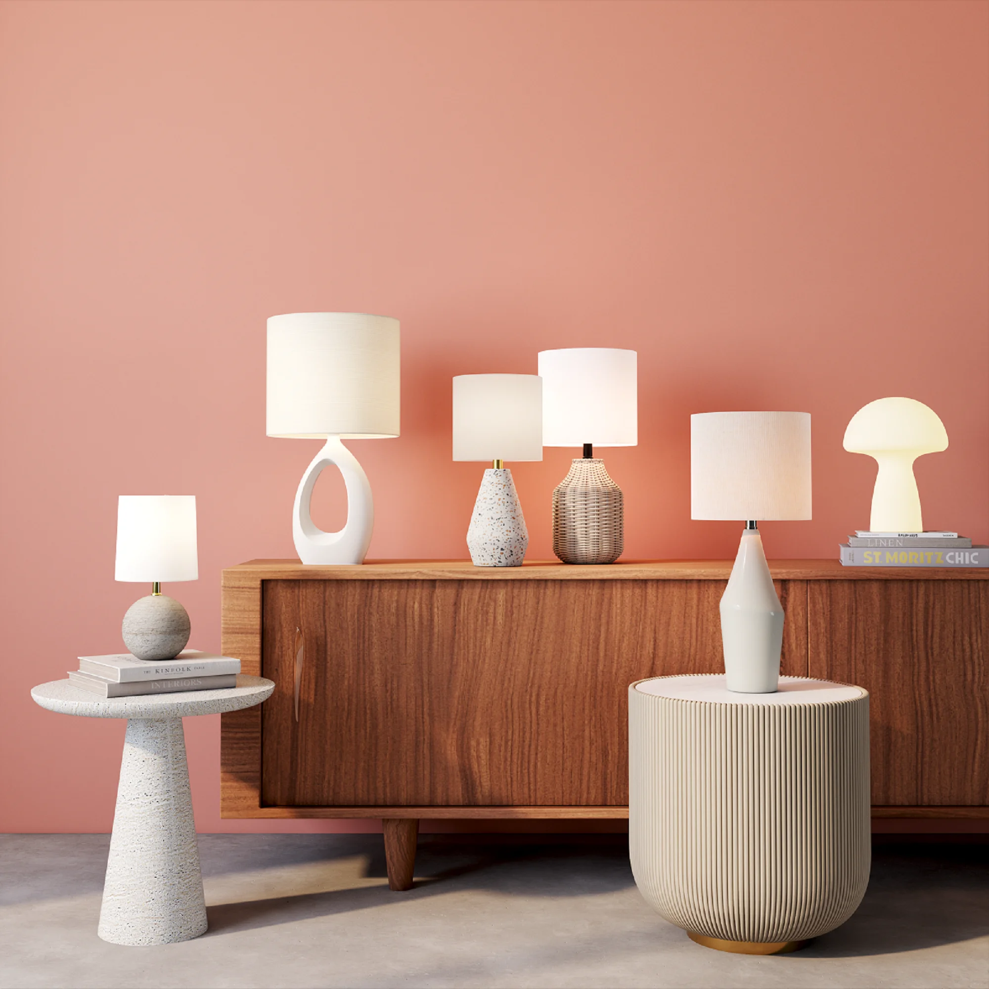 19″ overall height perfect for living room, den, bedroom, guest room, office, dorm and more Features a white fabric shade 9.5″ dia x 10″ high Easy on/off rotary light switch Elegant looking with modern style Requires a 60 watt Type A bulb or 7 wat LE bulb ((not included)