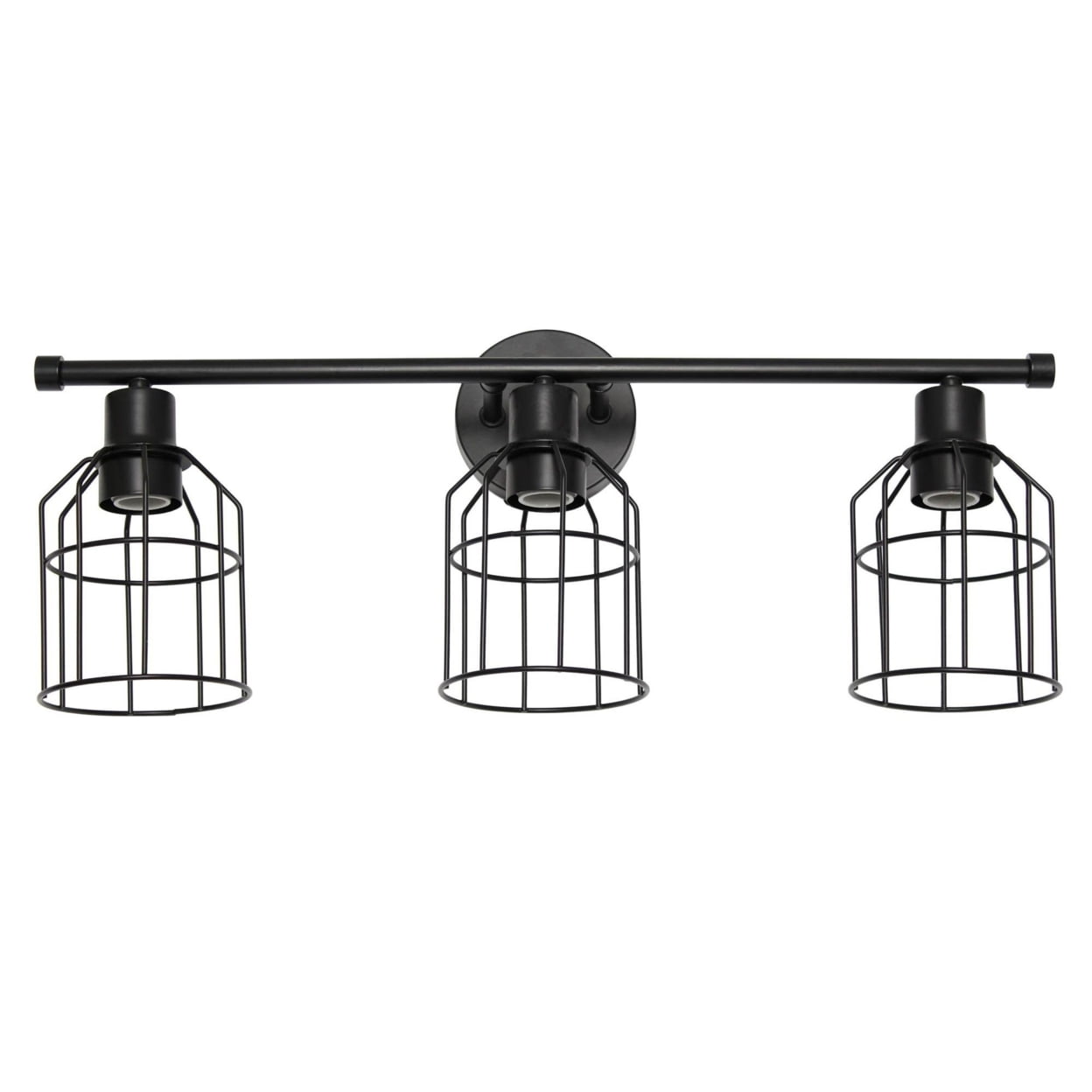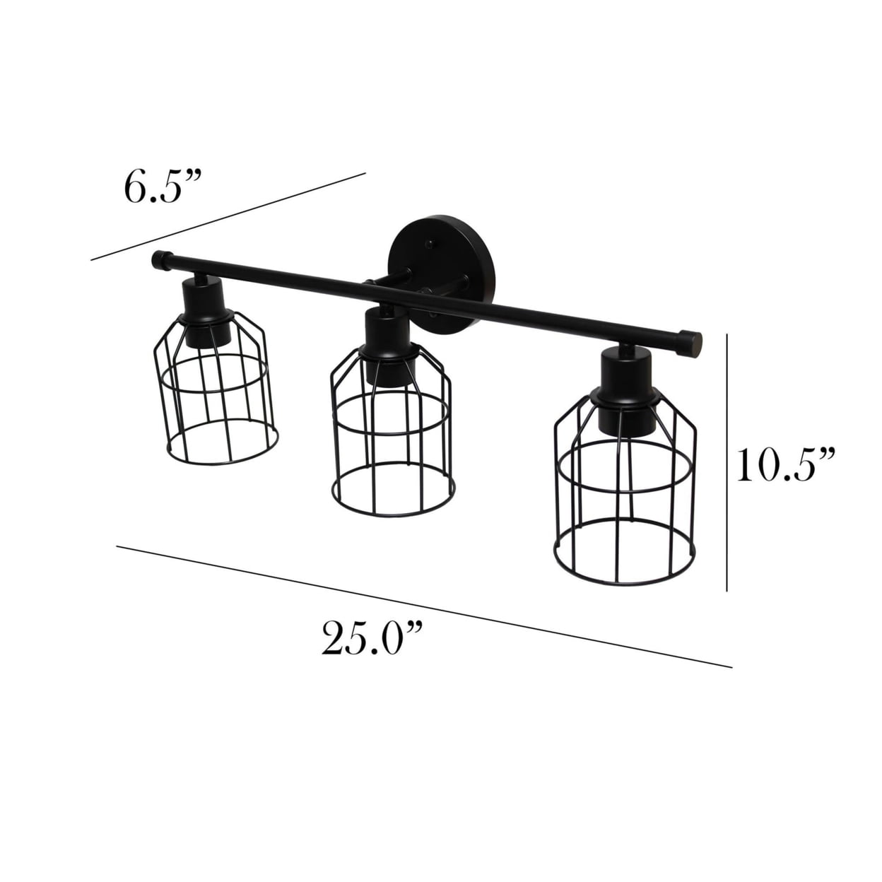 Home Decorative Lighting 3 Light Cage Vanity Light, Matte Black Description: This industrial design fixture features a clean-lined bar and a circular back plate in a black finish. The open wire cage shades complete the look by leaving the bulbs exposed letting the maximum amount of light to pass through. Hang beautifully not only in your bathroom, but will fit just right near a reading nook, foyer entrance, or space of your choice. HELPFUL TIP: To get the complete industrial look, we recommend using a decorative Edison/Vintage bulb (not included). Features: Black mounting deck and accents. Metal cage shades. Uses 3 x 60W medium type A base bulbs (not included). Can be mounted as an uplight or downlight. Hardwired. Available in additional color options. Material: Metal. iron95%+power5%. Color: Black. Brand Name: Elegant Designs Model No: 1270-VT1014-BLK