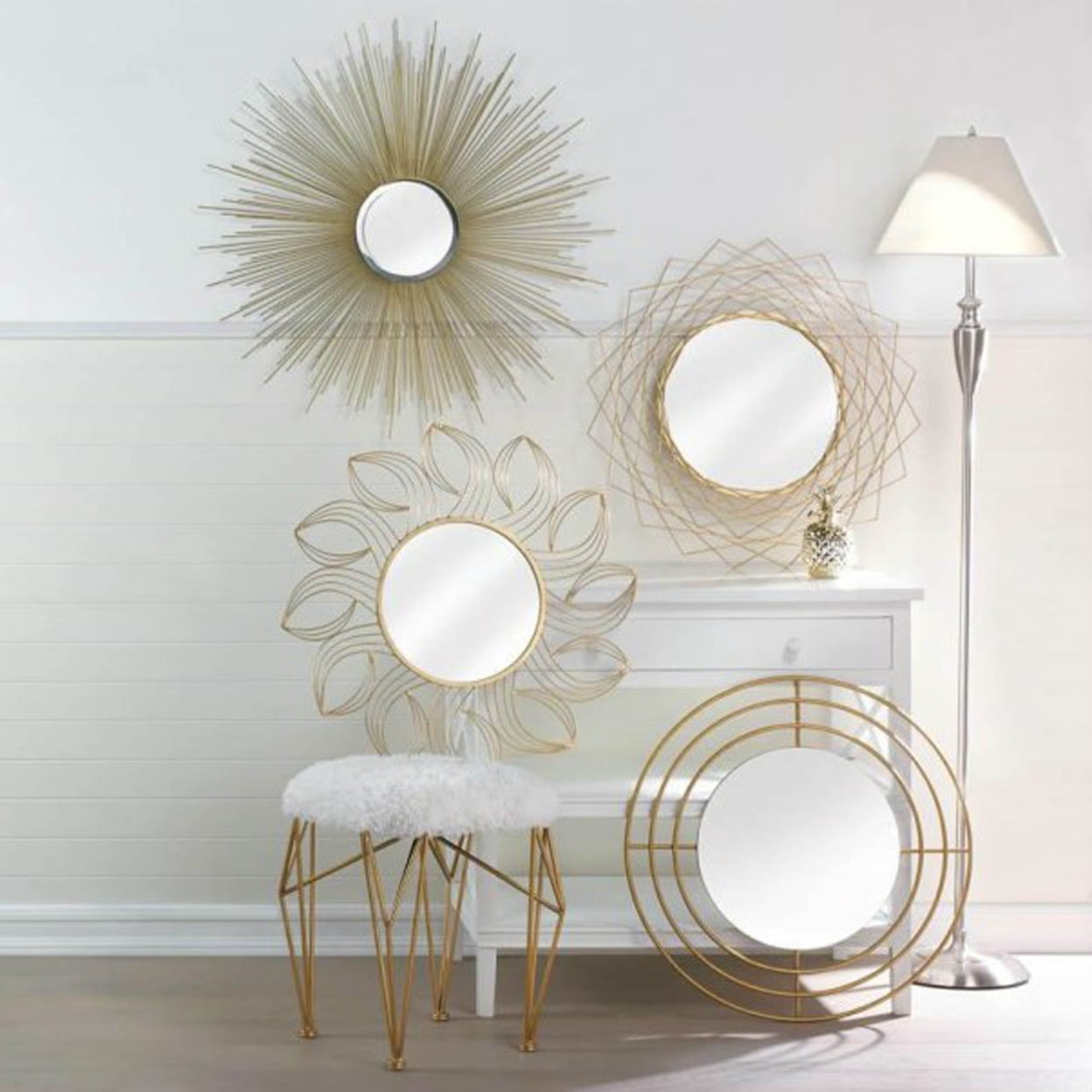 GOLDEN PETALS WALL MIRROR Material – IRON, MIRROR Manufacturer -Accent Plus Product Category – HOME DECOR Item Length – 25 Item Width – 1 Item Height – 25