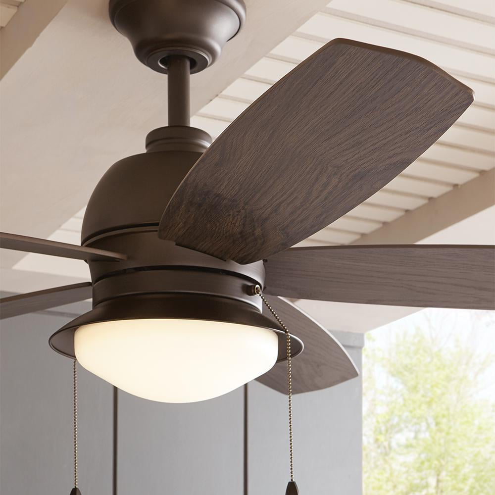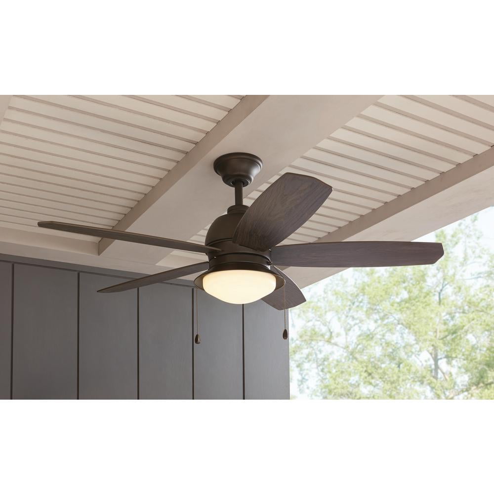 Enhance your outdoor living space with the Home Decorators Collection 52 in. Ackerly indoor/outdoor ceiling fan. This fan is damp rated for use outdoors in covered areas like porches and patios but looks great indoors as well. The Ackerly fan includes five reversible blades to blend today’s decor trends. With an integrated 20-Watt LED module light kit, this fan is virtually maintenance-free with no bulbs to replace. The quiet reversible motor and light kit are easily controlled with the included pull-chains.