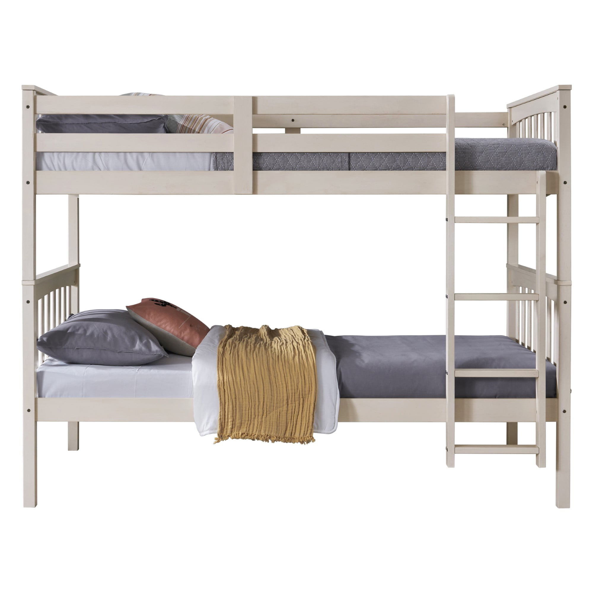 Make your children’s bedroom more fun and functional with the Ames Twin Over Twin Solid Wood Standard Bunk Bed. This thoughtfully designed bunk bed maximizes your kids’ play space while providing a comfortable and secure place to sleep. It features sturdy guardrails and a built-in ladder, ensuring your children sleep securely on the top bunk. The versatile and space-saving design allows the bunk bed to be stacked for a classic bunk bed setup or unstacked into two separate twin beds, adapting to your changing needs. The bunk bed’s overall dimensions are 78.0 inches in length, 43.6 inches in width, and 61.9 inches in height, making it a perfect fit for most rooms. When separated, each twin bed measures 78.0 inches in length, 43.6 inches in width, and 33.5 inches in height, providing flexibility in how you use the space. This bunk bed offers durability and a timeless look that blends seamlessly with various bedroom decor styles, while adding an element of fun and functionality to your child’s room.