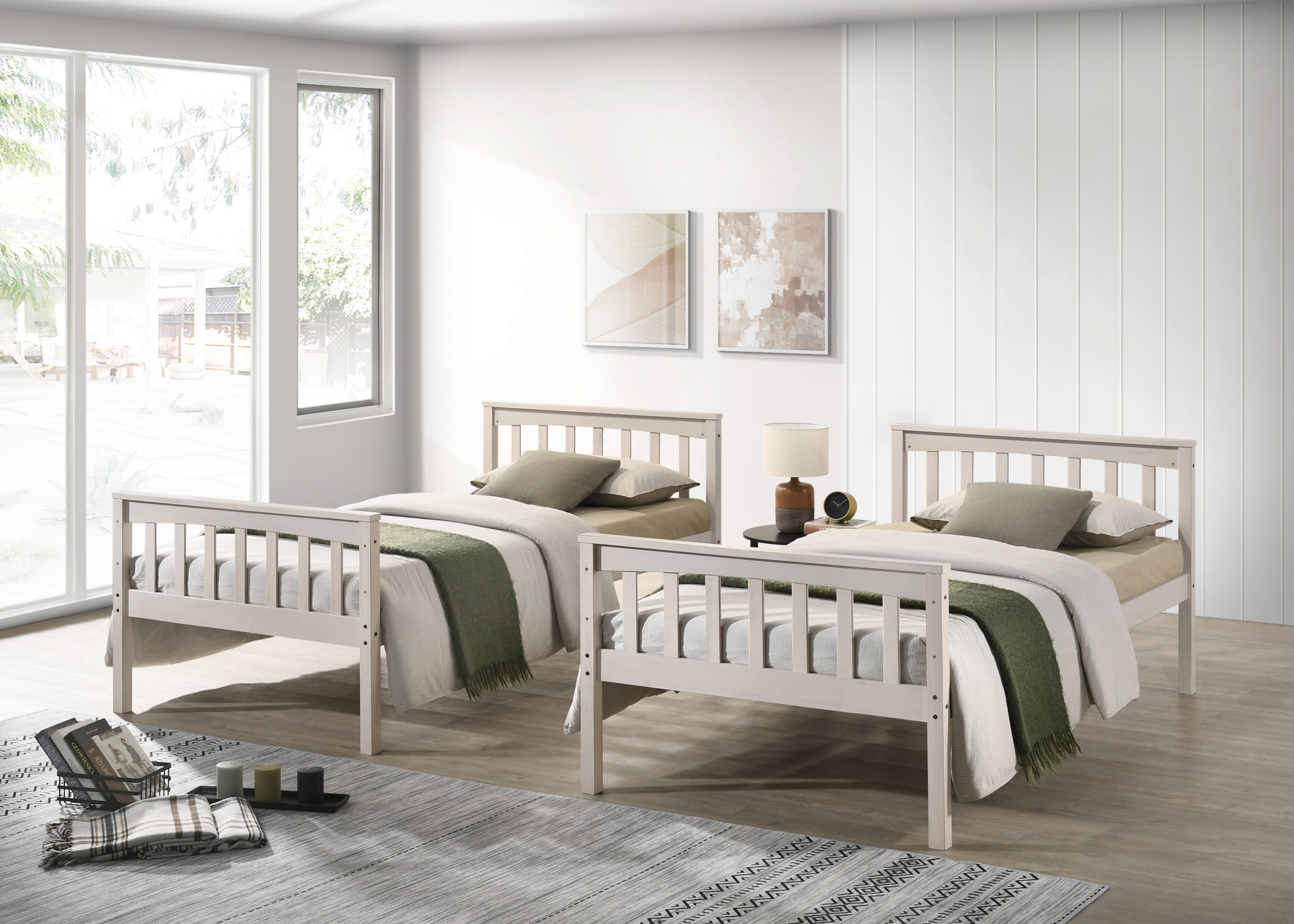 Space-saving design is perfect for small rooms It can be stacked into bunk bed or unstacked into two separate twin beds Slat included