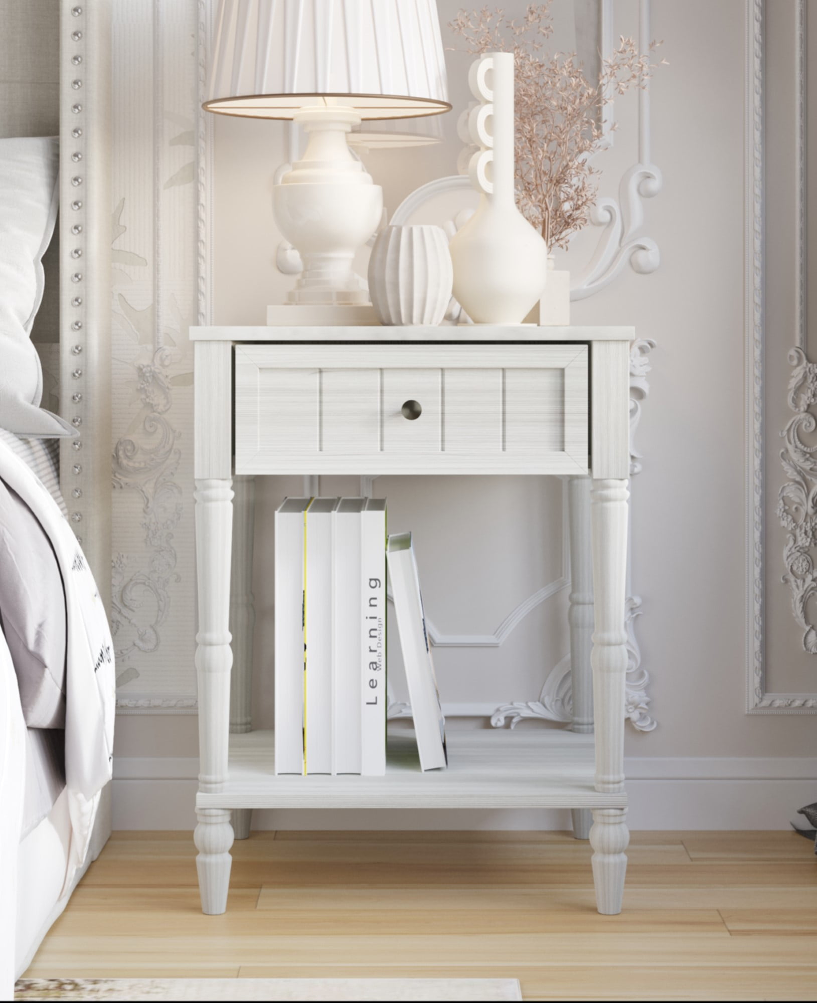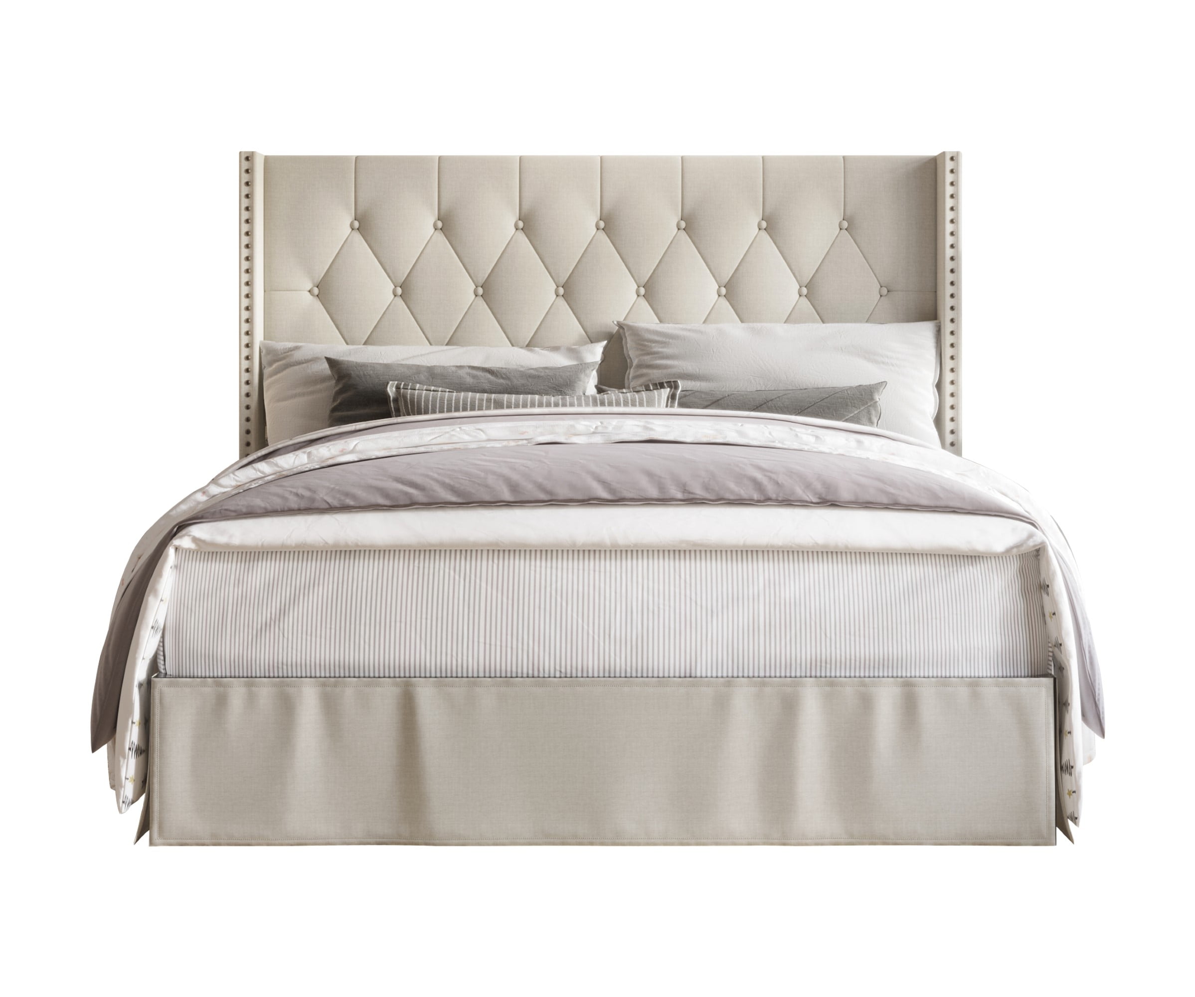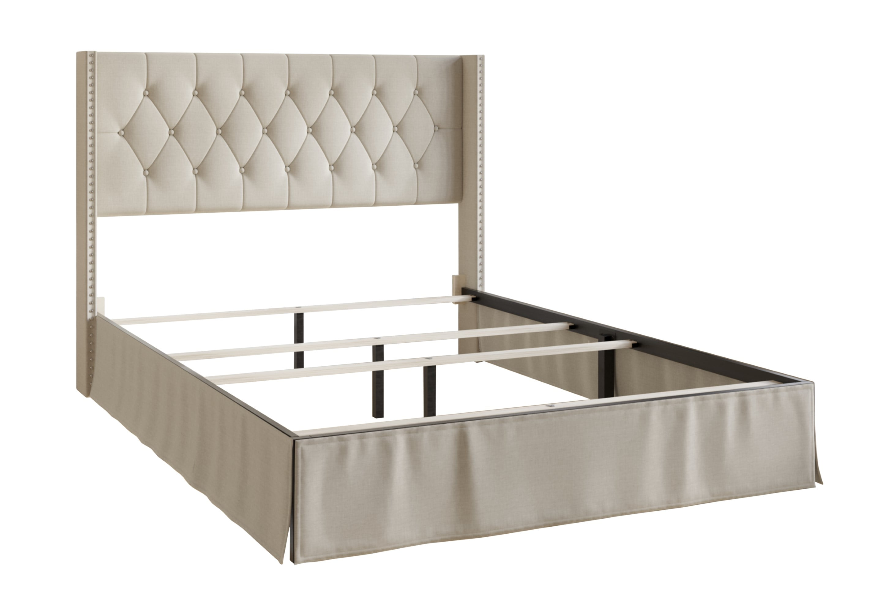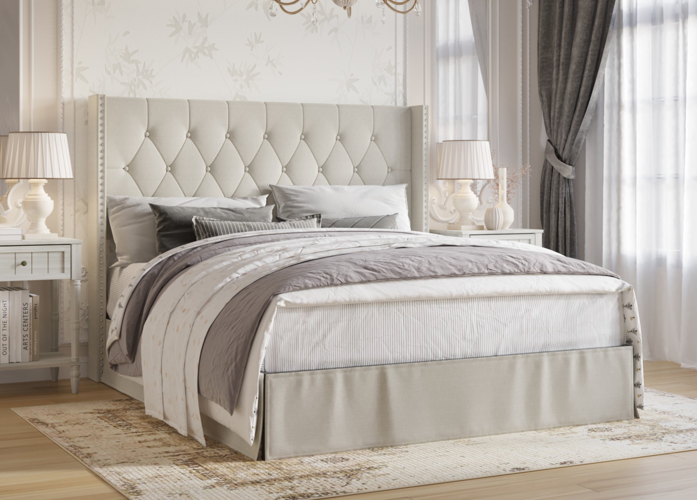 Button tufted with nailhead trim on the headboard It comes with a beautiful bed skirt Solid nightstands