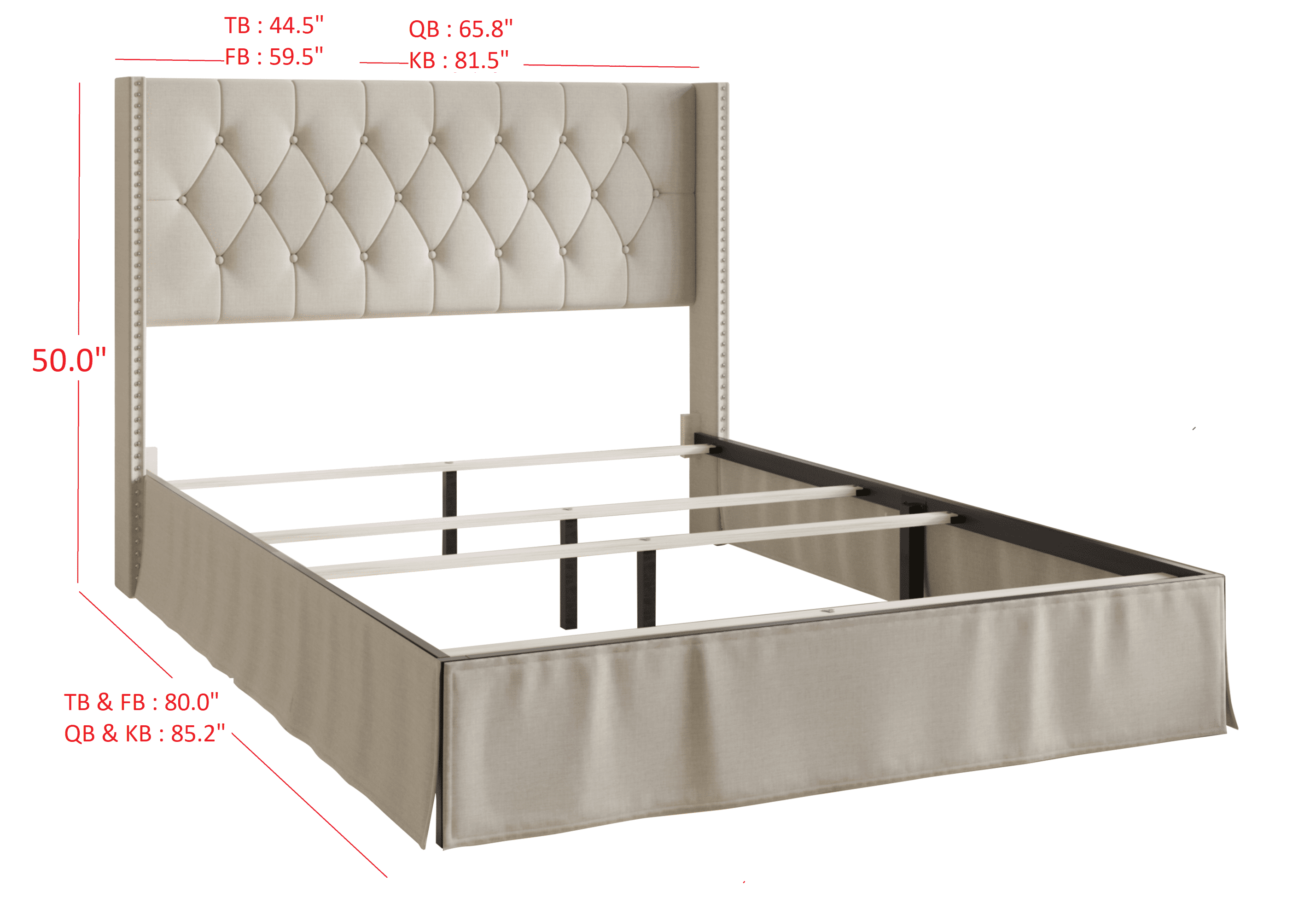 Enhance your bedroom with this classic 3-piece bedroom set, combining timeless design and functionality. The set includes an upholstered panel bed in Warm Gray and two coordinating nightstands in a matching Light Gray hue. The bed features a rectangular silhouette headboard adorned with classic button tufting and nailhead trim along the wingback sides, offering both elegance and a comfortable space to lean against for late-night reading. This set is completed with a beautiful bed skirt that discreetly covers storage space beneath the bed. The nightstands perfectly complementing the bed and enhancing your room’s overall aesthetic.