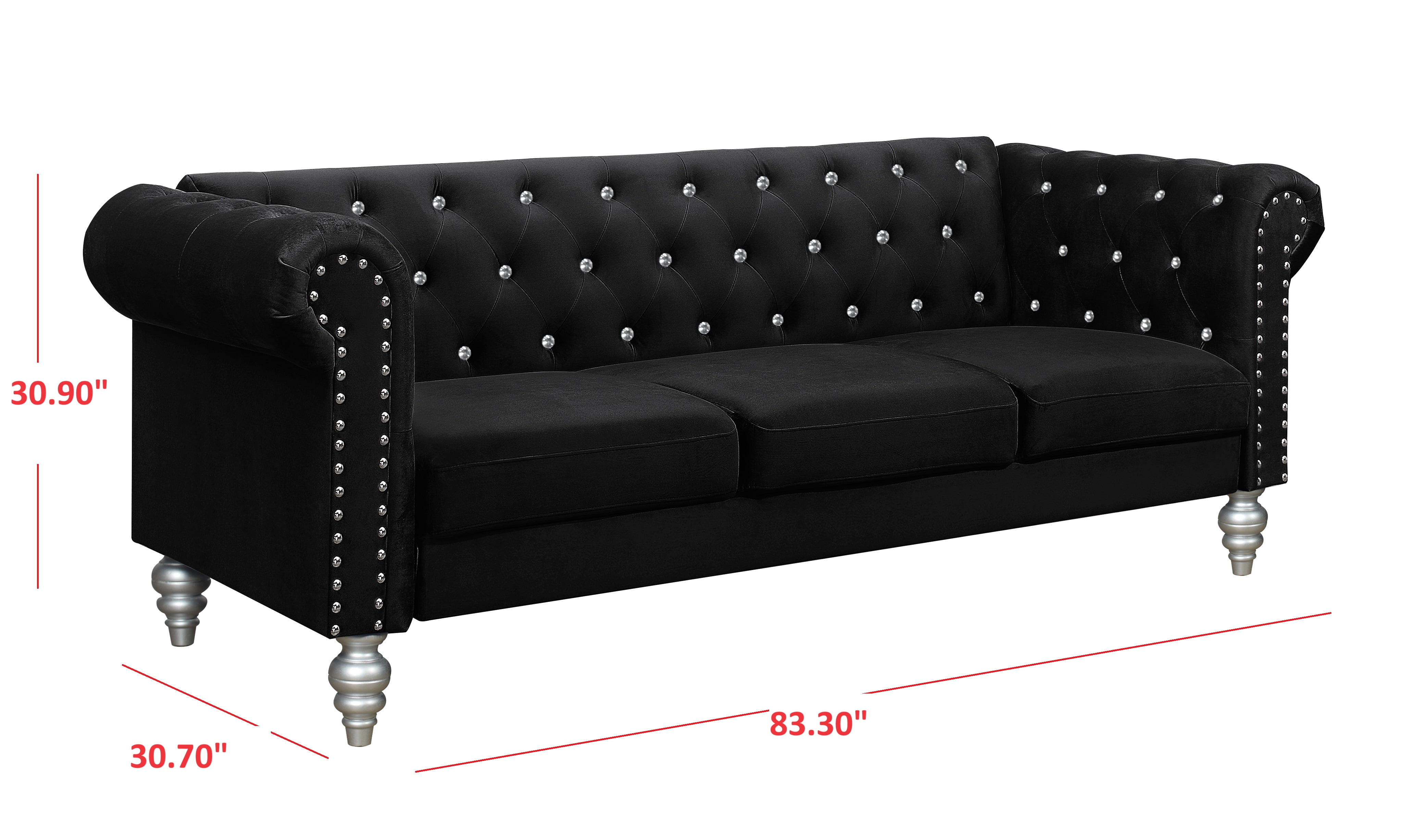 Home Design Emma Contemporary Velvet Rolled Arm Chesterfield Sofa with Diamond Button Tufted Back and Nailhead Trim, Wood-Turned Legs, Modern Luxury, Black