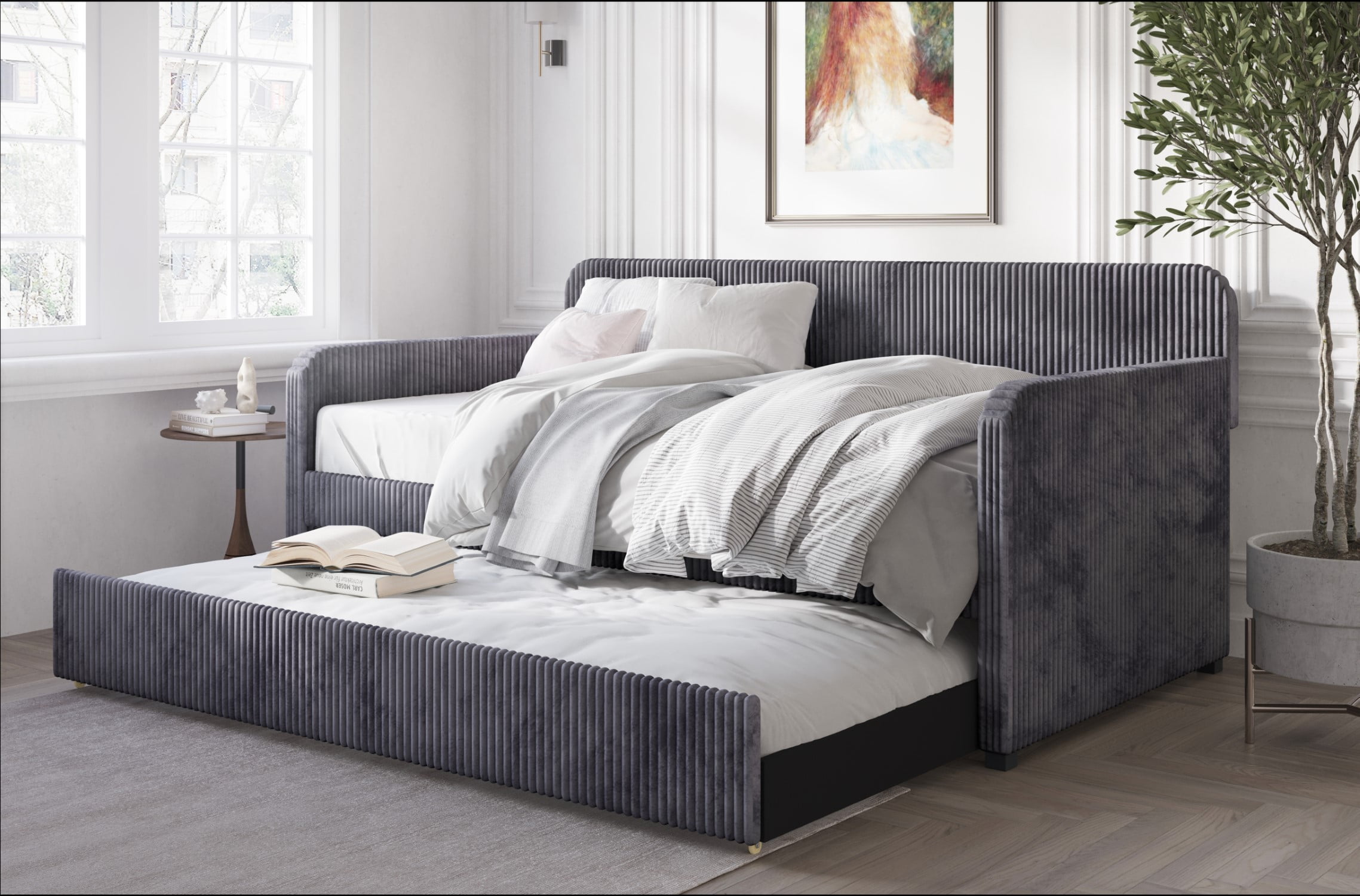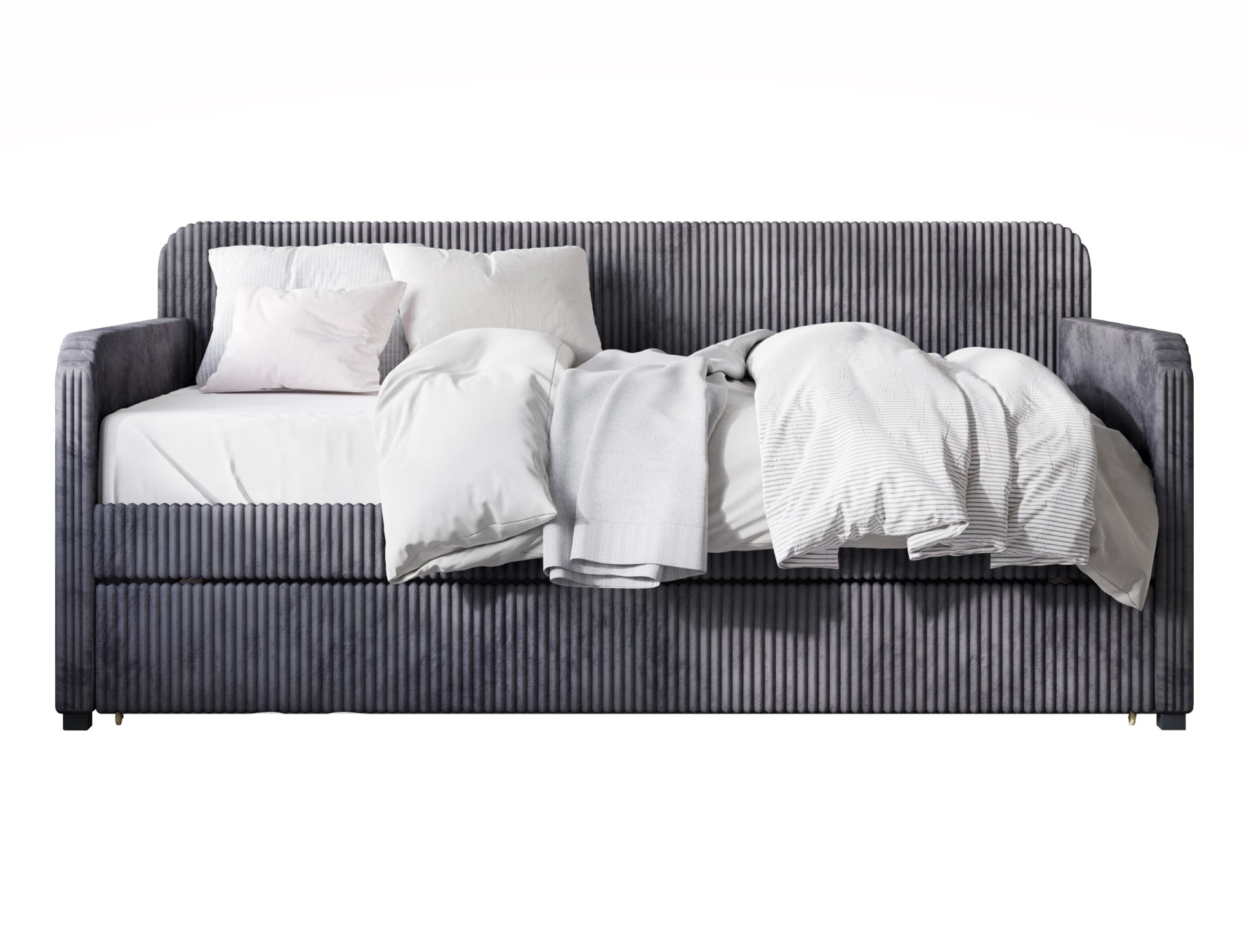 High-quality velvet upholstery daybed with vertically stitched tufting Perfect style for adult who love minimalist concept Fit perfectly in your bedroom, guest room or office Easy to assemble Mattress Not Included