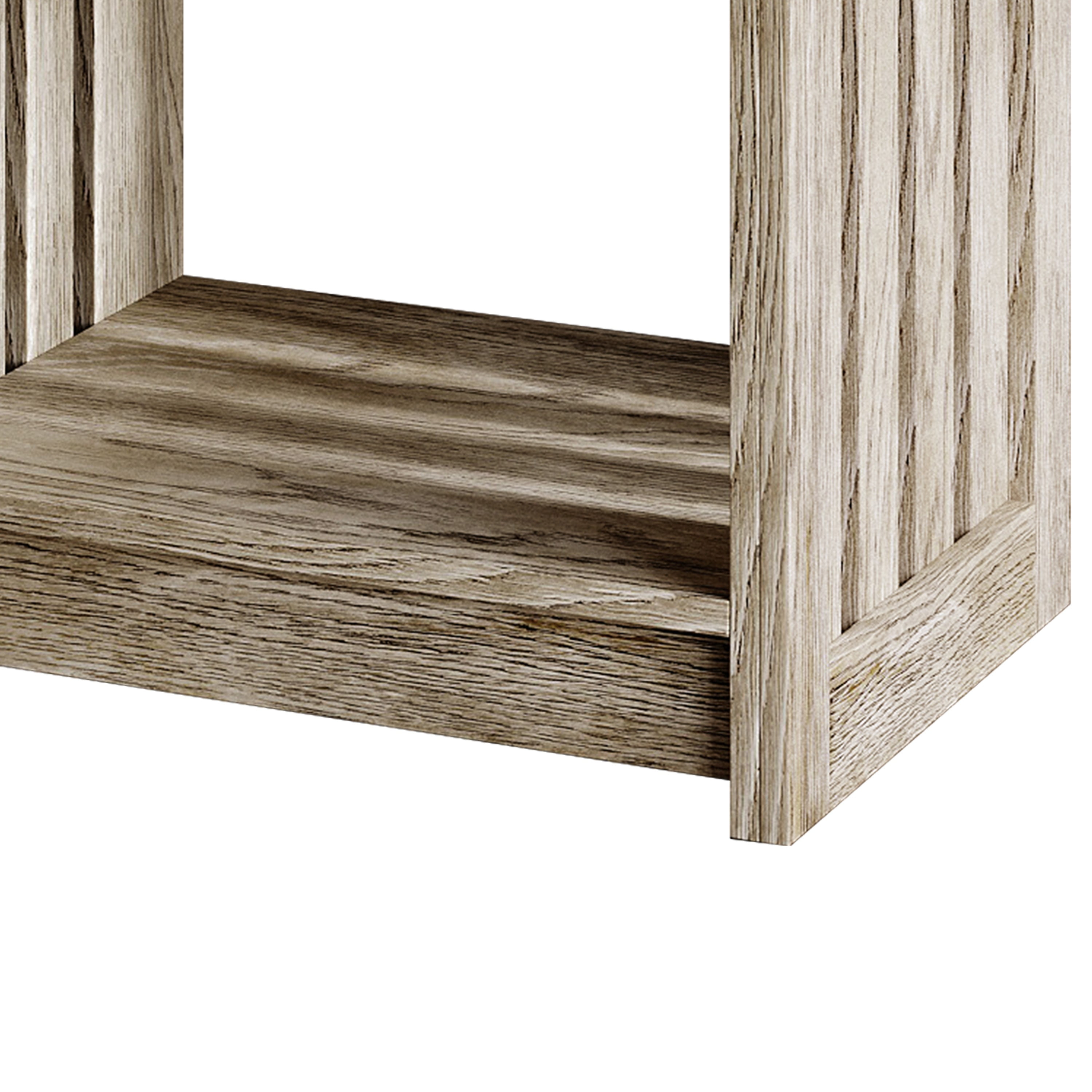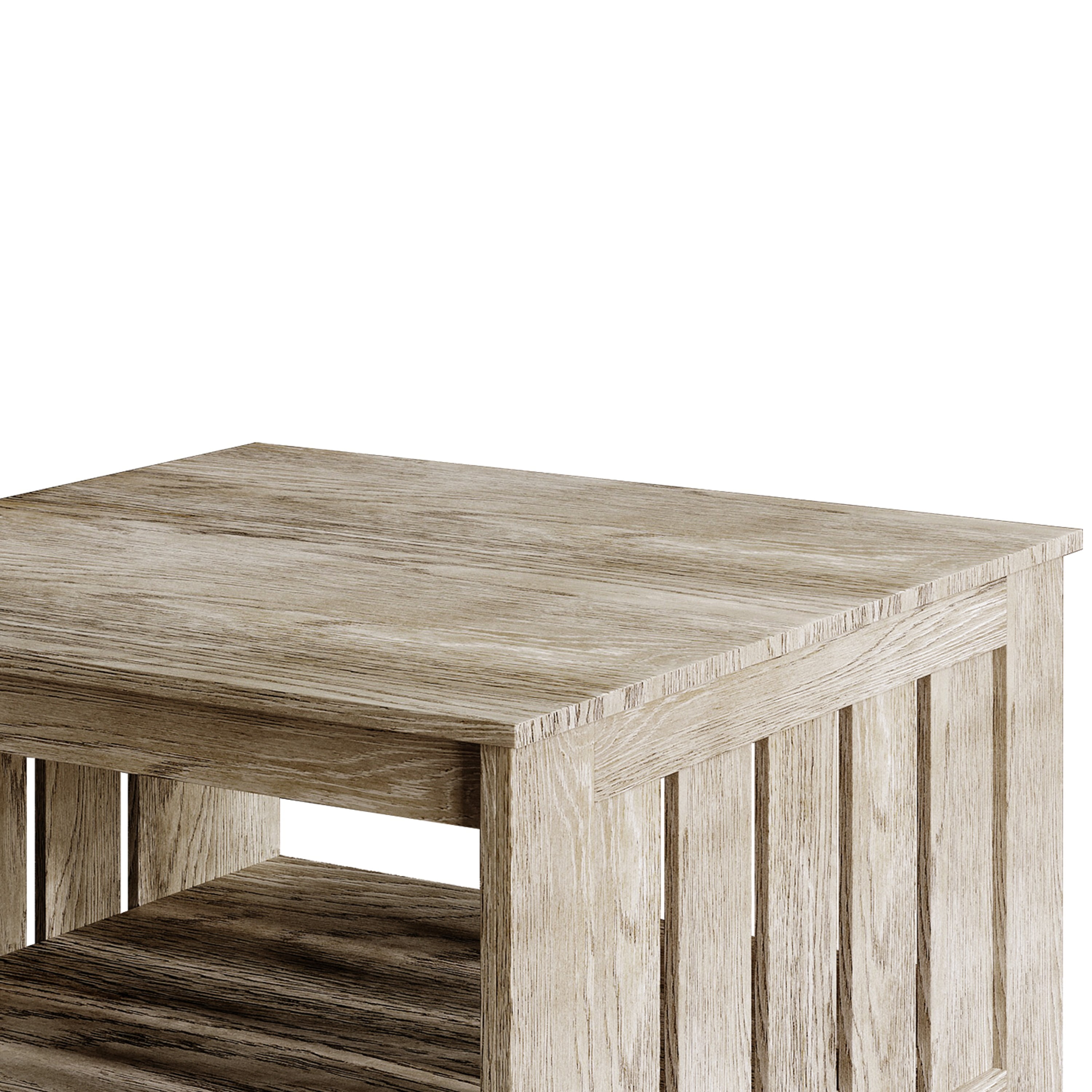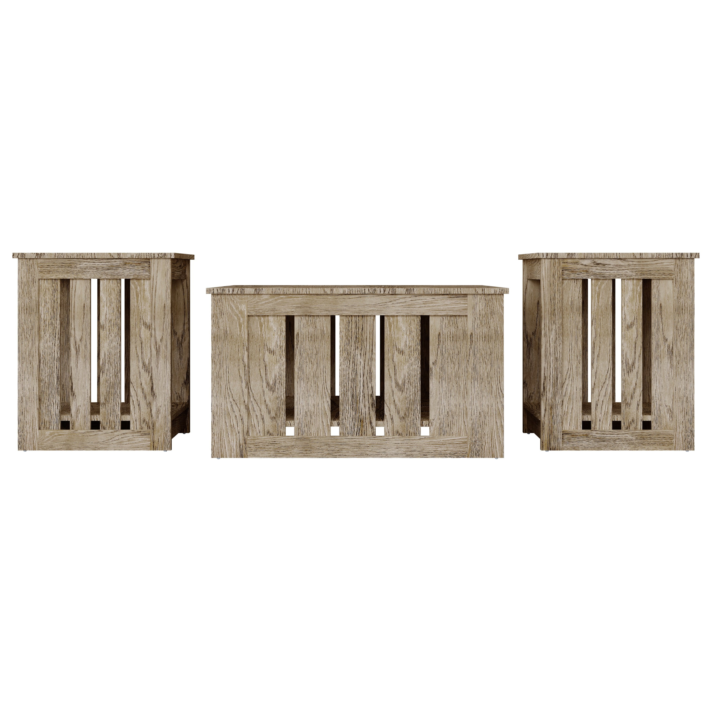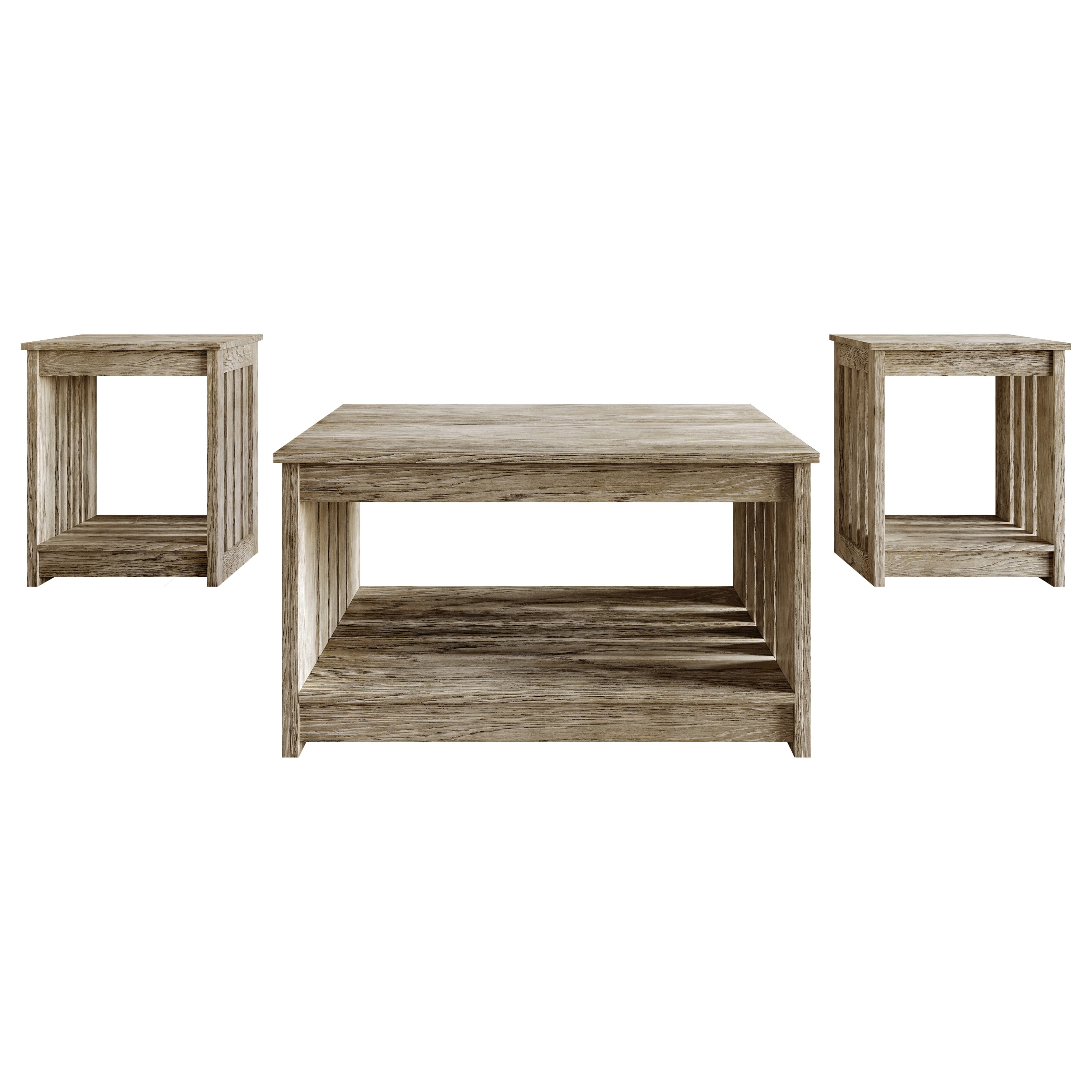 Open lower shelves offer convenient storage and easy access to everyday essentials like books, baskets, or decor. Slatted wood sides add a distinctive, rustic charm that enhances the farmhouse-inspired design. Includes one coffee table and two matching end tables to create a cohesive and balanced look in your living space