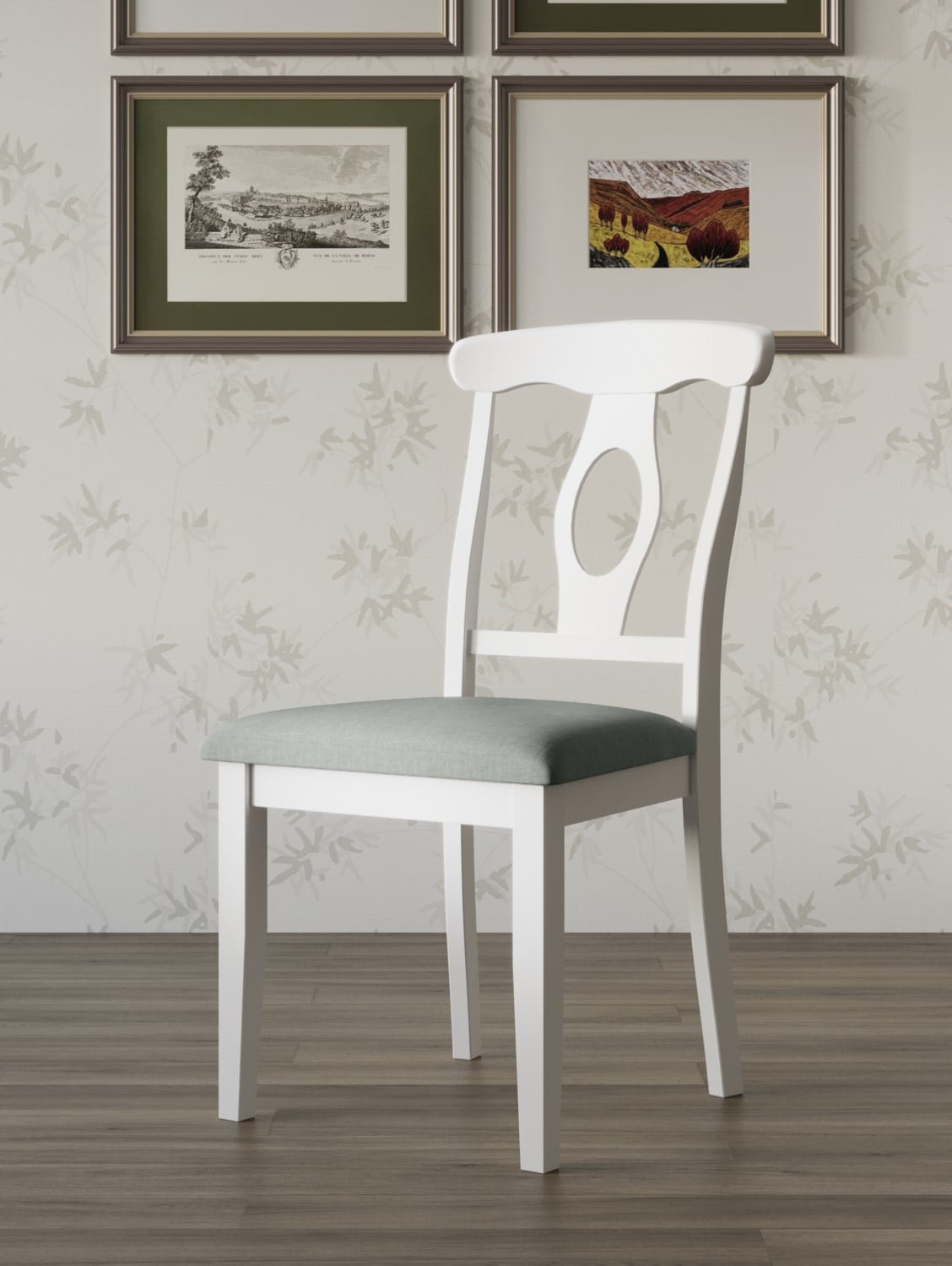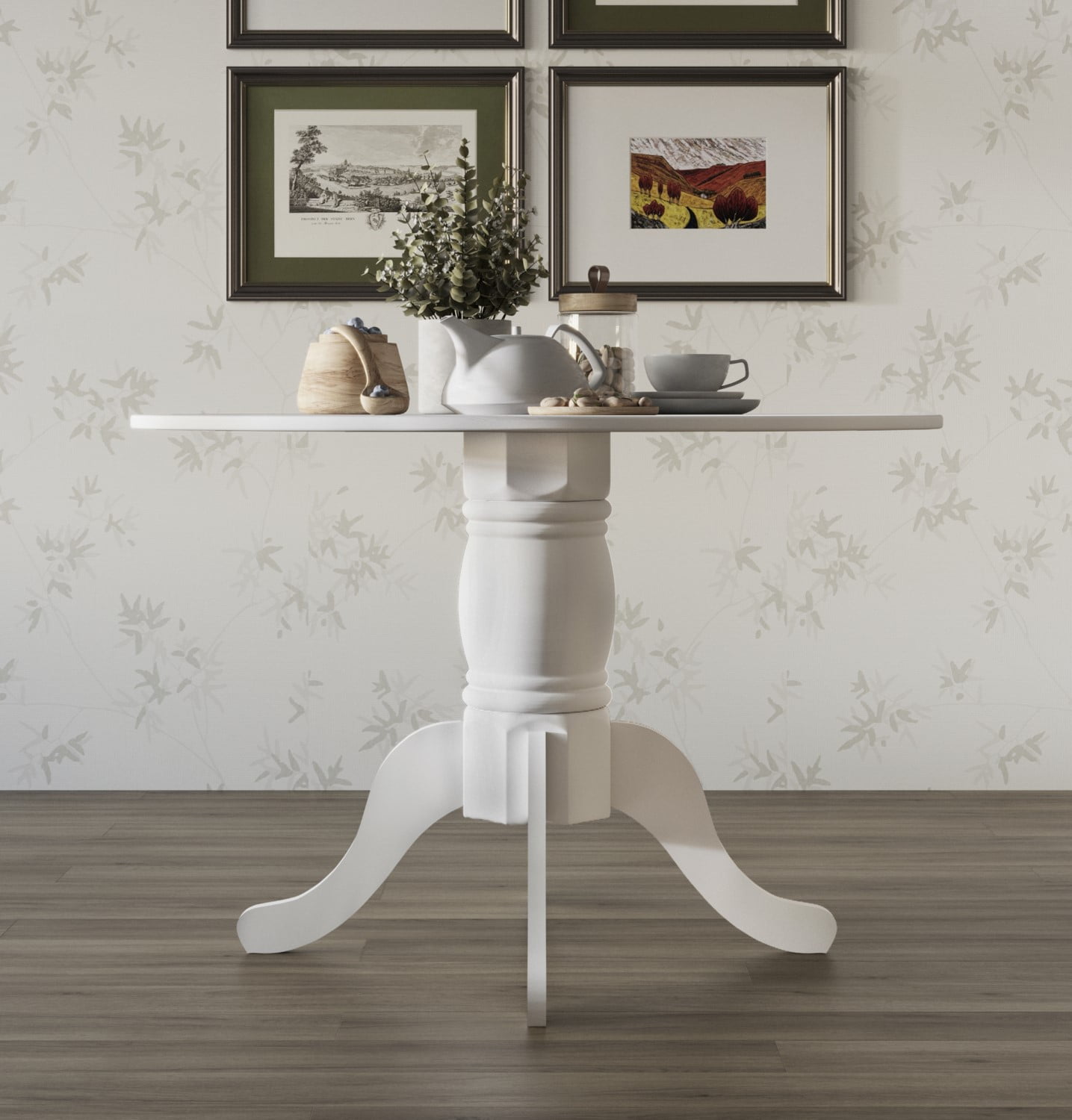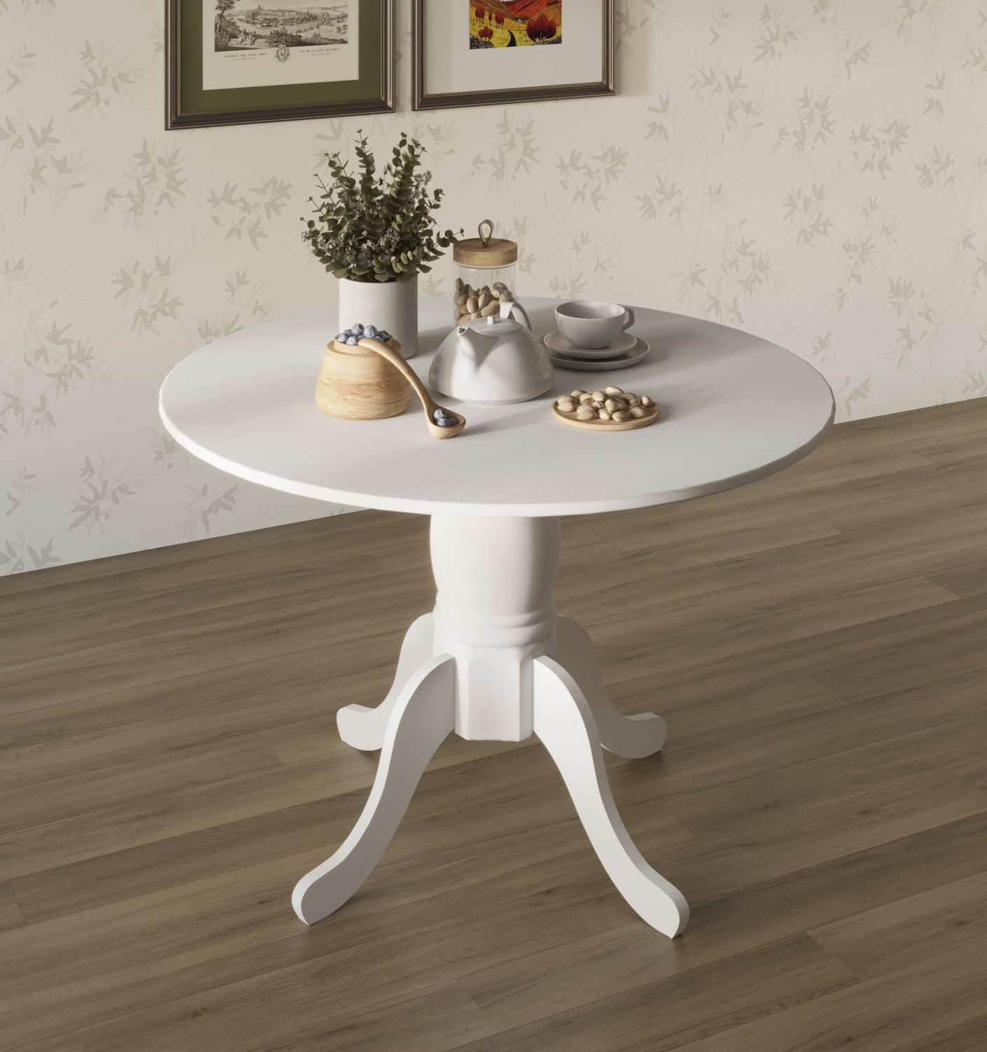 It includes one dining table and four padded chair seat The dining table features a white round shape table top on a pedestal base with four curving feet to bring a unique style to your dining room Seatback for an open look more charming and comfortably padded seats