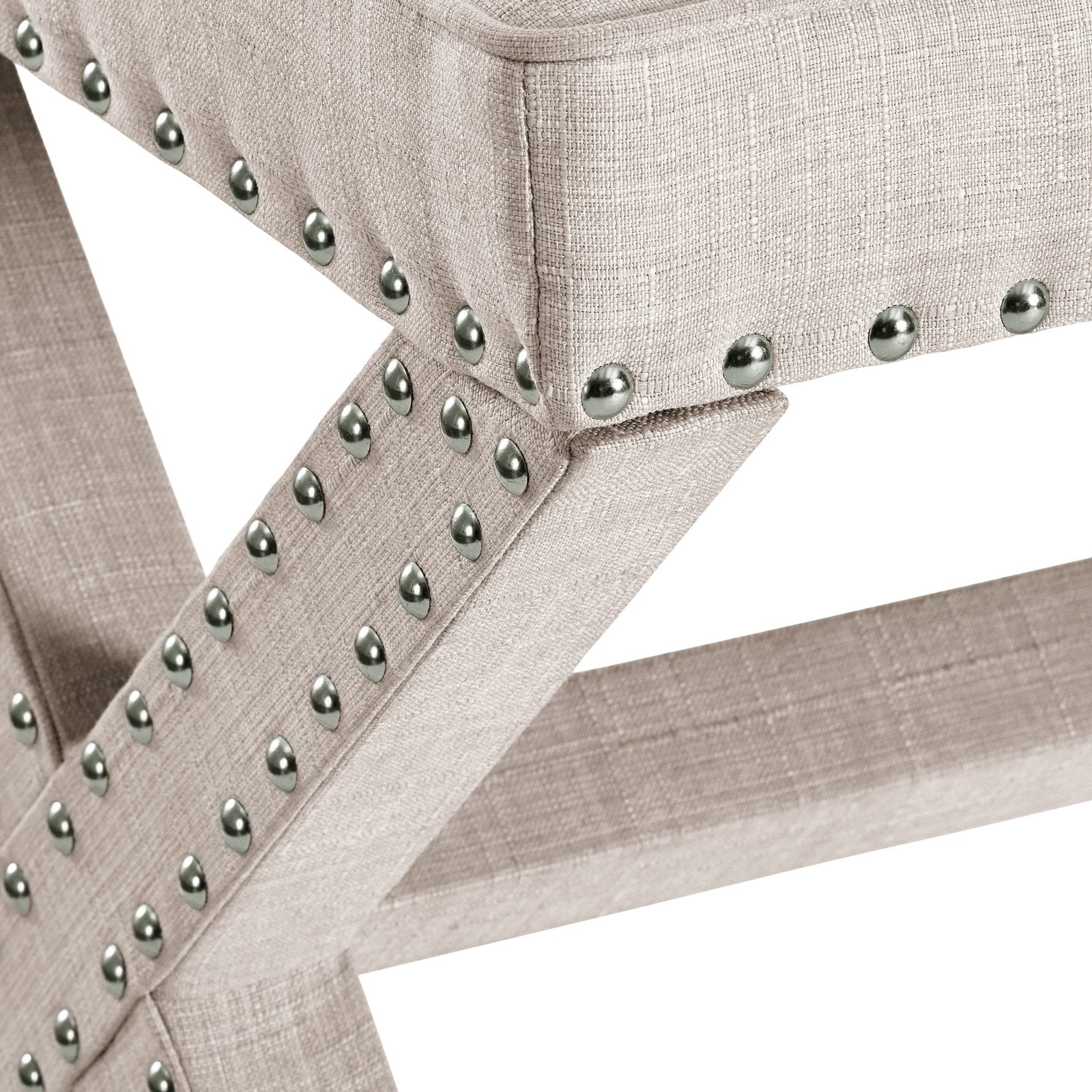 With style and functionality, the Beige Upholstered ‘X’ Base Bed Bench offers a durable, linen-like fabric cover in a neutral beige colorway. The plush foam padded top provides comfortable seating. Full of sophisticated style, this bench pairs decorative brushed nickel nail head trim and a unique ‘X’ style base with stretcher. Its smooth, padded top makes this bench an ideal place to display a tray or sit to put on shoes before heading out the door. With unmatched design, the Beige Upholstered ‘X’ Base Bed Bench would be a nice addition to any room in your home.Durable, linen-like fabric cover in a neutral beige colorway.Unique ‘X’ style base with stretcher.Plush foam padding for comfort .Brushed nickel nail head accenting on seat and ‘X’ base Features : Transitional style, this bench offers function and style Padded top provides comfortable seating or an ideal place to display home decor Offers a durable, linen like fabric cover in a neutral beige Decorative brushed nickel nail head trim and a unique X design base Crafted with solid wood legs, manufactured wood, fabric, and foam for inviting comfort Assembly is required; hardware kit and instructions included. Specifications : Product Dimensions : 48.00″ W X 17.00″ D X 18.00″ H Product Weight : 30.29 lbs Weight Capacity : 250 lbs