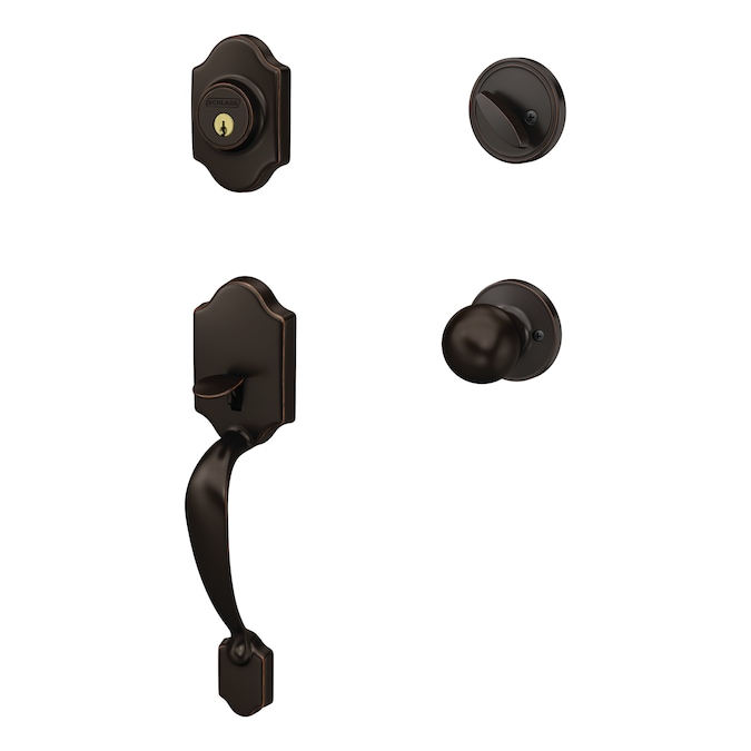 - FUNCTION: Handleset includes deadbolt with keyed outside/thumb turn inside, a front entry handleset grip with non-locking interior knob, and 2 keys