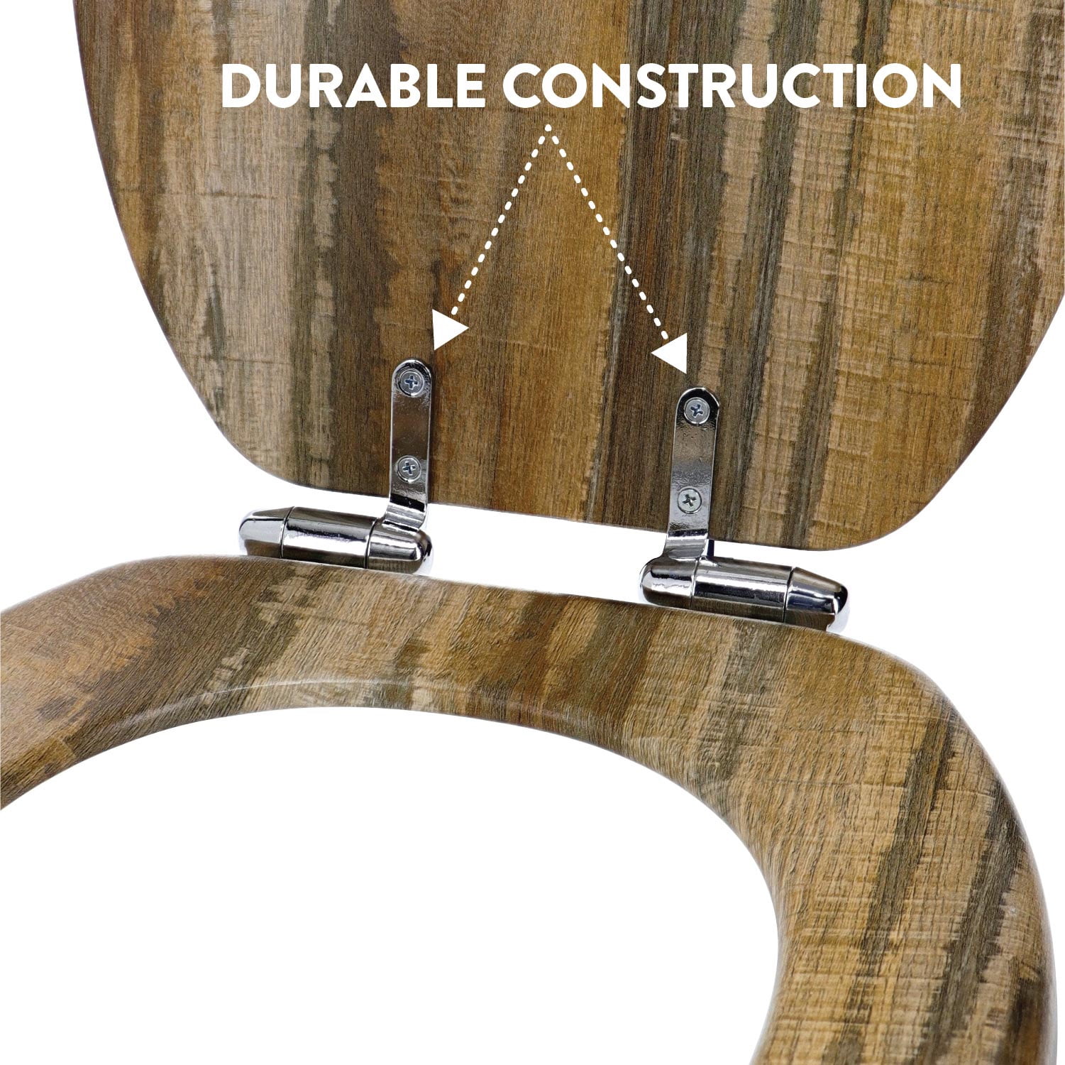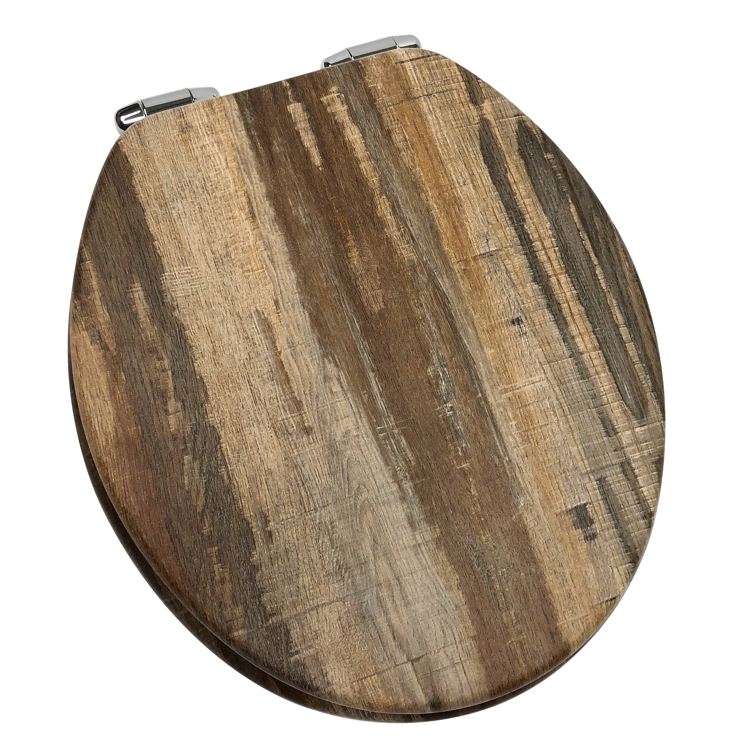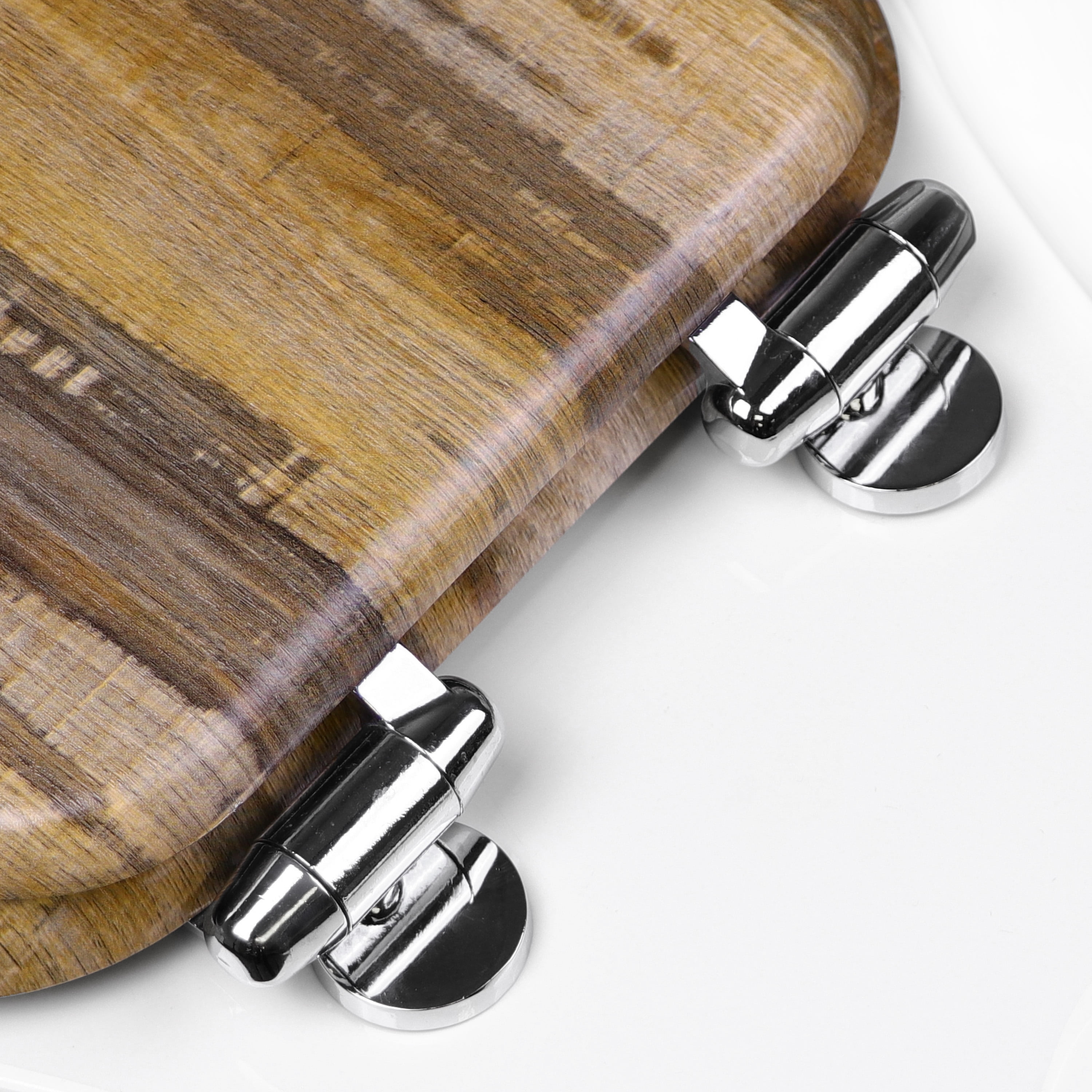 Each seat is crafted with a contemporary, distressed wood look for a sophisticated touch of style to your bathroom. Equipped with a slow close lid and seat, this toilet seat gently glides closed helping to avoid pinched fingers and loud slams The chrome-plated hinges are an understated design element that makes this toilet seat an even more welcome addition to your bathroom. These hinges not only look great, but they fit snug onto your toilet and won’t wiggle around or come loose over time. All hardware is included to ensure a strong fit. This standard, round seat fits on almost all round toilets with ease and will upgrade the overall look and feel of your bathroom. When it comes to cleaning, simply use mild cleaners, or soap and water, to wipe clean.