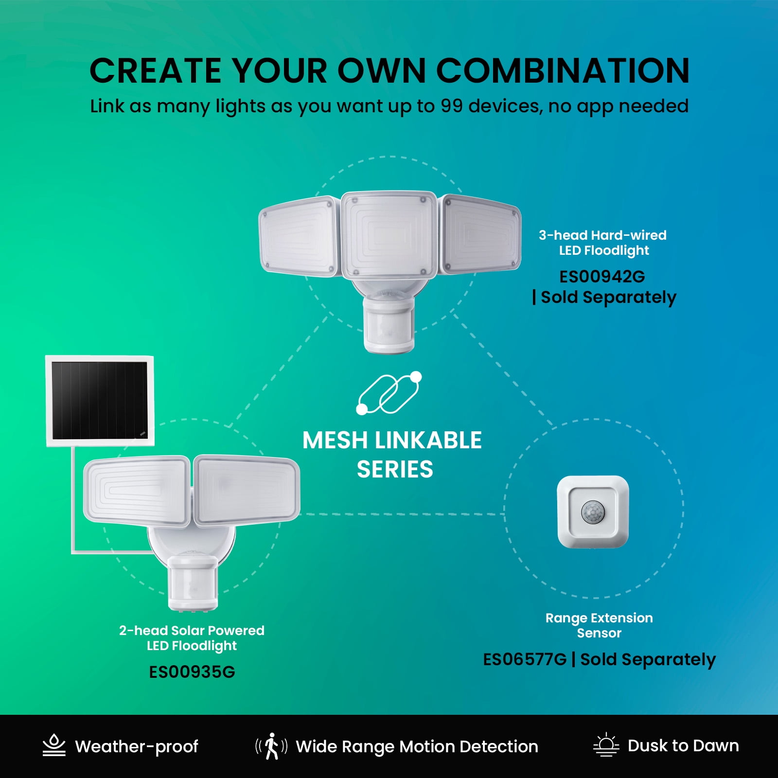 Solar panel with 1.2W power and 15 feet detachable wire Comes with 3 rechargeable 1.2V 2000mAh Ni-MH batteries Wide sensor detect range of 40 feet x 180 degree Adjustable delay time options of Test, 30s, 60s, or 120s Adjustable sensitivity range Linkable function with 4 channels selection to connect with other Home Zone security lights Made of durable plastic construction Illumination output of approximately 1,500 lumens at 5,000K color temperature Equipped with On-Off-Auto switch control Powered by 3 rechargeable 1.2V 2,000mAh Ni-Mh batteries.