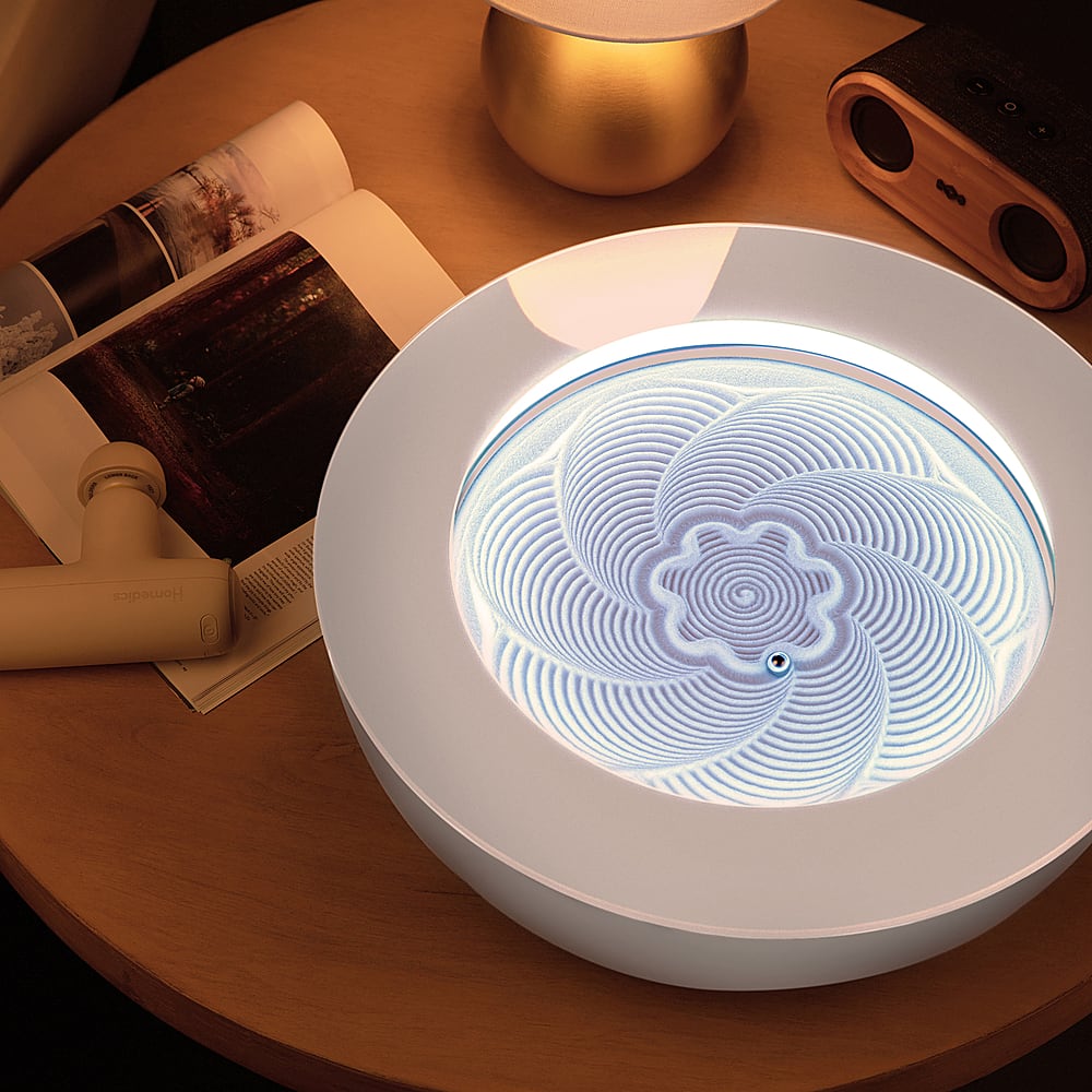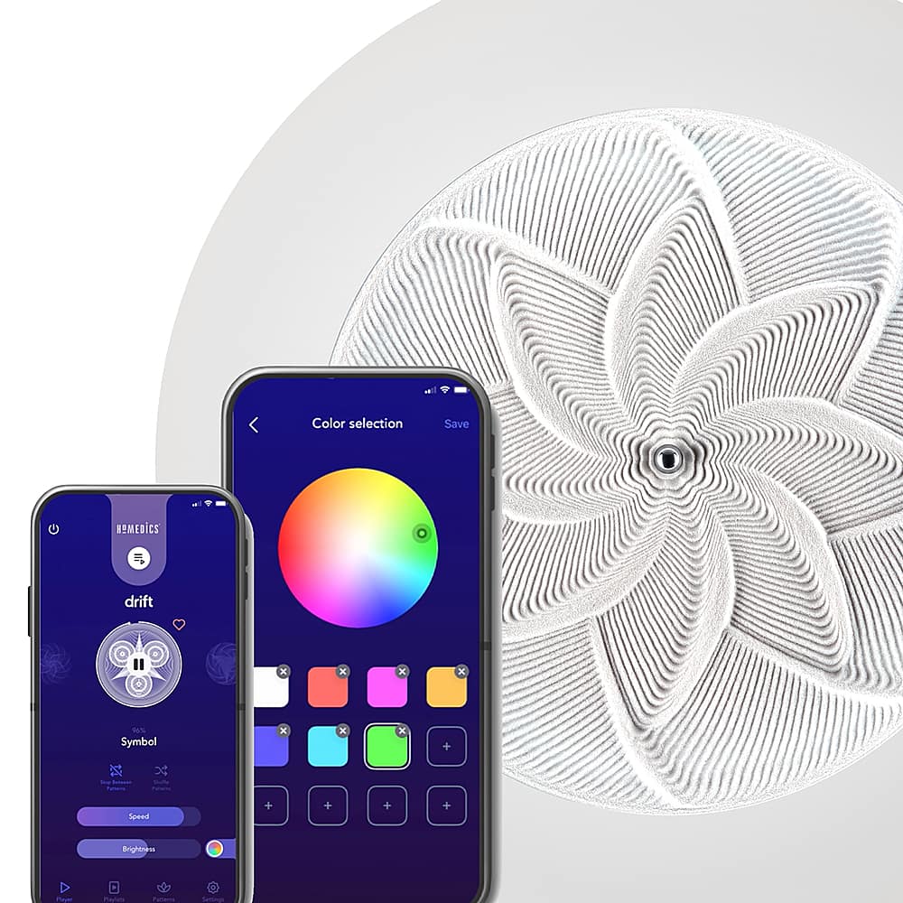 The Homedics 16″ drift sandscape elevates your space and mind, leaving you free to daydream, focus, and create. The metal sphere takes your eyes on a soothing journey through hundreds of ever changing patterns and colors. Customize your ambience with mesmerizing LED mood-lights that you can control from the app. The shifting sands allow you to drift whenever and wherever, to increase relaxation, inspire creativity, boost your mood, and enhance focus. Start to drift in 4 easy steps. After a quick and easy assembly, power up your sandscape by plugging it into an outlet near a desk or side table. Download the app and follow the simple setup instructions, then turn on your sandscape to drift and invite calm in.