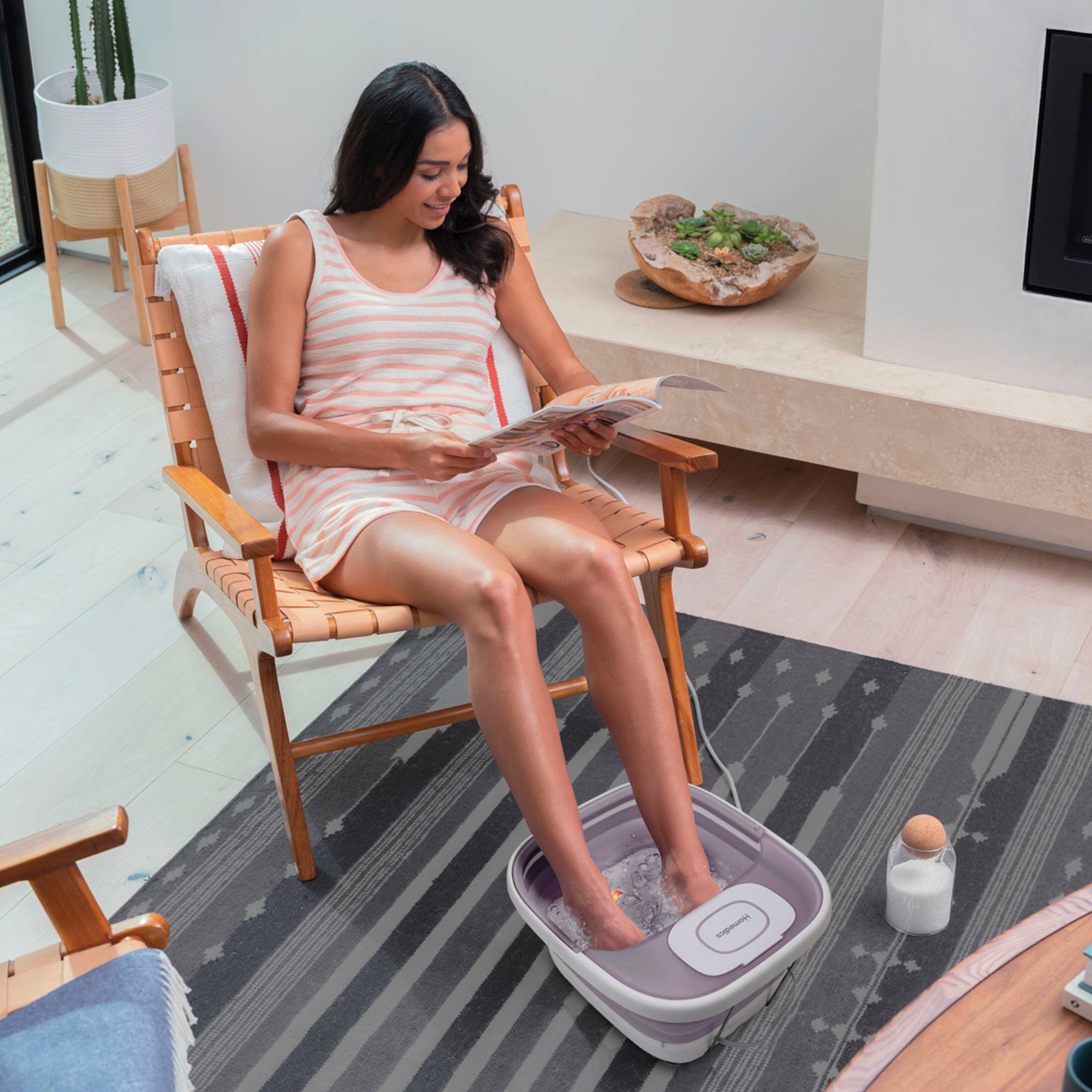 Wake up your feet with the Homedics Smart Space Deluxe Footbath with Heat Boost. Invigorating bubbles deliver total bliss for your arches, soles, and heels, while 3 pedicure attachments and an ergonomic footbed with massaging silicone bristles deliver added comfort and relaxation. Add your favorite bath salts and let the Heat Boost Power heat your water to the perfect temperature in minutes so you can swiftly settle in and enjoy the soak. Easy to fold up and store and fitted with our patented safety-lock system and convenient carry handle, the Homedics Smart Space Deluxe Footbath with Heat Boost delivers the luxurious at-home spa experience your feet deserve.