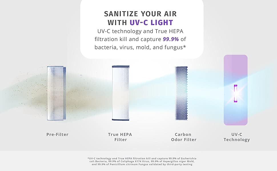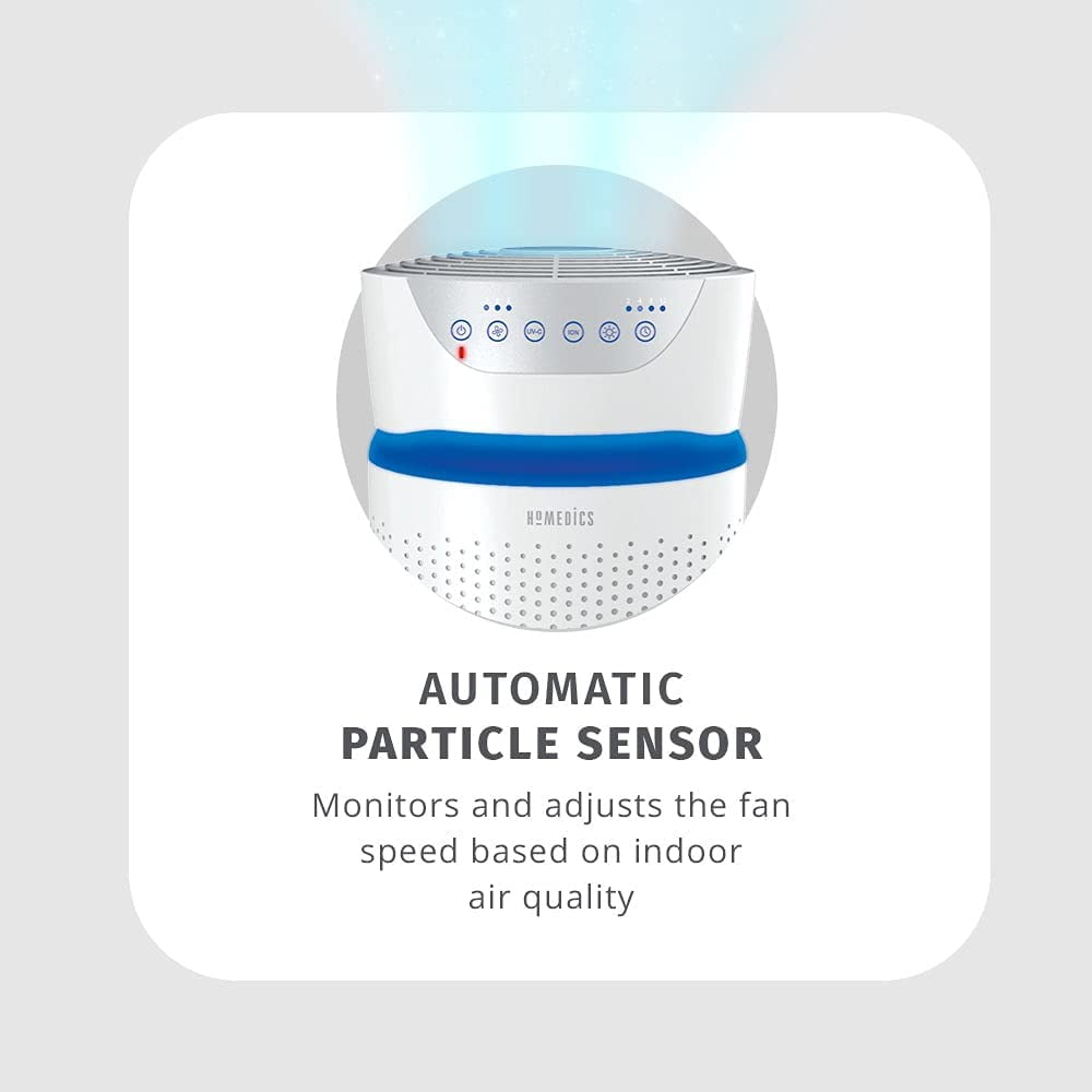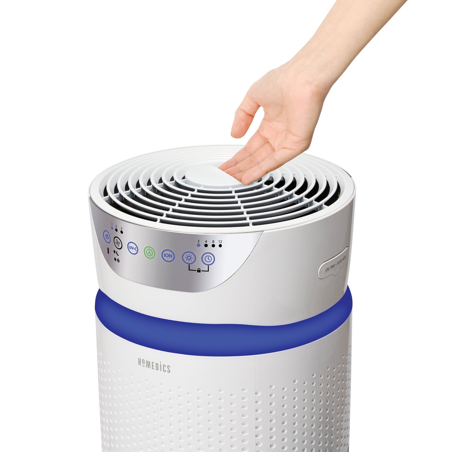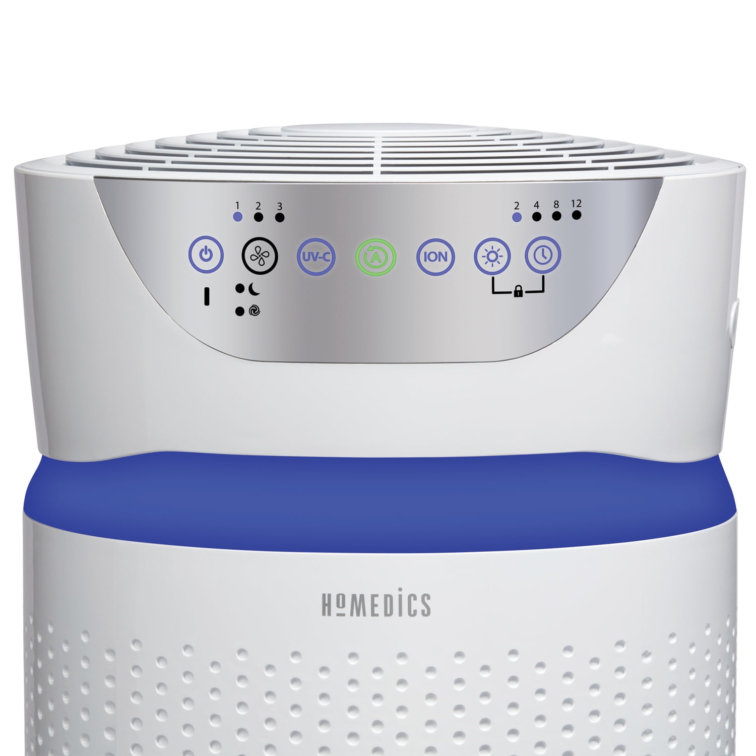 BREATHE EASIER – The Homedics 5-in-1 UV-C Air Purifier reduces pollen, pet dander, germs, smoke, and more with 5 lines of defense to achieve clean air for all; perfect as a large room air purifier and for spaces up to 1,192 sq. ft COMPLETE CLEAN – UV-C technology and HEPA-type filtration reduce and capture 99.97% of airborne particles*; built-in carbon air filter reduces odor and VOCs while the pre-filter captures larger particles; turn on the air ionizer to enhance purification SET YOUR PERFECT MOOD – The perfect bedtime mood can be set in seconds with the optional night-light; add your favorite scent to the HEPA home air purifiers with 3 included essential oil pads and pair with Ellia Essential Oils (sold separately) CUSTOMIZED SETTINGS – Choose from 3 speed settings on the ionizer air purifier to customize your clean; built-in auto-off timer for timed use up to 12 hours WHAT’S IN THE BOX – (1) Large Homedics 5-in-1 Air Purifier, (1) HEPA-type filter with built-in pre-filter and carbon odor filter, (3) essential oil pads, (1) quick start -guide