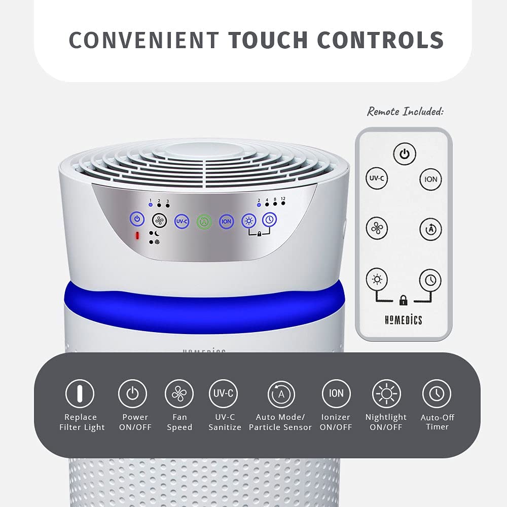 HoMedics TotalClean Indoor Tower Carbon Air Filter with UV-C, Ideal for Allergies and Asthma, Remote Control