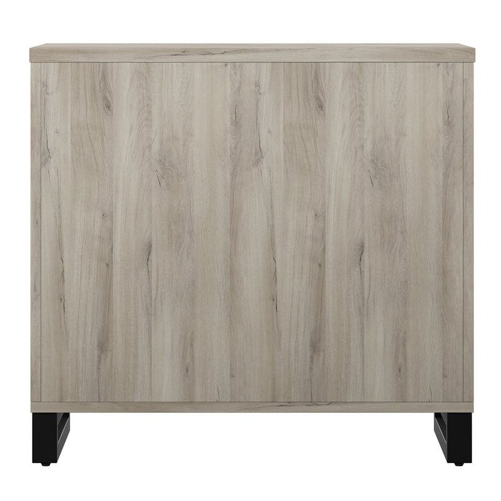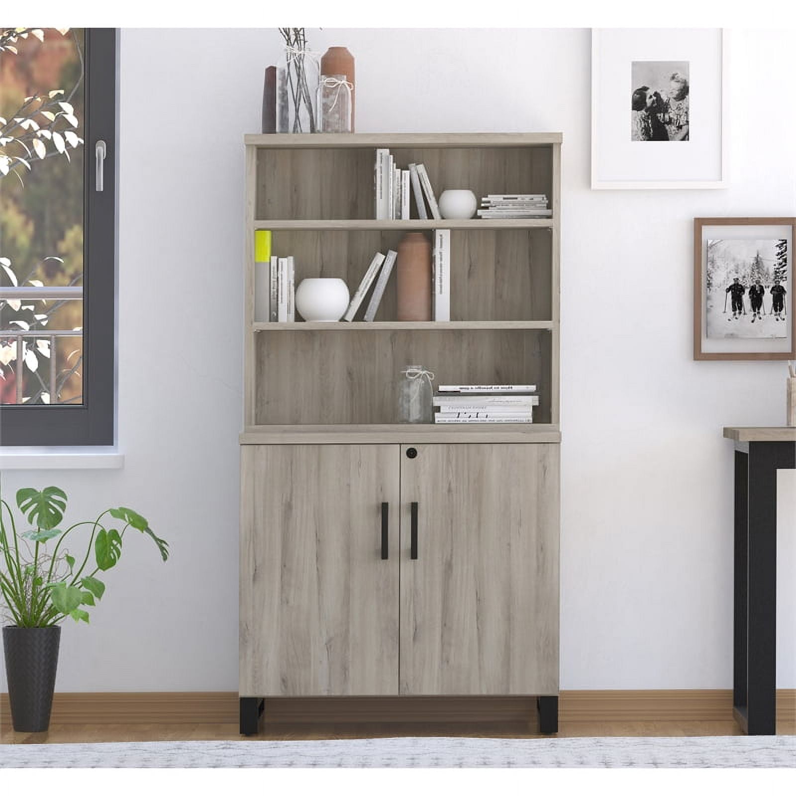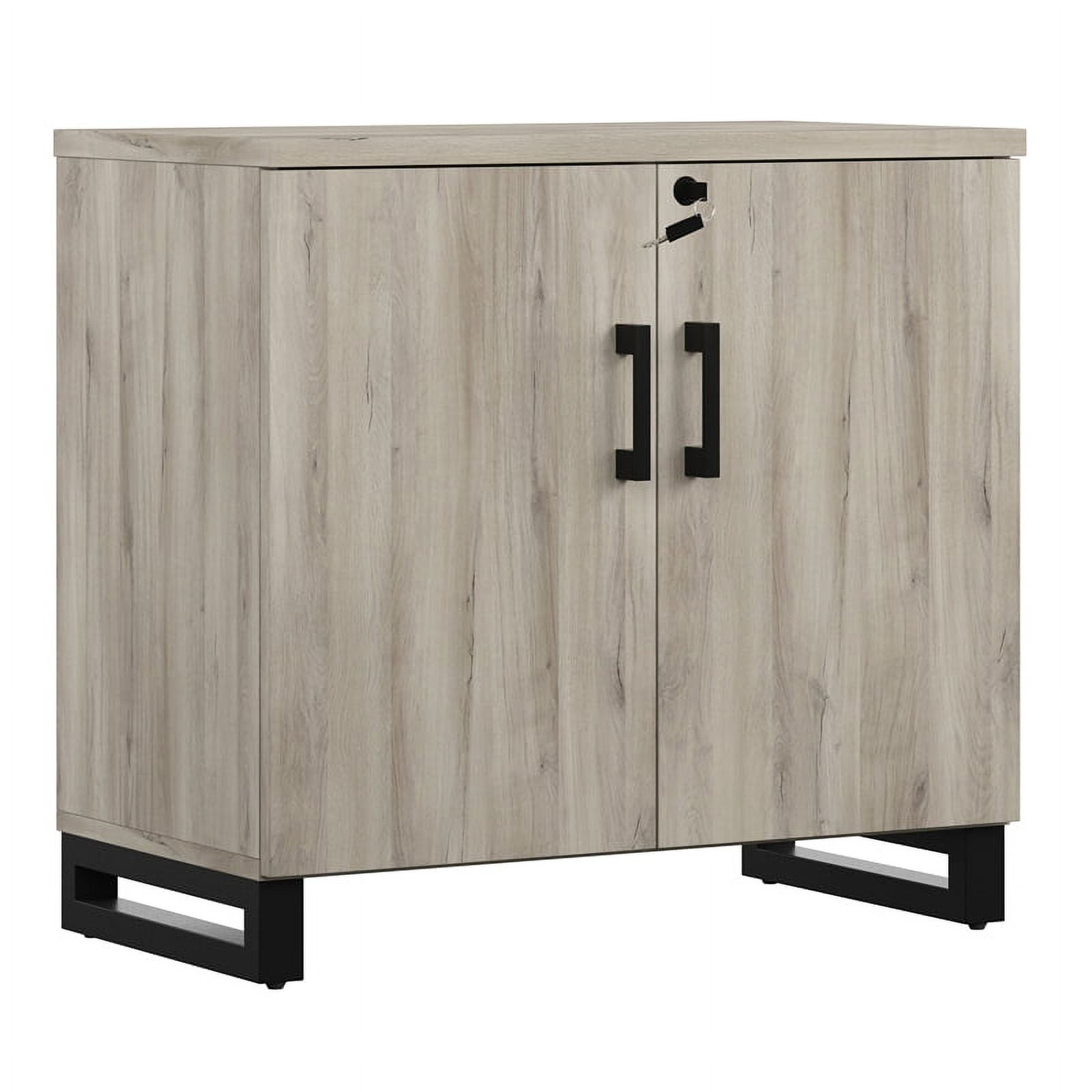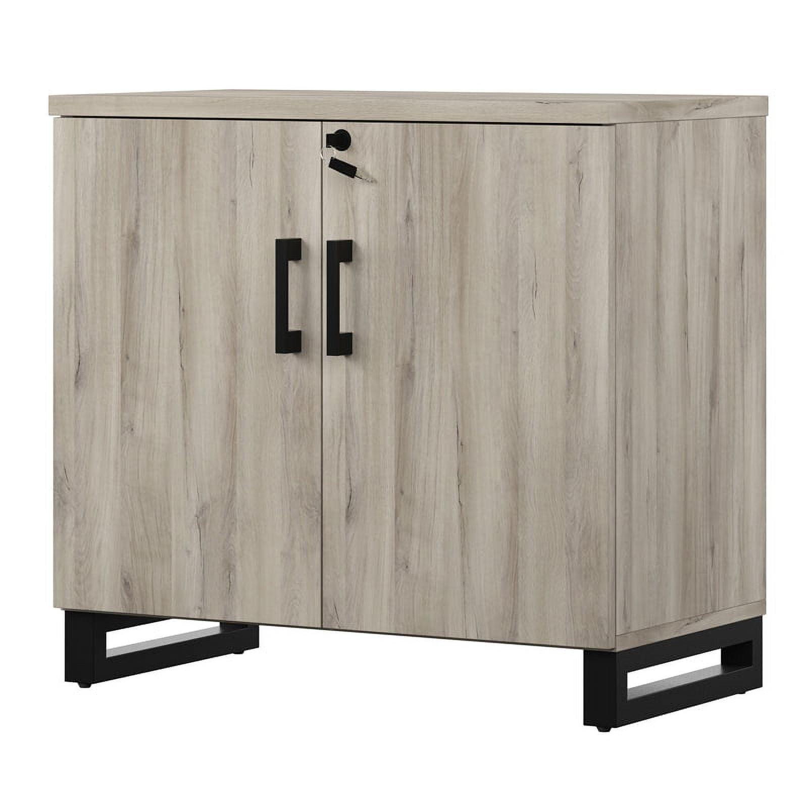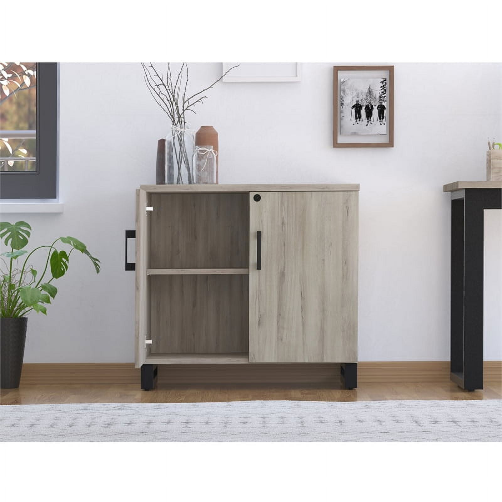 The HomeFare Industrial Farmhouse Storage Cabinet features a gray replicated weathered oak finish and contrasting black accents, that combines industrial and farmhouse styling. This on-trend piece is sure to bring style to your home office and create a picture-perfect workspace. It is constructed of durable rubberwood solids and textured melamine, that creates the look and feel of real wood. Melamine is easy to clean and extremely durable – it resists wear and water, to protect from spills and condensation. Two doors and locking feature provide a hidden and secure solution to your storage needs and an adjustable shelf allows for versatility. This piece coordinates with other items in the Apex Collection, like the Apex Industrial Farmhouse 3 Shelf Bookcase (sold separately).