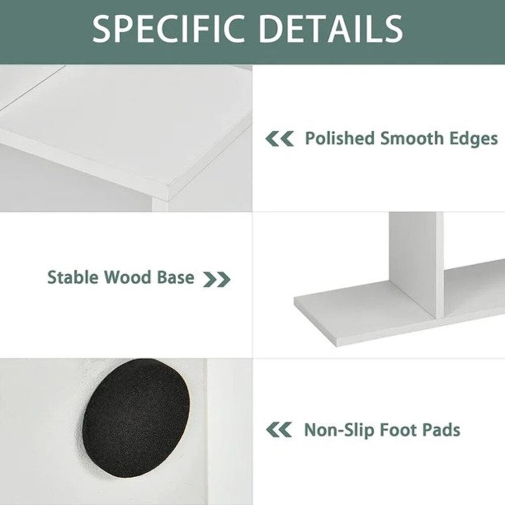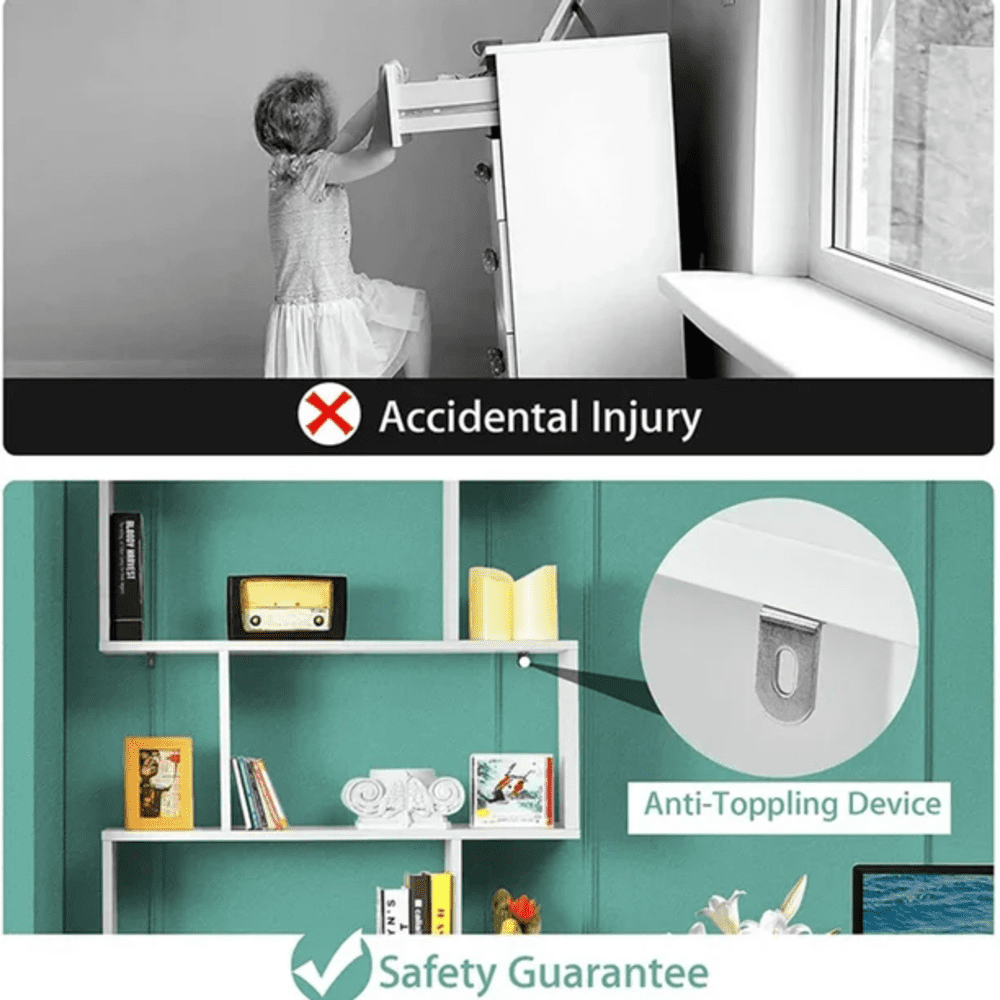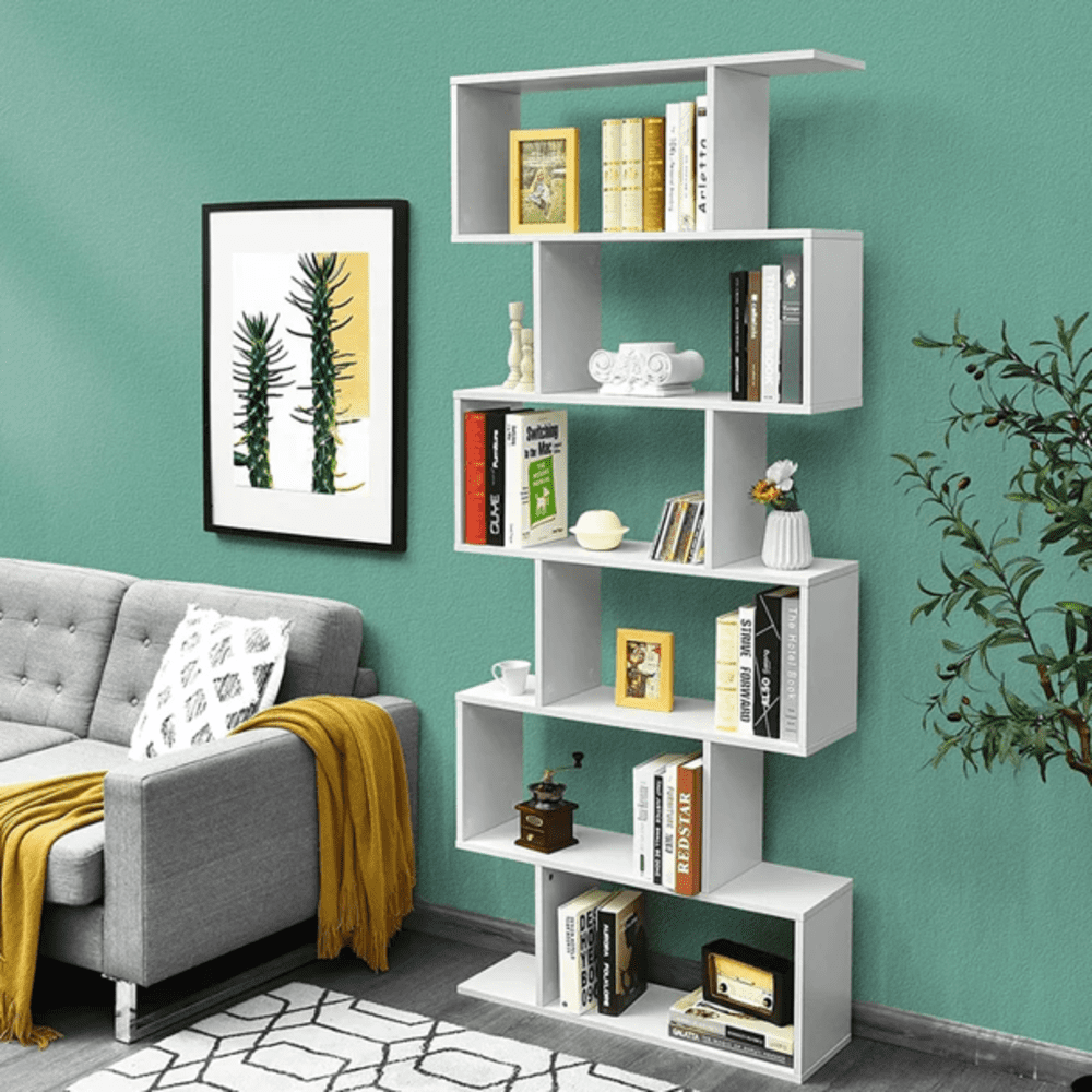 Open Storage Space: 6 Tier shelves with a unique open design make this bookcase easy to store or display things, suitable for storing books, ornaments, CDs, and many others. Elegant and Modern Design: The S-shape design bring a modern and fashionable appearance, and the shelves are equipped with anti-collapse accessories to prevent falling. Solid construction: Created with durable MDF board, each shelf has a suggested weight of up to 20 lbs of your favorite books, pictures, and ornaments. Wide Usage: The bookshelf is a great piece of home furniture that can be used as a bookcase, display shelf, shelving unit, storage unit, etc. It can be placed in the living room, study, office, or hallway Space-Saving Storage Shelf: Designed with 5 spacious compartments, the bookshelf offers ample storage space for keeping your decorative items well organized and within reach. Anti-tilting Design for Safety: When set against the wall, the 6-tier bookshelf can be fixed with an anti-tilting anchor in case of any wobbling or collapsing due to heavy loading or collision.