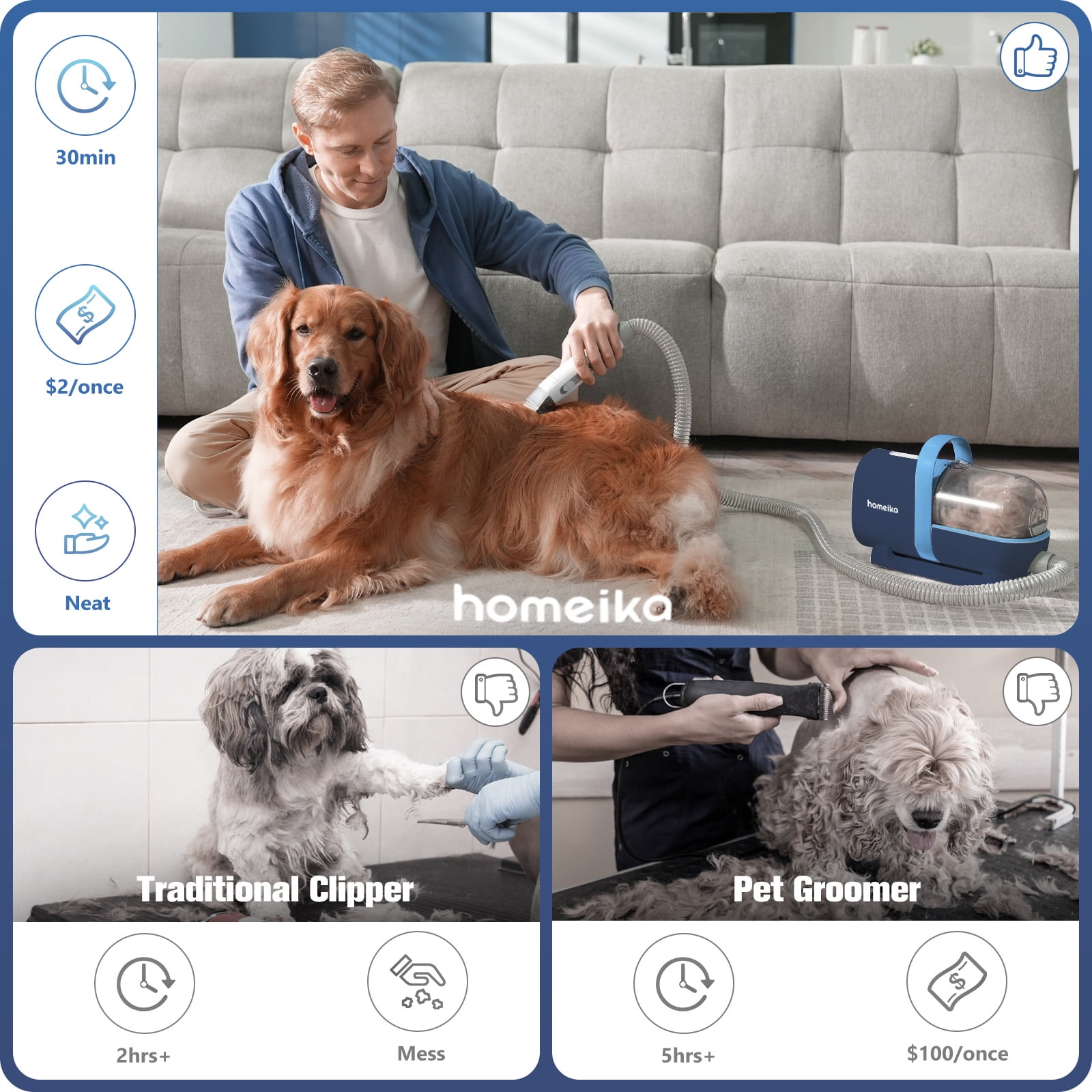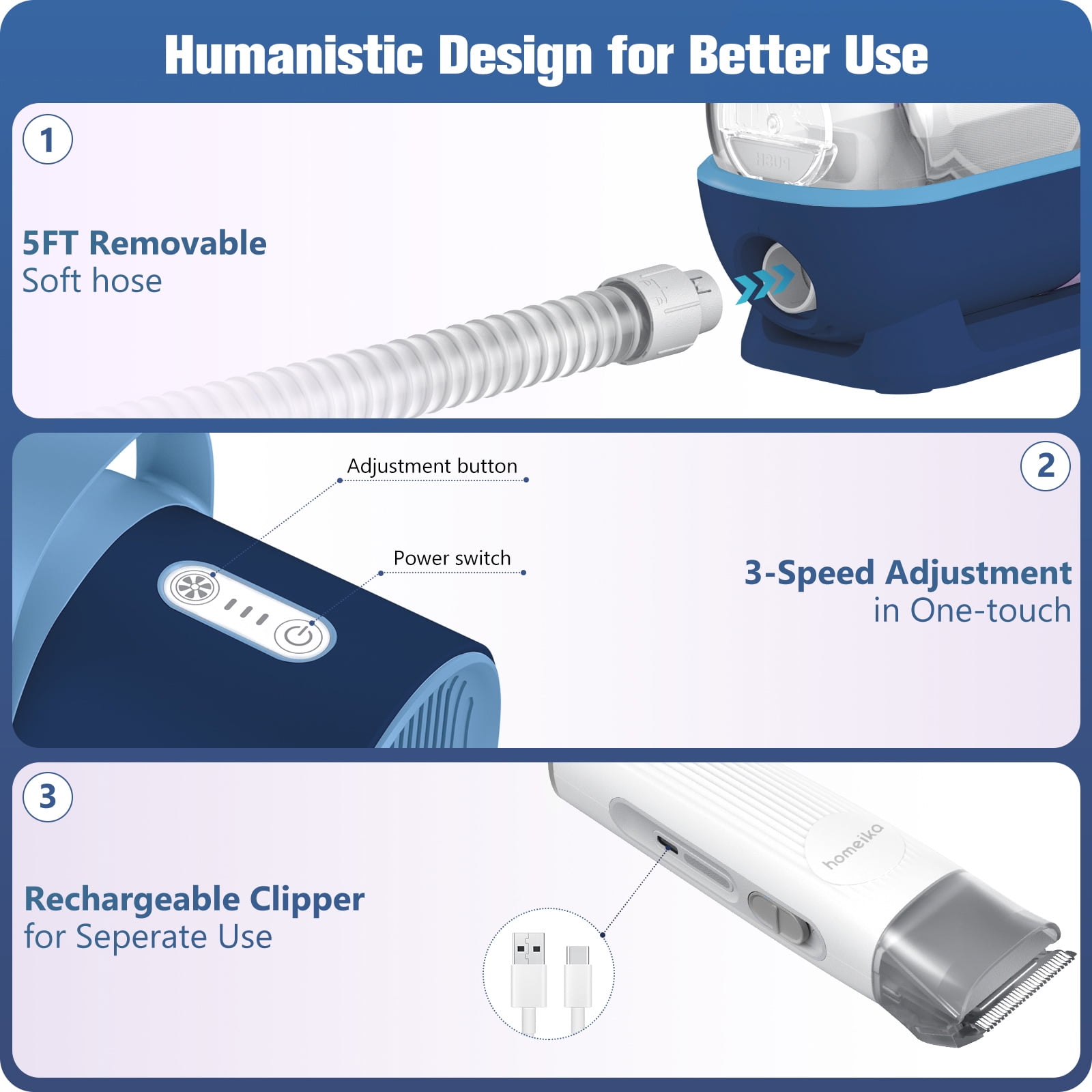 Homeika pet grooming kit with super quiet vacuum function can collects 99% of pet fur while trimming, grooming and deshedding. Keep your home and furniture away from messy pet hair. Our dog hair vacuum comes with 8 proven tools: grooming brush and de-shedding brush help to promote a sleek and healthier hair; electric hair clipper with 6 guard combs to do the haircut; paw trimmer helps to delicate areas; nail grinder to polish nails. Nozzle head and cleaning brush can be used for collecting hair on sofa, gap, carpet and floor. The adjustable electric clipper with 6 guidance combs provided (3mm/6mm/9mm/12mm/ 18mm/ 23mm) is applicable for shaving pet hair of different lengths. Upgrade stainless steel blade is for you to style your pet’s hair at home. Detachable blades and guide combs are easy to change and clean. Our pet vacuum groomer’s lowest noise is below 50 dB, and it has 3 adjustable suction levels to choose. The electric wireless clipper, paw trimmer and nail grinder can be used without hose. We recommend using the clipper alone first or using a low suction to help your little pet feel at ease. The professional dog grooming tools is equipped with a 1.5L dust cup. The 30% larger capacity lets you clean the dust cup less often while trimming for greater efficiency. Empty the dust cup without hand touch. Storage bag is included for easy storage. Simple operation makes every trimming more enjoyable. The dog grooming vacuum for shedding comes with everything you need to give your pooch a DIY salon day. You can DIY your pup’s haircuts instead of making monthly trips to the dog groomers.Best gift for your friends/family member/partner with pets. ????Vacuum Feature: Input: 120V~60Hz Power: 300W Hose Length: 5FT Net Weight: 6.68 LB Decibel: 50-75dB Dust Cup Capacity: 1.5L Suction Power: 4KPa-7KPa-10KPa Electric Wireless Clipper Input:DC 5V 1A Power: 5W Charging Time: 3 Hours Discharge Tima:2.5 Hours Li-ion Battery: 3.7V 18650 1400mAH What’s in the Box? Vacuum Device *1 5FT Hose *1 Grooming Brush *1 DeShedding Brush *1 Cleaning Brush *1 Long Head Nozzle *1 Cordless Electric Clipper *1 Clipper Blade *1 Pet Paw Trimmer *1 Pet Nail Grinder *1 6 Guide Combs:3mm/6mm/9mm/12mm/18mm/23mm Storage Board *1 Sponge *2 Instruction manual *1 7*24-hours Customer Service ????Warm Tips Don’t use the machine on pets with wet coat Empty dustbin after each use