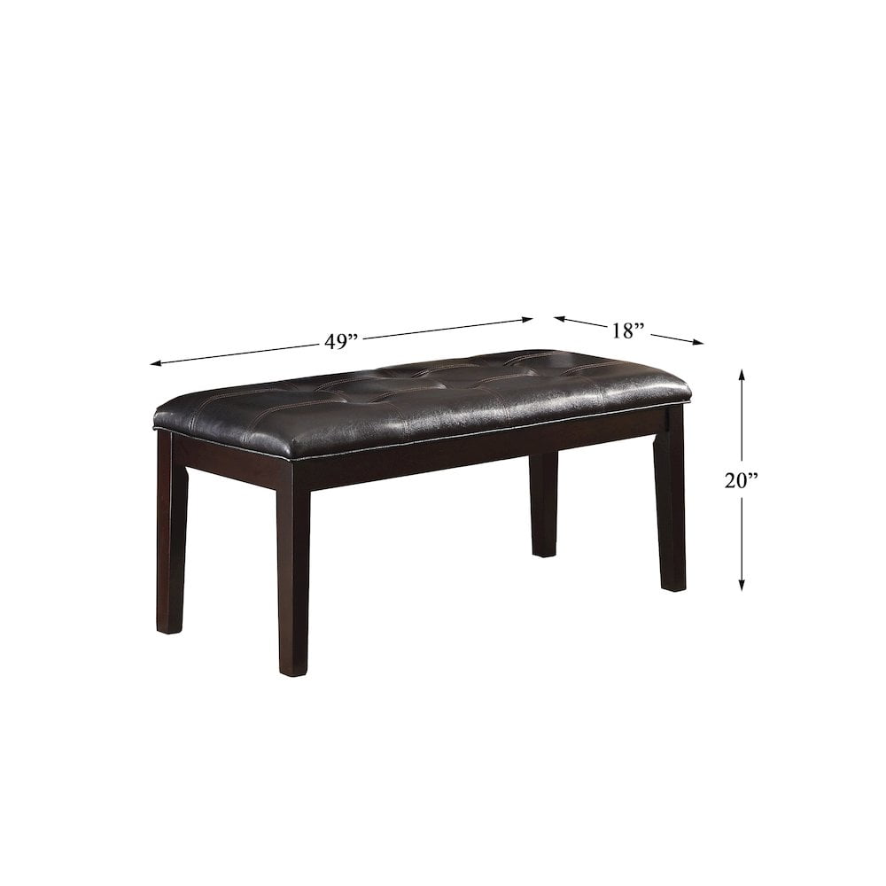A natural selection for your transitional home, the Teague Collection will compliment your lifestyle. This dining bench features brown faux leather and a espresso finish. Features: Materials: Wood Finish: Espresso Faux leather upholstery Button-tufted top Weight capacity: 300lbs Specifications: Product Dimensions: 20″H x 18″W x 49″D Product Weight: 27.5 lbs Seat Dimensions: 49″W x 18″D Seat Height: 20″