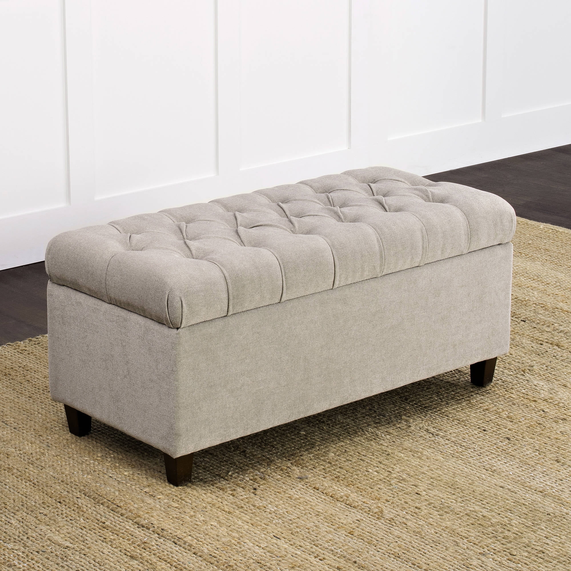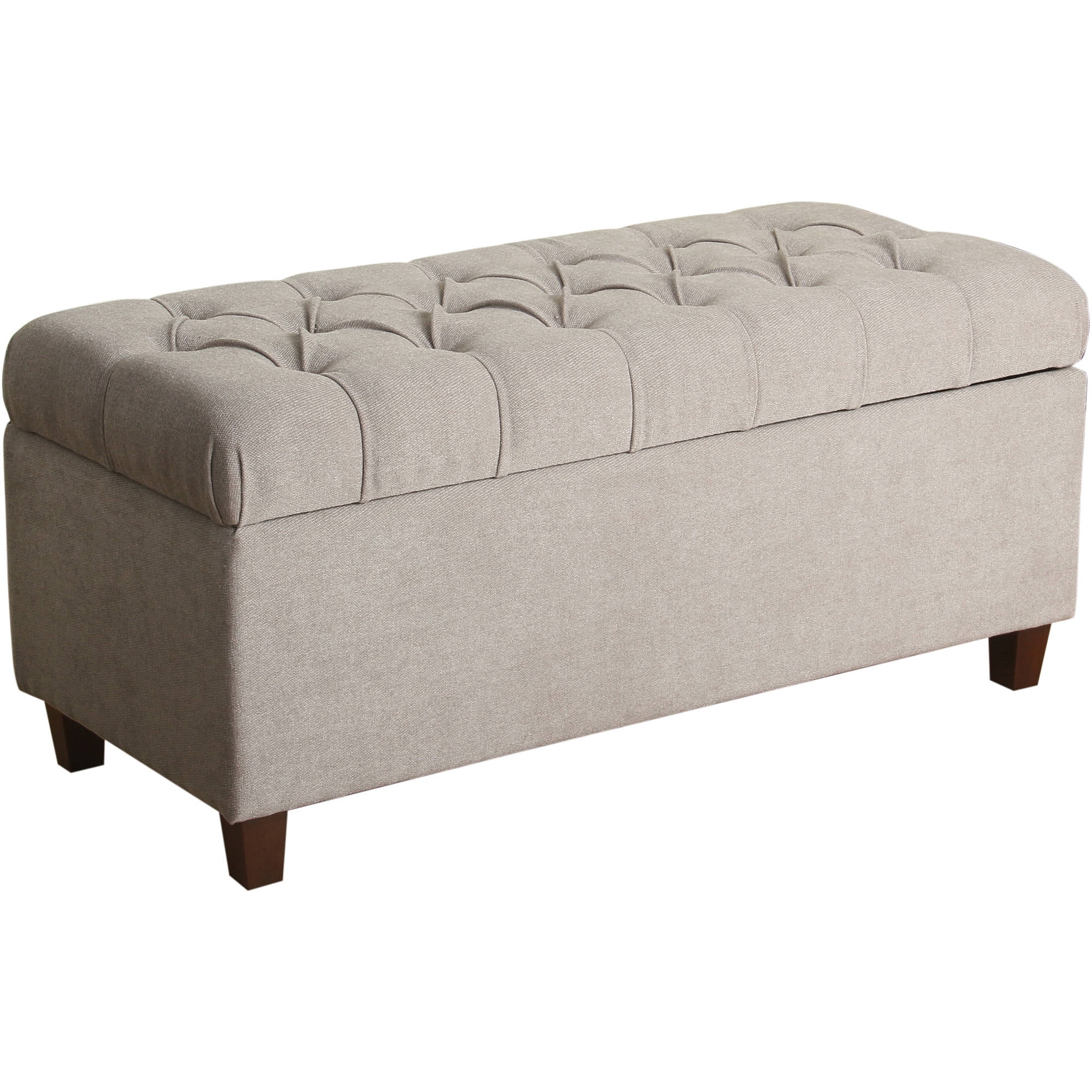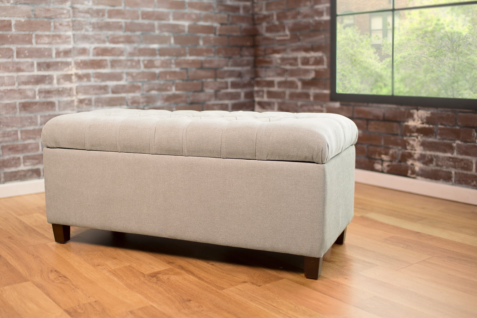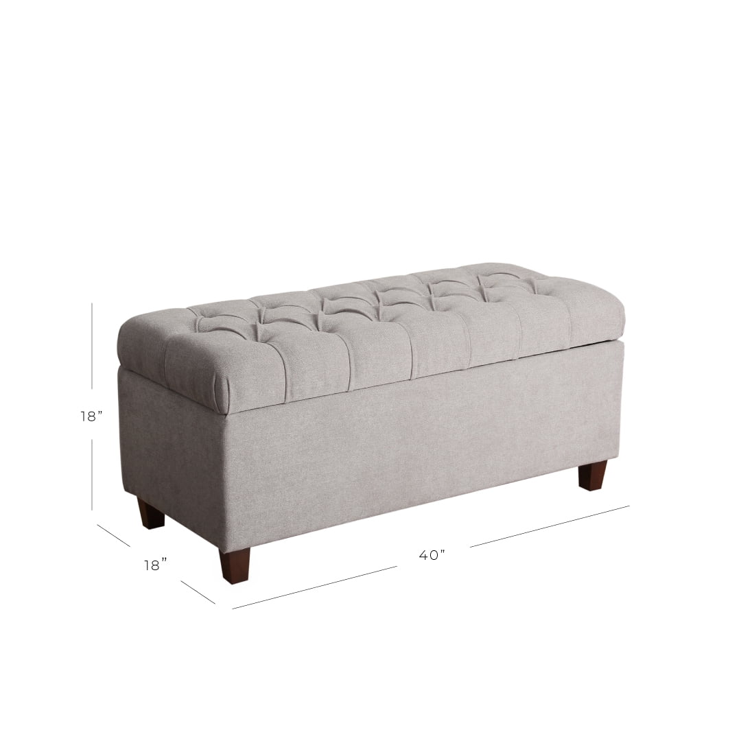 HomePop Ainsley Button-Tufted Storage Bench, Multiple Colors: 18″ seat height with storage Easy-access hinged lid Textured fabric Wood legs Easy assembly required Color options: brown, cream, dark gray, gray, light blue, off-white, red, Silver Ash, tan Neutral-colored fabric and dark finished legs for a stylish look Ainsley button-tufted storage bench helps keep clutter off the floor Can be used as a footrest, seat, coffee table, ottoman and much more A good choice for the living room, bedroom or entryway