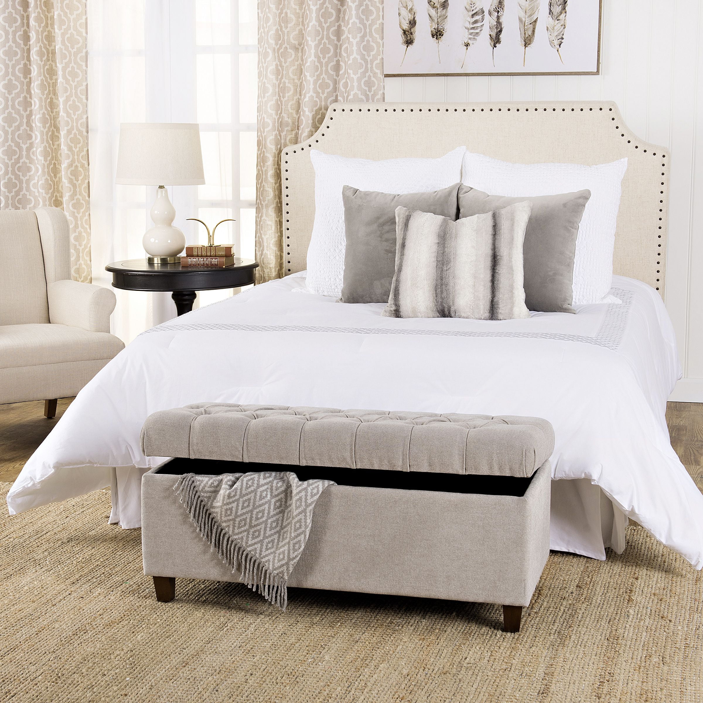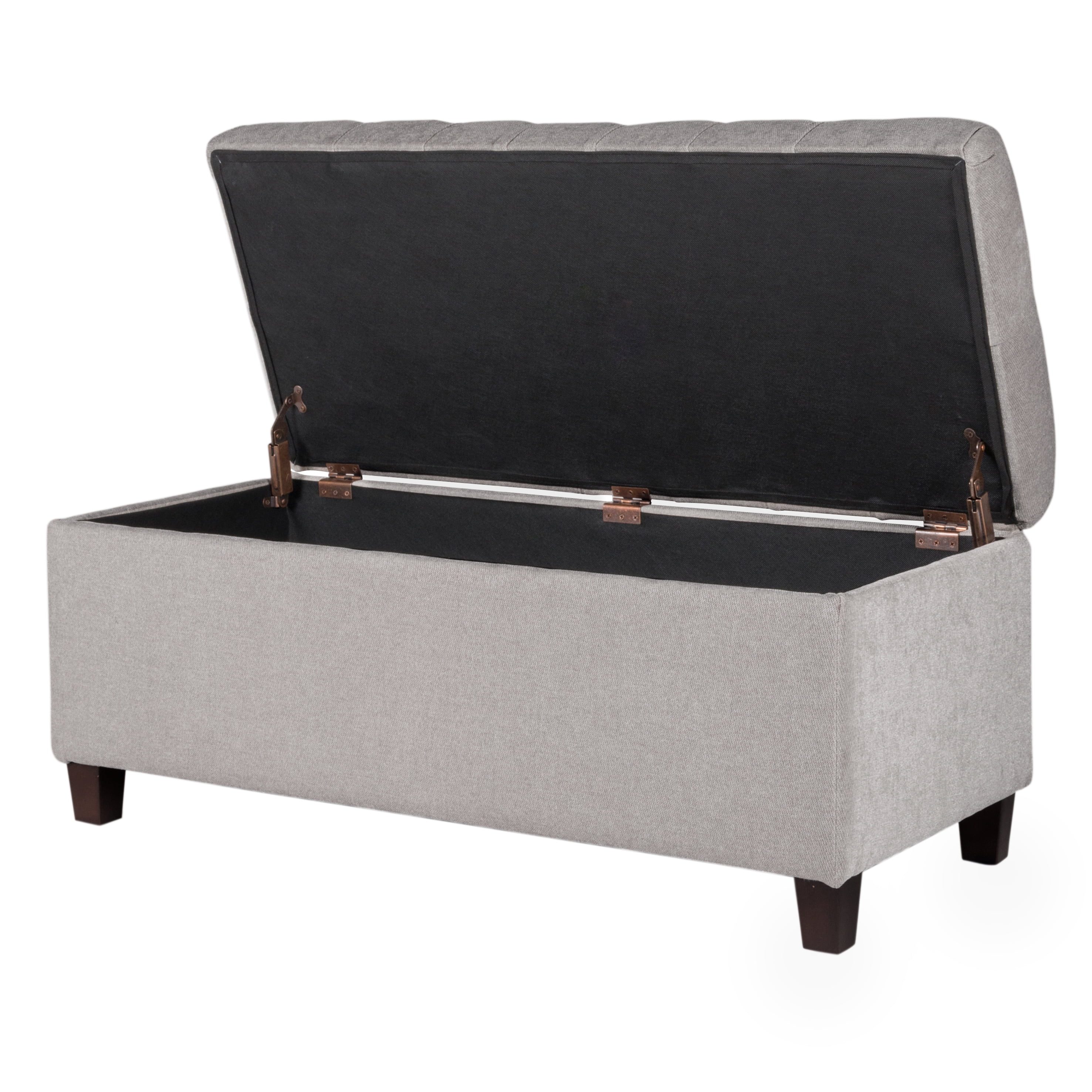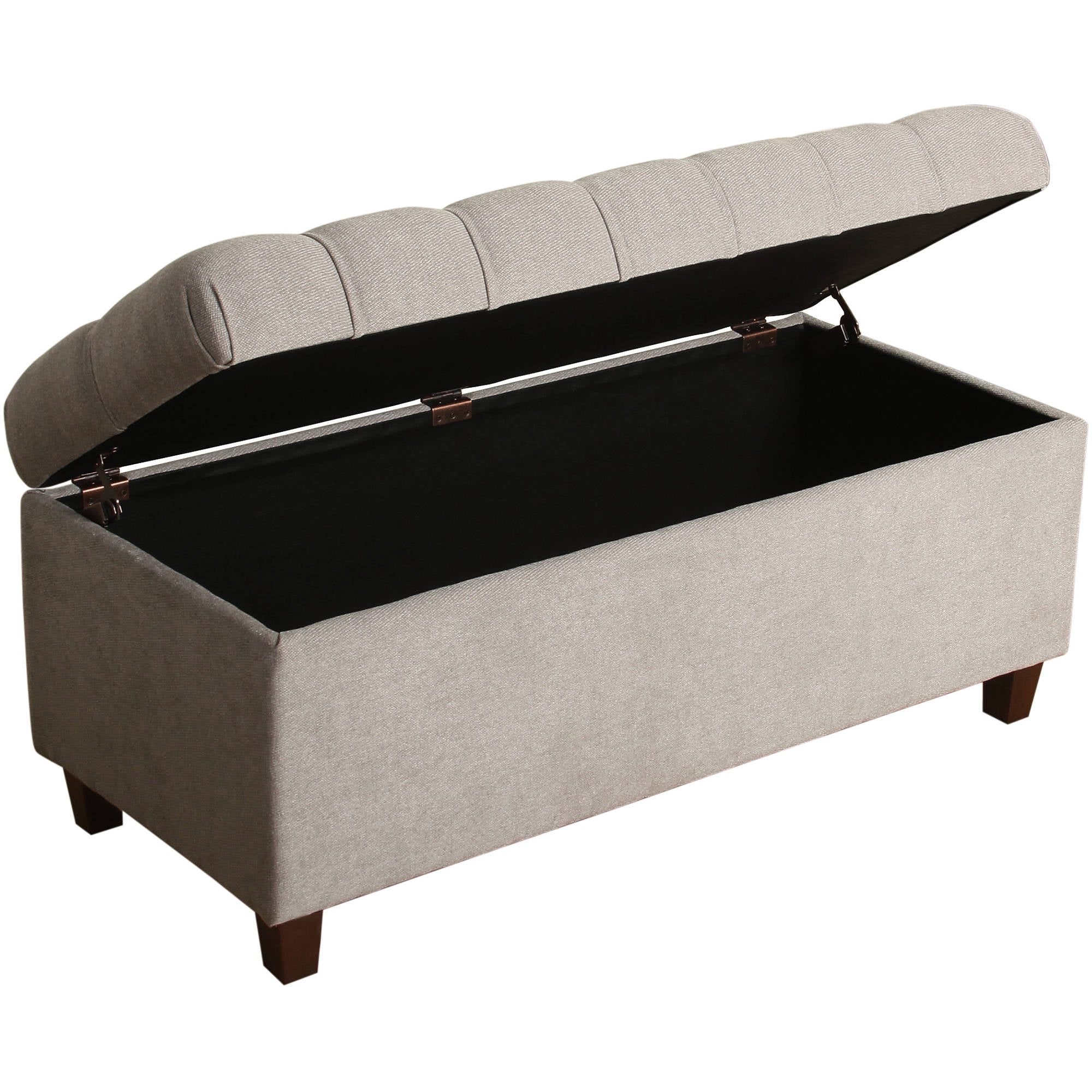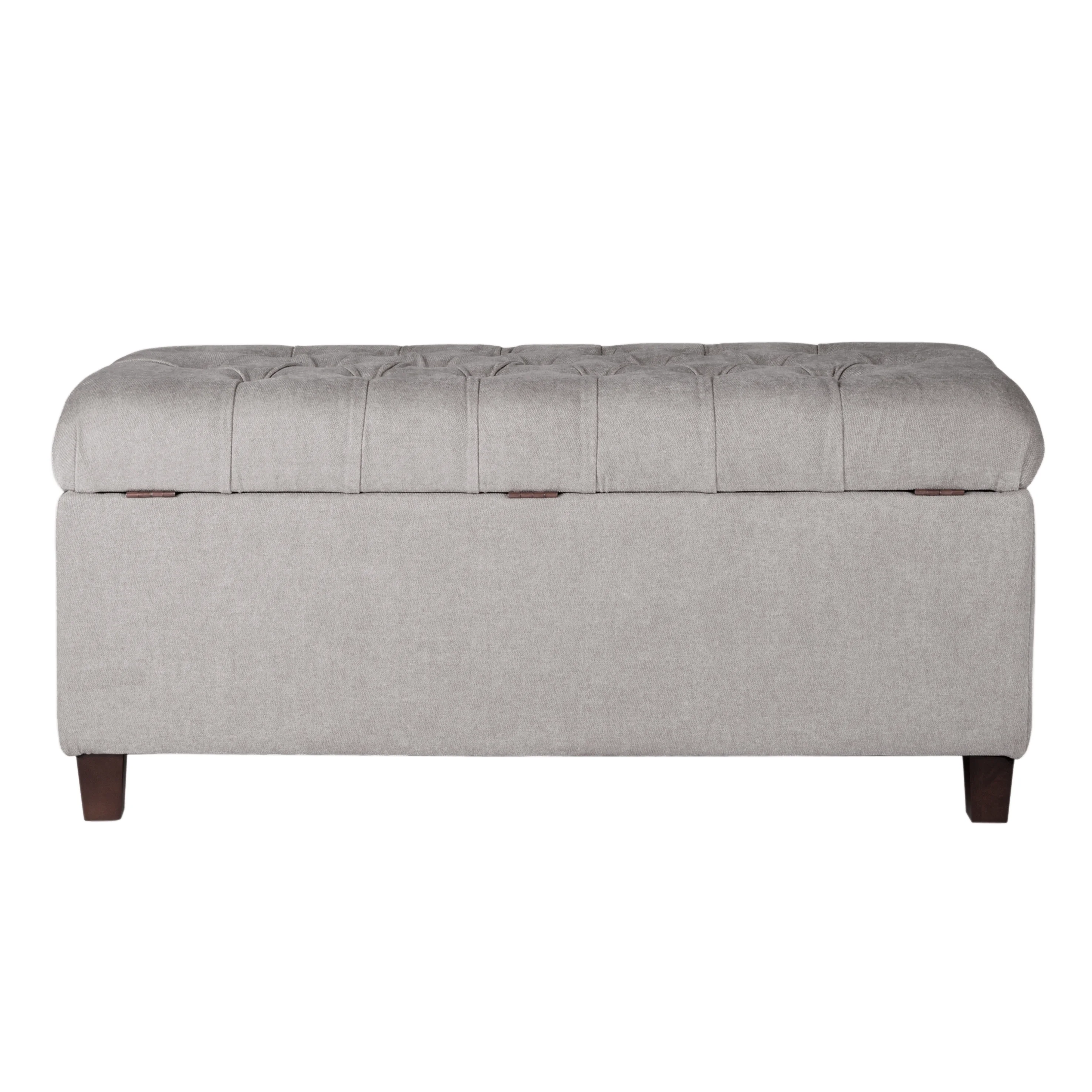 HomePop Ainsley Button-Tufted Storage Bench, Multiple Colors: 18″ seat height with storage Easy-access hinged lid Textured fabric Wood legs Easy assembly required Color options: brown, cream, dark gray, gray, light blue, off-white, red, Silver Ash, tan Neutral-colored fabric and dark finished legs for a stylish look Ainsley button-tufted storage bench helps keep clutter off the floor Can be used as a footrest, seat, coffee table, ottoman and much more A good choice for the living room, bedroom or entryway