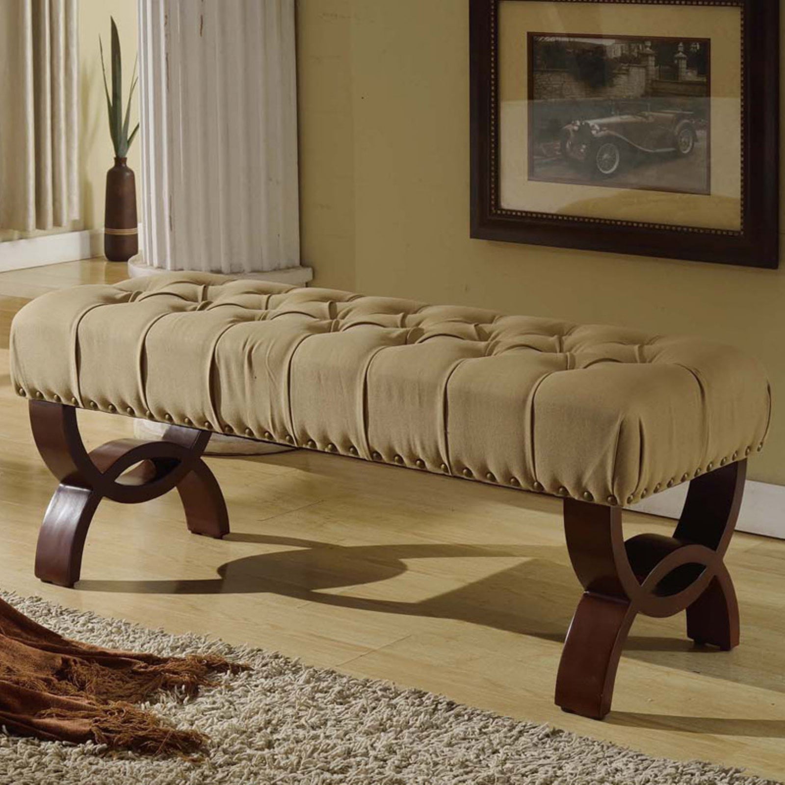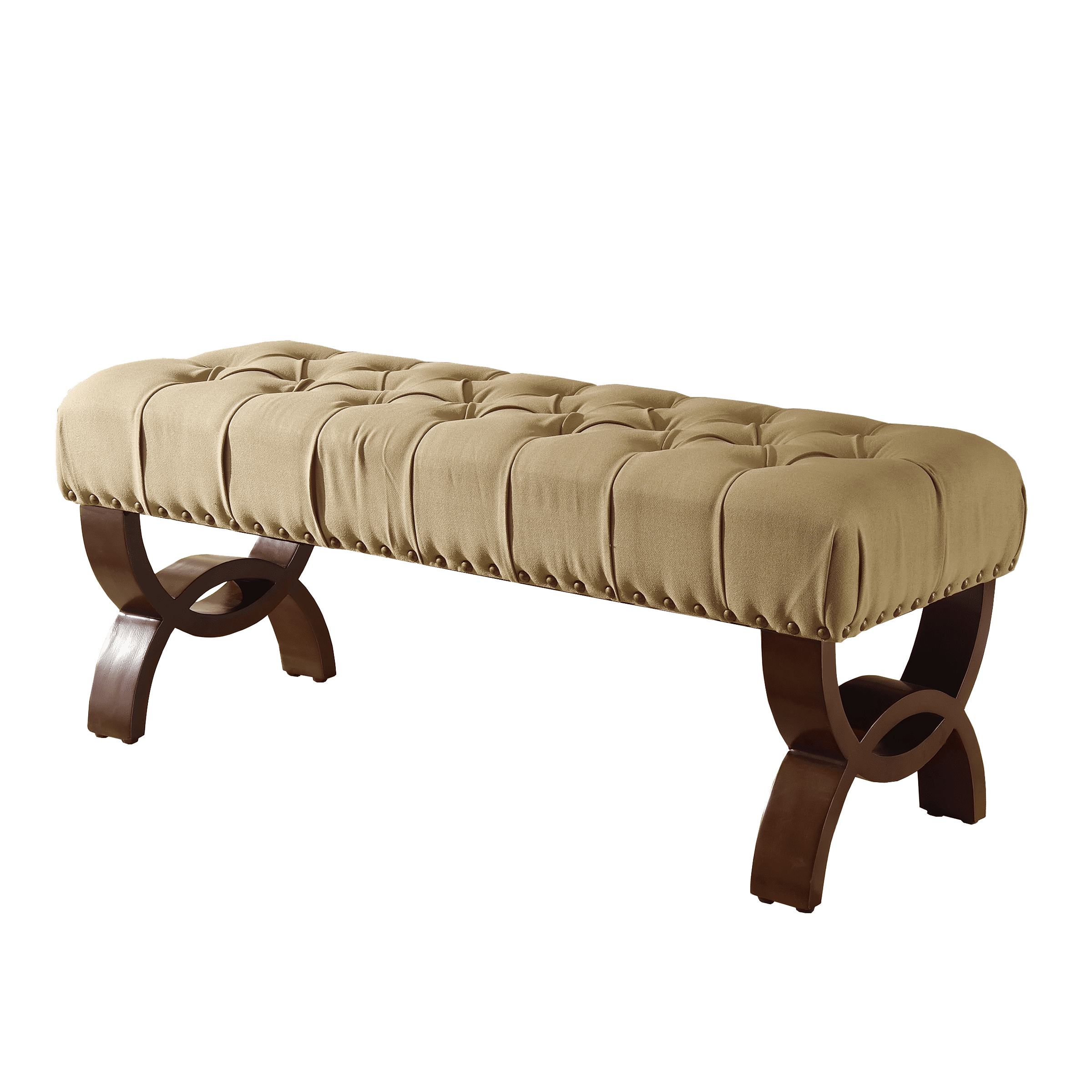 HomePop’s Carolina Tufted Bench with Nailhead Trim is elegant and substantial. With deep button tufting in a textured neutral fabric, this oversized decorative bench offers a wide range of design solutions. Use it as an impressive end of bed bench to hold pillows or blankets when not in use. Place it in a living room or use it as a dining room bench for extra seating. Carolina features solid wood legs of opposing half circles that intersect in a rich wood finish. Button tufting, nailhead trim and curved wood legs all add incredible detail to this easy investment for your home.