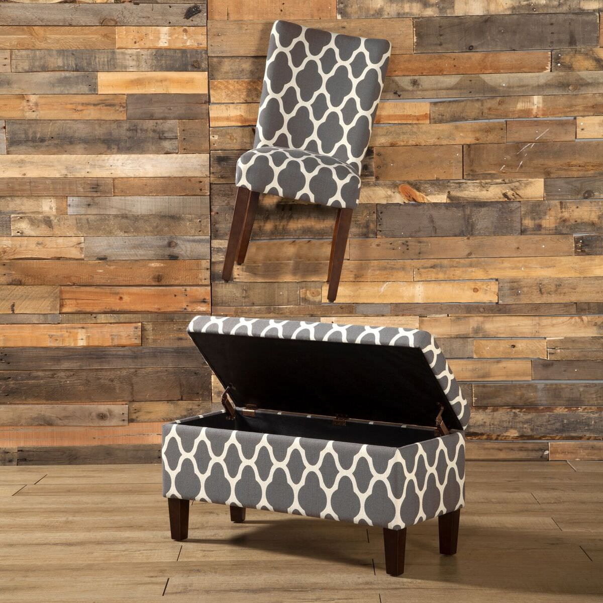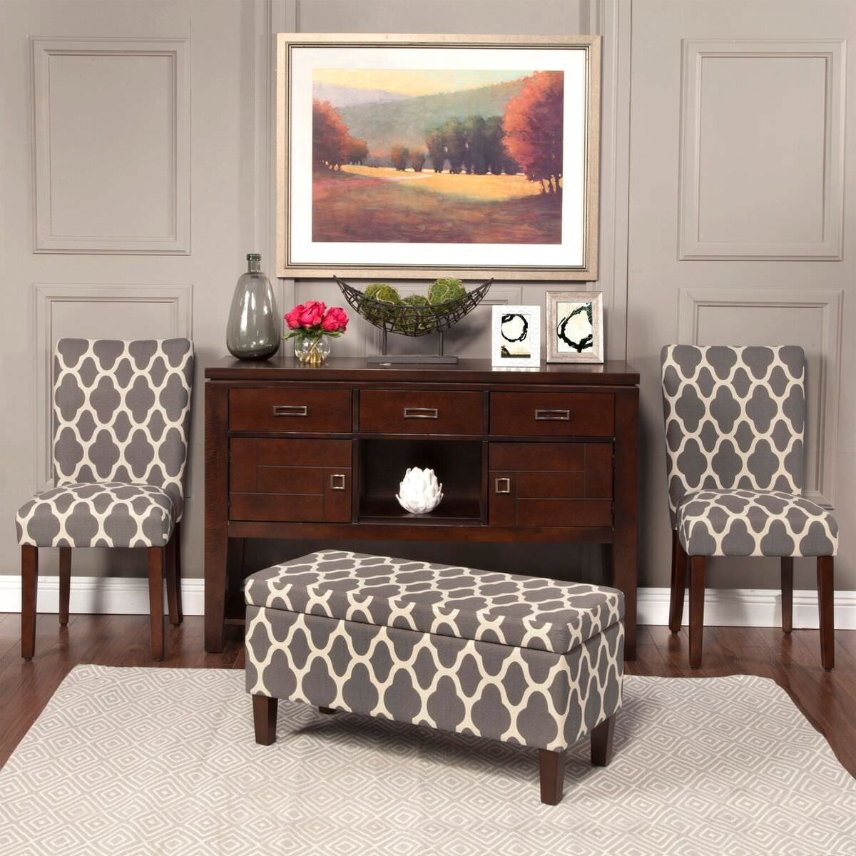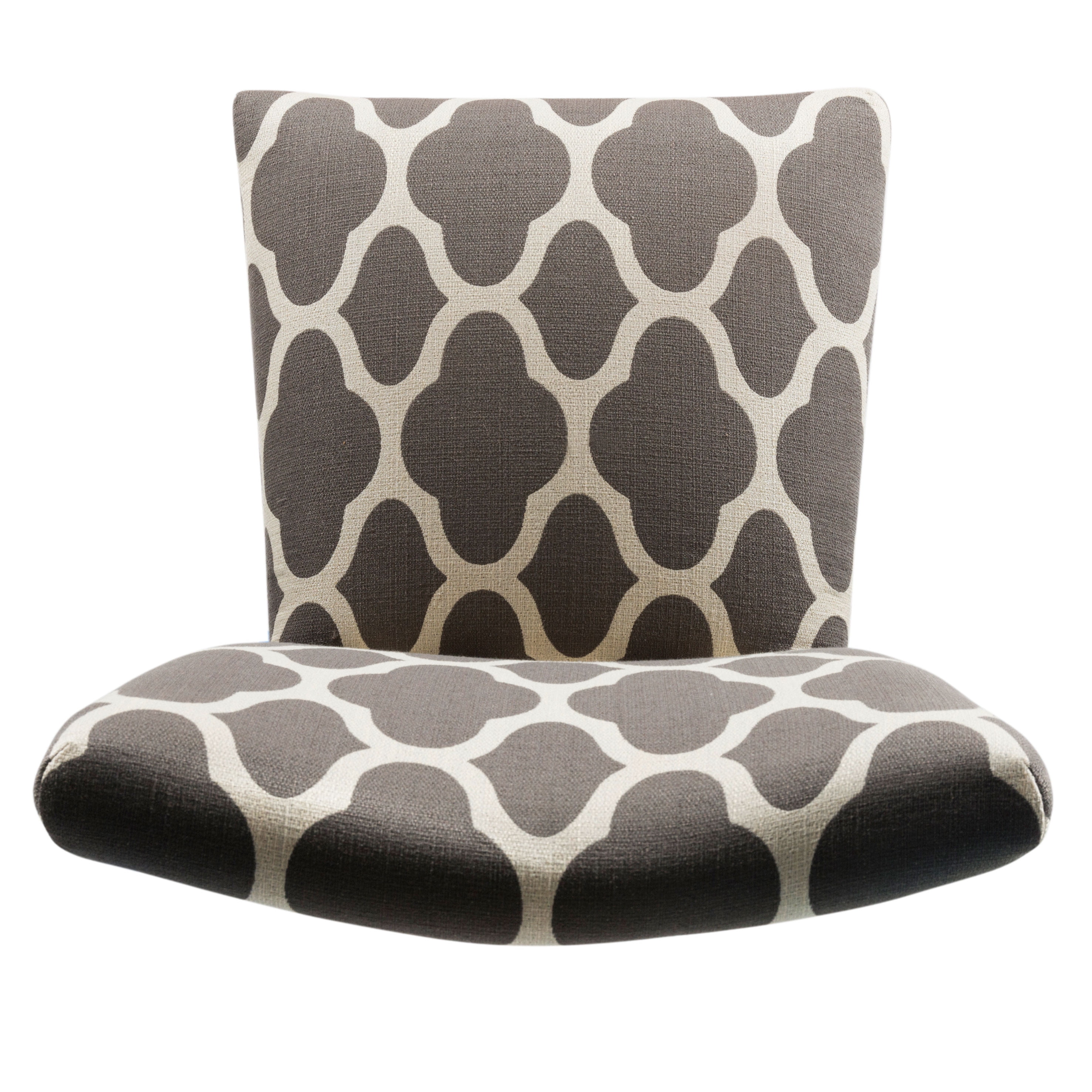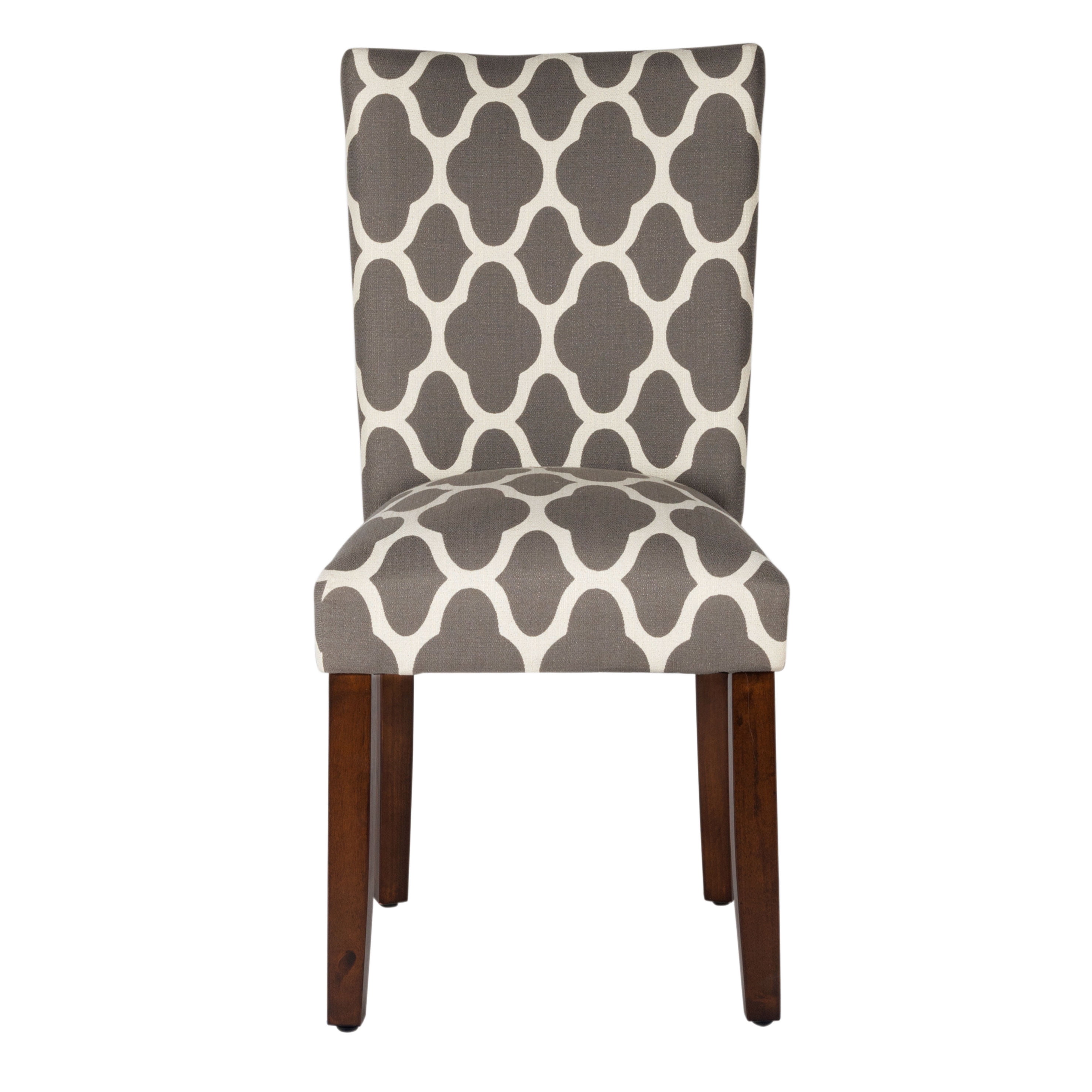 20.5 Inch Dining Chair Seat Height Medium Firm Cushion for Comfort and Durability Dark Gray and Cream Geometric Pattern Wood Legs with a Dark Walnut Finish Sold as a Set of 2 Dimensions: 38 inches high x 19 inches wide x 23.5 inches deep Seat Dimension: 19″W x 17.5″D Seat back height: 17.5″ Seat back width: 18″