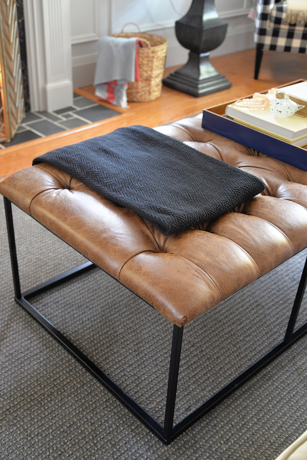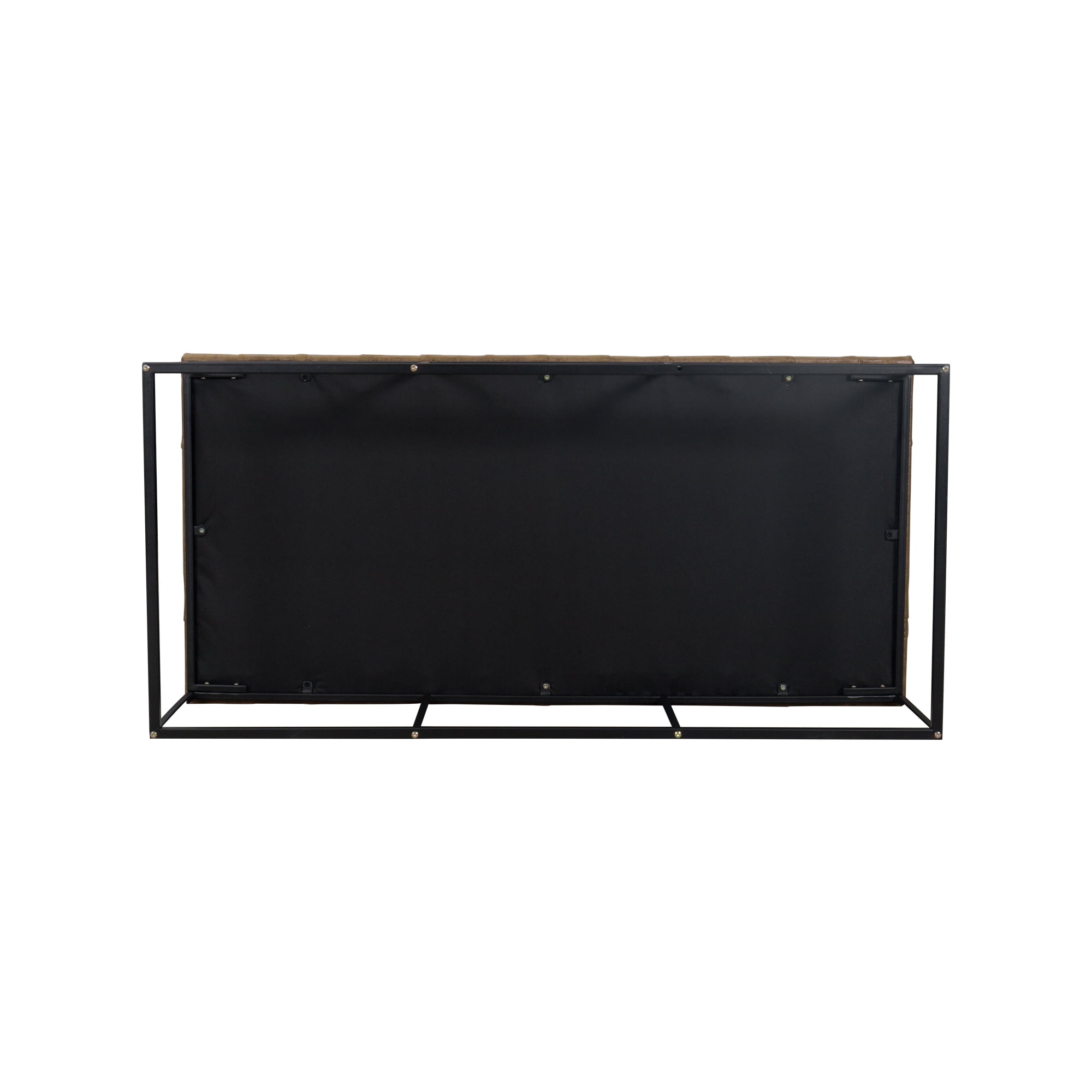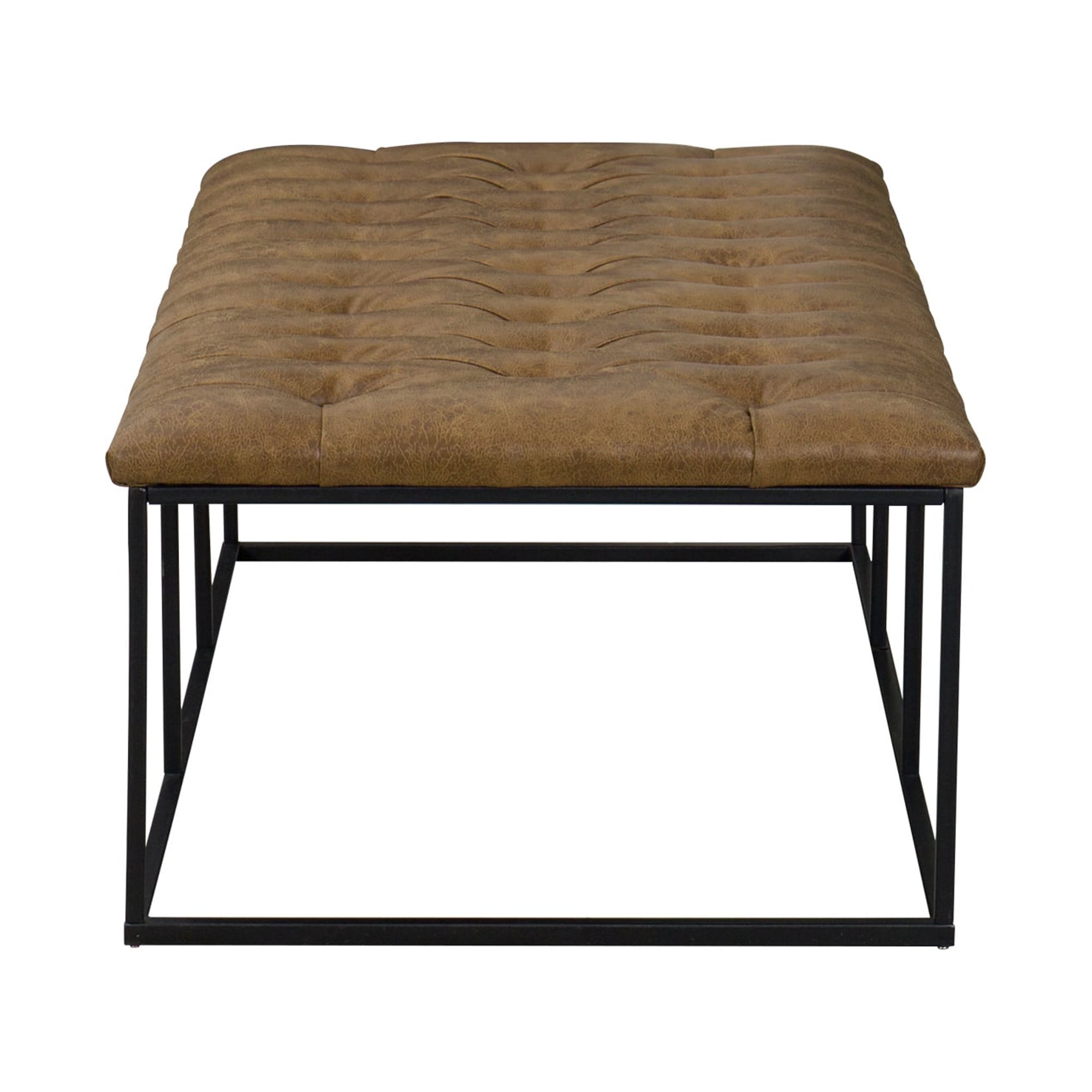 The Draper Large Ottoman exudes masculine style and can perform multiple functions in any home. Use it as a coffee table ottoman in the living room, as an end of bed bench in the bedroom, or as extra seating in the dining room or family room. This 58″ ottoman features an open metal frame that offers substantial size without overwhelming the space. The light brown faux leather button tufted top adds texture that contrasts well with the sleek black metal styling of the base. Easy to maintain with spot cleaning as needed.